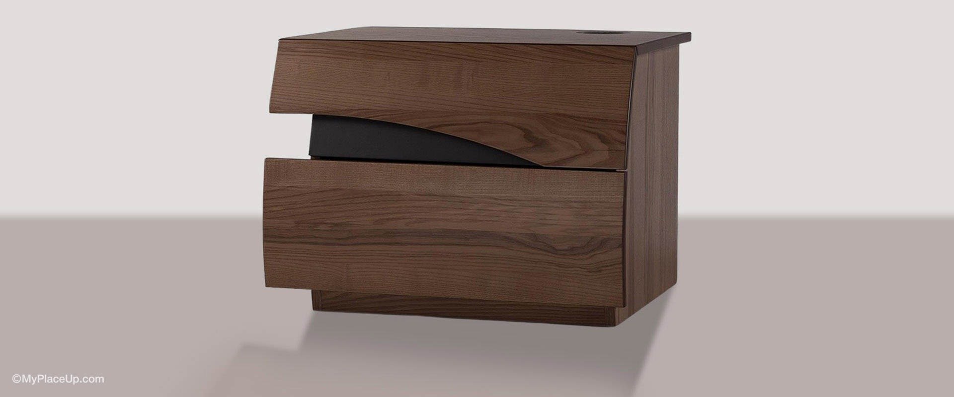 Κύριο χαρακτηριστικό του κομοδίνου αποτελούν, για ακόμη μια φορά, οι καμπύλες, που αντιπροσωπεύουν τη πολυτελή εμφάνιση της Σάρας Ελιάς. Το ιδιαίτερο υφασμάτινο πόμολο αναδεικνύει τη μοναδικότητα του δίνοντας έμφαση στη λεπτομέρεια.