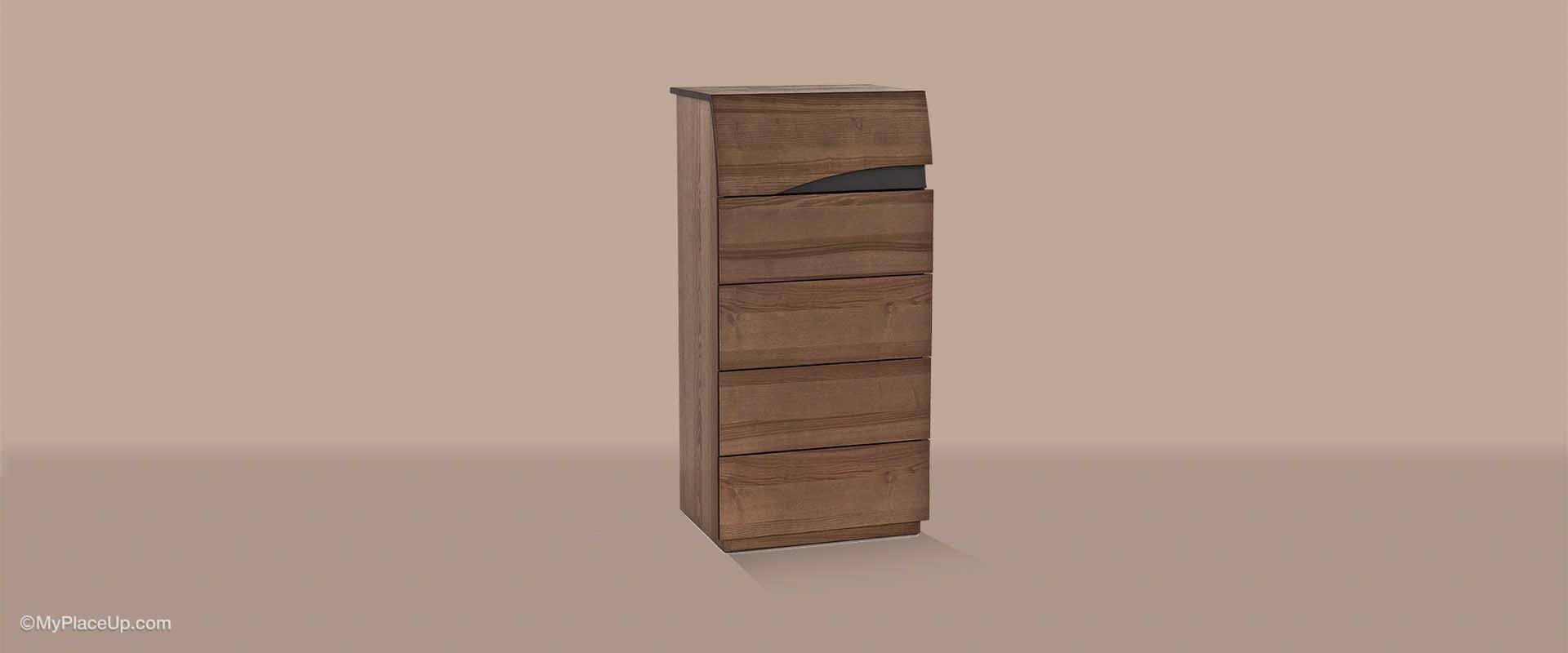Κύριο χαρακτηριστικό της συρταριέρας αποτελούν για ακόμη μια φορά οι καμπύλες που αντιπροσωπεύουν τη πολυτελή εμφάνιση της Σάρας Ελιάς. Το ιδιαίτερο υφασμάτινο πόμολο και η απαλή απόχρωση ξύλου που ντύνει τη συρταριέρα αναδεικνύει τη μοναδικότητα της και δίνουν έμφαση στη λεπτομέρεια.