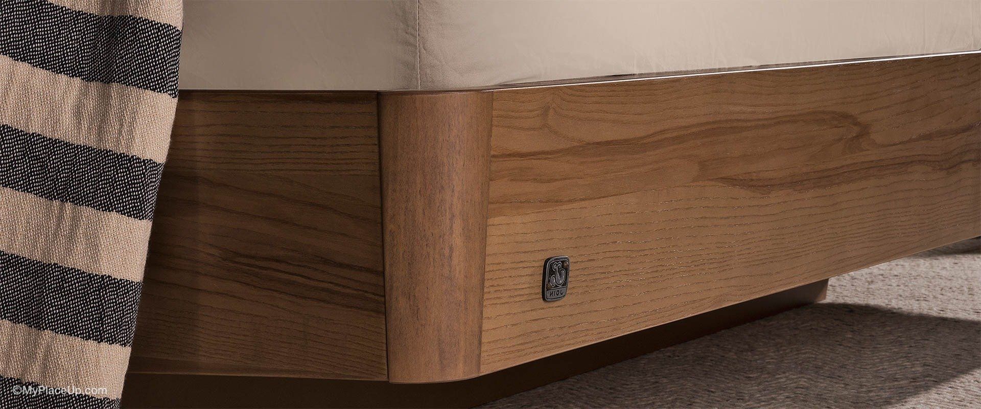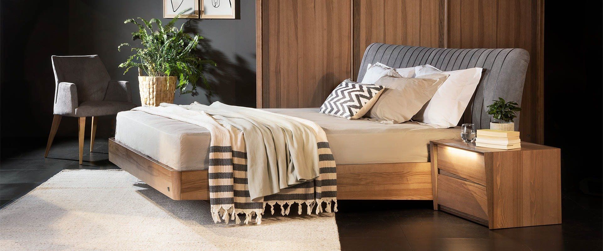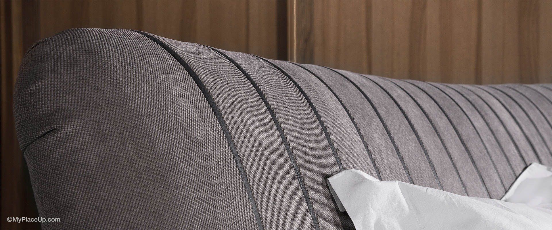 Η επιλογή φυσικών υλικών στη κατασκευή της εναρμονίζεται άρτια με το ντυμένο κεφαλάρι της, σε απόχρωση γκρι και τις ευδιάκριτες κάθετες ραφές του χαρίζοντας μια αίσθηση γαλήνης.