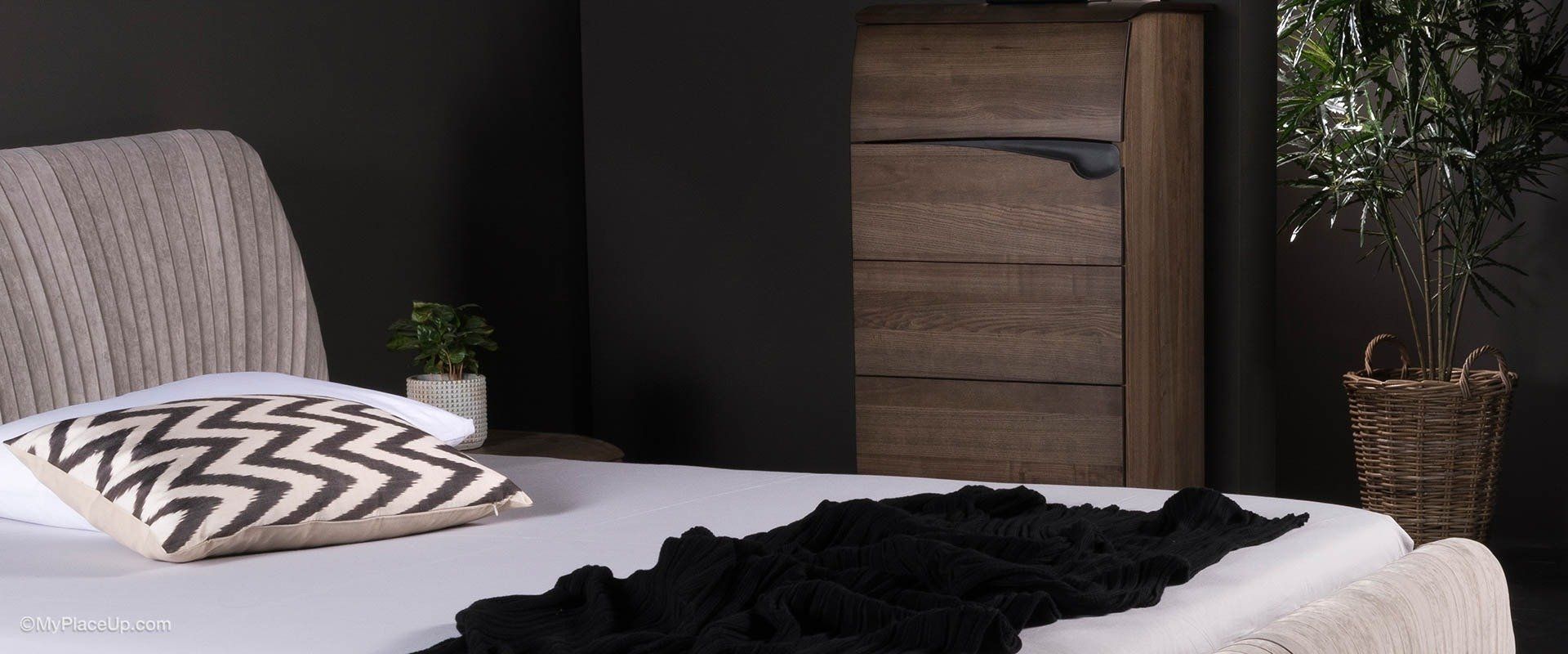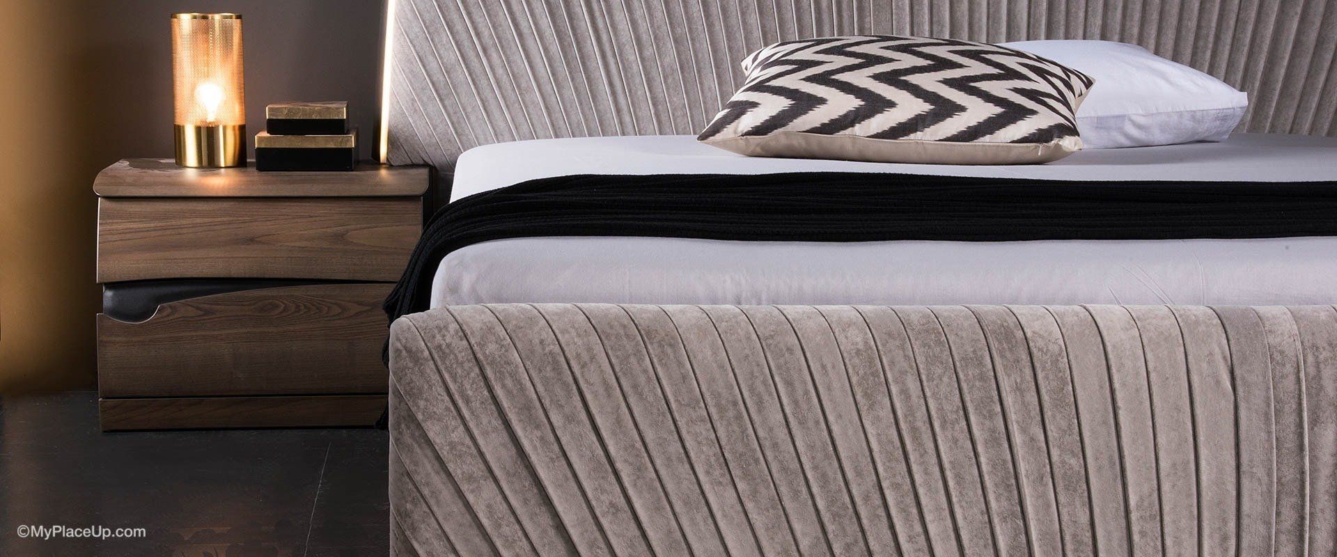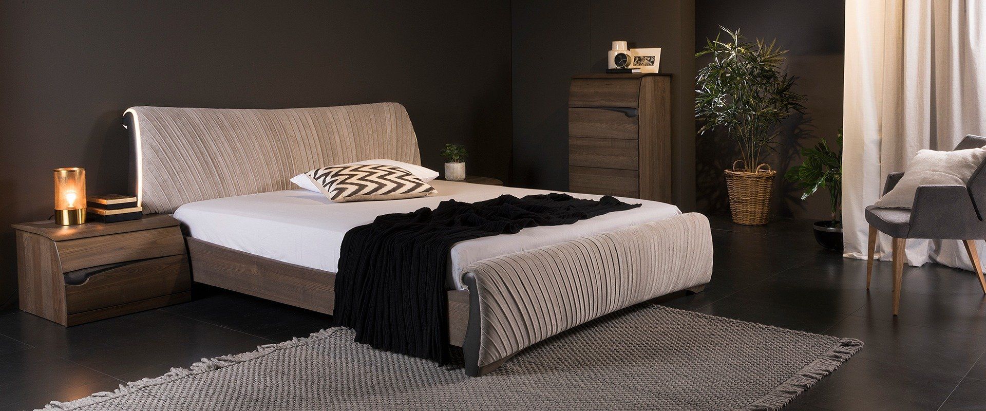 Μια ιδιαίτερη σύνθεση κρεβατοκάμαρας, που διακρίνεται για τις καμπύλες της και τις υφασμάτινες λεπτομέρειες στο κρεβάτι, προσφέρει μεγαλοπρέπεια στον χώρο σας.