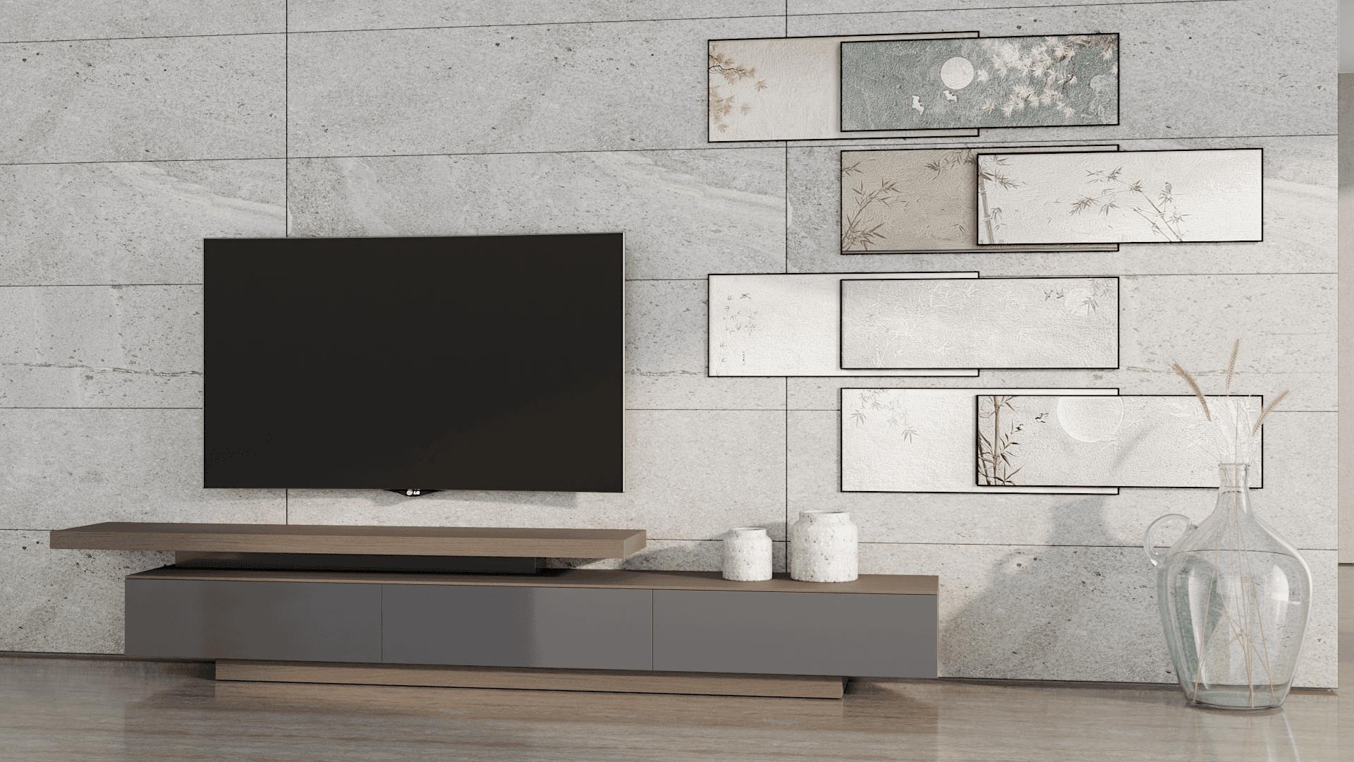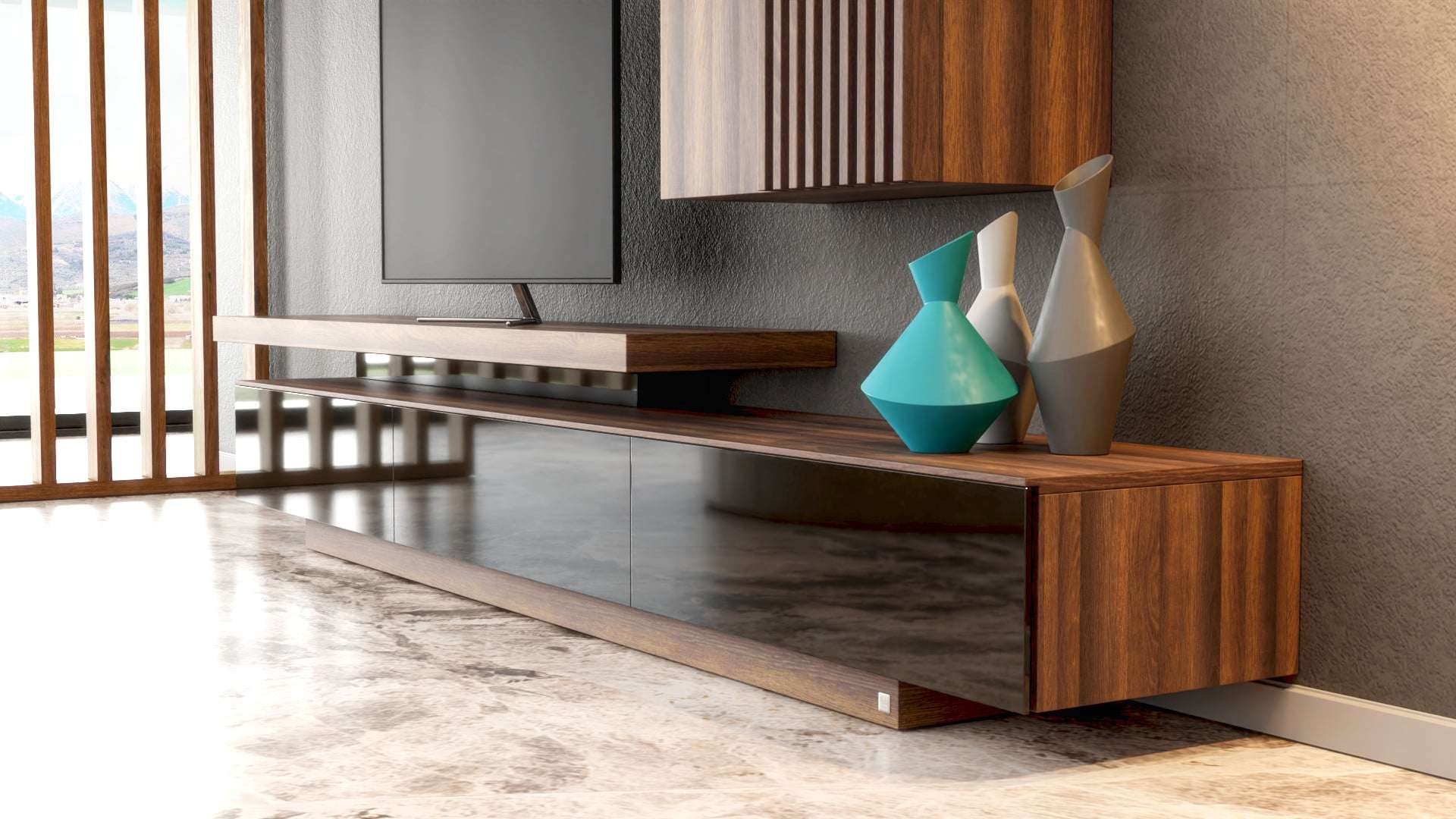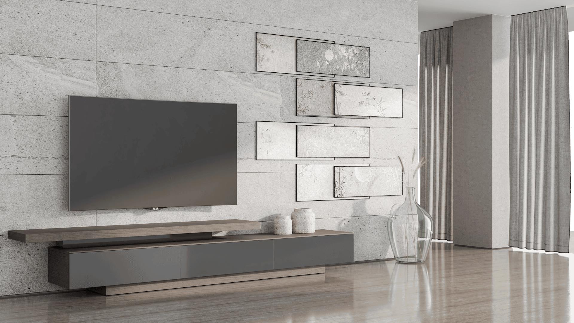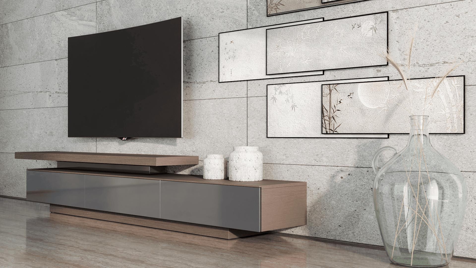 Ξύλο δρυς και λάκα σε ένα modern minimal σχέδιο με μεγάλο αποθηκευτικό χώρο. Το έπιπλο tv Sempre τo κατασκευάζουμε σε διαστάσεις, ξύλο και χρώμα λάκας προσαρμοσμένα στην αρχιτεκτονική του χώρου σας.