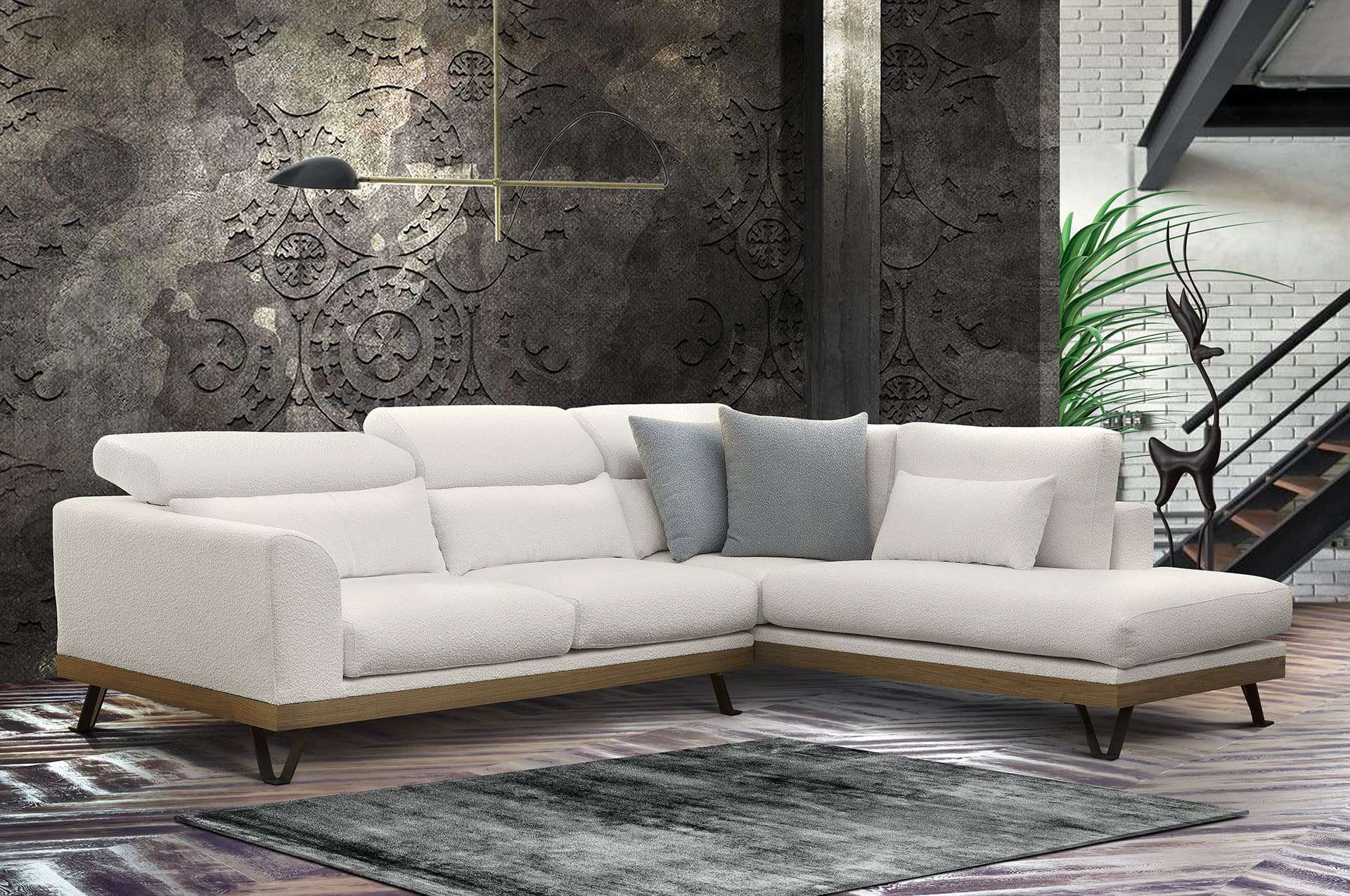Γωνιακός καναπές 2 τεμαχίων, με λάστιχο υψηλής ποιότητας στο κάθισμα, ξύλινη επένδυση στην μπάζα και ψηλά μεταλλικά πόδια. Διατίθεται σε διάφορες διαστάσεις, με ύφασμα & απόχρωση υφάσματος της επιλογής σας όπως και αποχρώσεις ξύλου.
