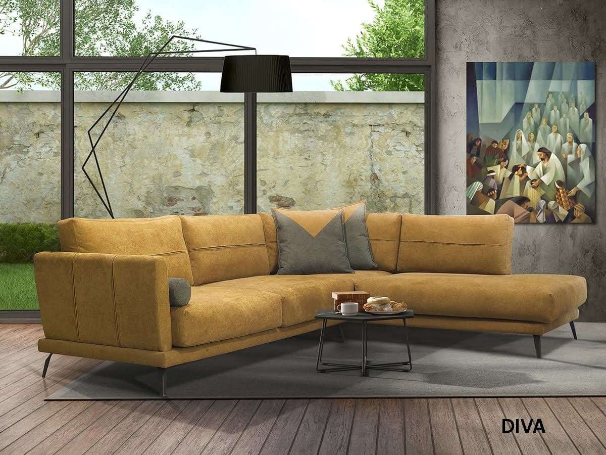 Γωνιακός καναπές Diva Ελληνικής κατασκευής. Διάσταση: 280cm x 220cm x 90cm Τα μαξιλάρια καθίσματος κατασκευάζονται από αφρό πολυουρεθάνης μέτριας σκληρότητας ενώ τα μαξιλάρια πλάτης είναι γεμισμένα με πολυεστερικές ίνες (conforel). Ο σκελετός του καναπέ είναι κατασκευασμένος από μασίφ ξυλεία (οξιά & λευκή ξυλεία) ενώ τη στήριξη των μαξιλαριών αναλαμβάνουν οι πυκνά τοποθετημένοι & πλεγμένοι ελαστικοί ιμάντες (φάσες). Το ψηλό πόδι , αποτρέπει το λέρωμα της βάσης του καναπέ από παπούτσια ενώ η απόσταση από το πάτωμα μας δίνει τη δυνατότητα να καθαρίζουμε εύκολα & γρήγορα κάτω από αυτόν. Διατίθεται σε διάφορες διαστάσεις, με ύφασμα & απόχρωση υφάσματος της επιλογής σας. Κατηγορία υφάσματος: αδιάβροχο - easy clean Δυνατότητα αλλαγών.