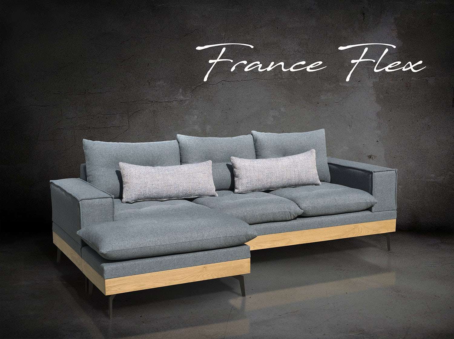 Γωνιακός καναπές France flex. Ελληνικής κατασκευής Διάσταση: 230cm x 180cm x 95cm Τα μαξιλάρια καθίσματος κατασκευάζονται από αφρό πολυουρεθάνης μέτριας σκληρότητας ενώ τα μαξιλάρια πλάτης είναι γεμισμένα με πολυεστερικές ίνες (conforel). Ο σκελετός του καναπέ είναι κατασκευασμένος από μασίφ ξυλεία (οξιά & λευκή ξυλεία) ενώ τη στήριξη των μαξιλαριών αναλαμβάνουν οι πυκνά τοποθετημένοι & πλεγμένοι ελαστικοί ιμάντες (φάσες). Το ψηλό πόδι , αποτρέπει το λέρωμα της βάσης του καναπέ από παπούτσια ενώ η απόσταση από το πάτωμα μας δίνει τη δυνατότητα να καθαρίζουμε εύκολα & γρήγορα κάτω από αυτόν. Διατίθεται σε διάφορες διαστάσεις, με ύφασμα & απόχρωση υφάσματος της επιλογής σας. Επιλογή χρώματος στις ξύλινες διακοσμητικές επιφάνειες του καναπέ με την επιπλέον επιλογή να κατασκευαστεί χωρίς ξύλο Κατηγορία υφάσματος: αδιάβροχο - easy clean Δυνατότητα αλλαγών.