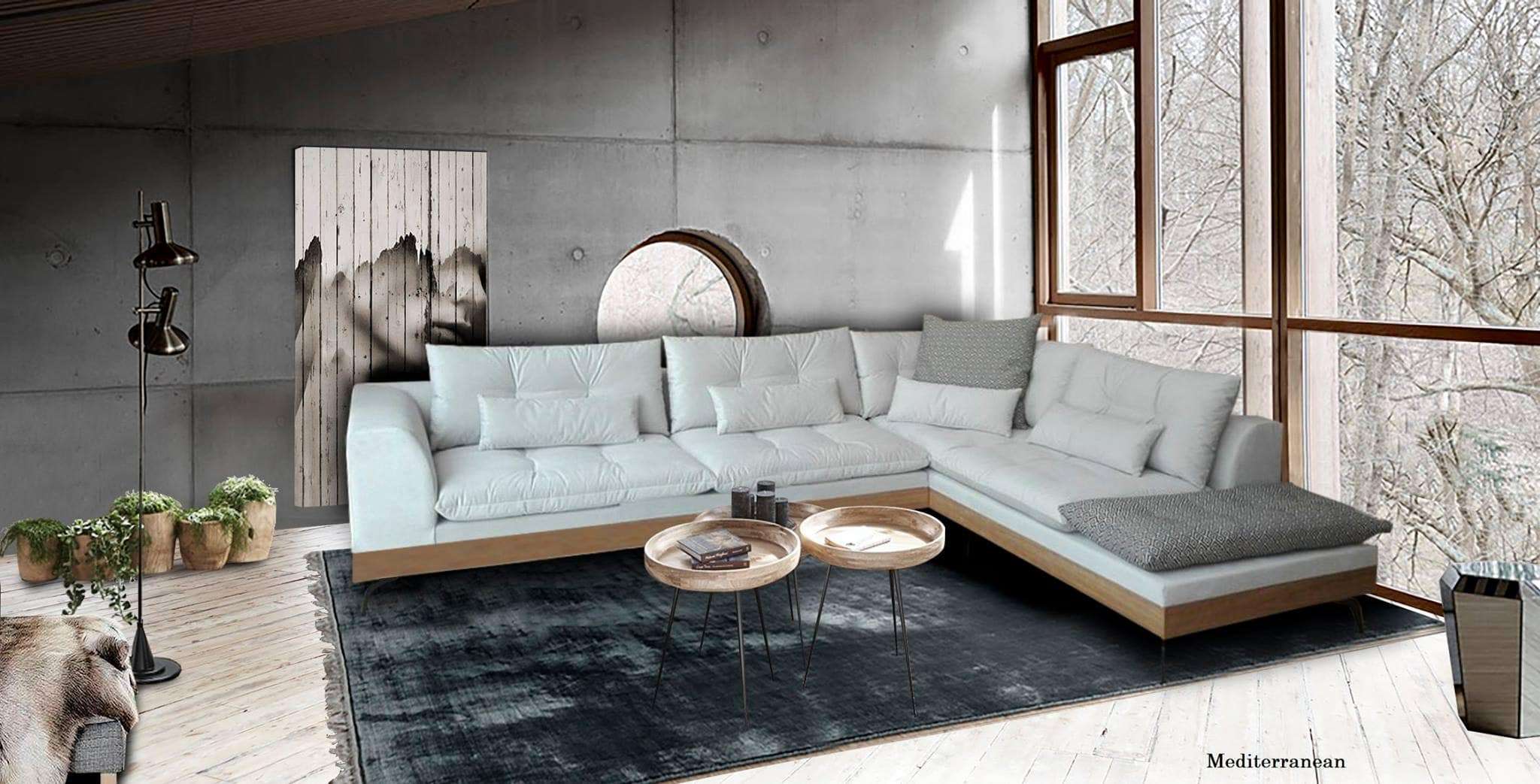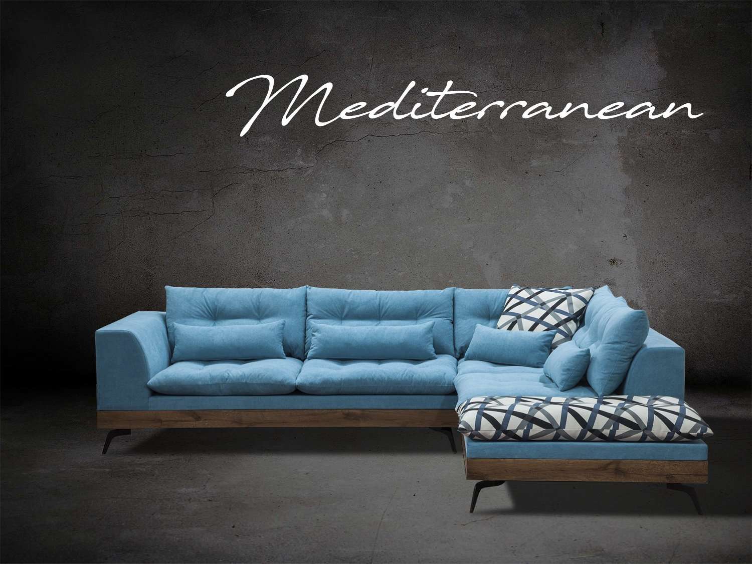 Γωνιακός καναπές Mediterranean. Ελληνικής κατασκευής. Διάσταση: 280cm x 220cm x 100cm Τα μαξιλάρια καθίσματος κατασκευάζονται από αφρό πολυουρεθάνης μέτριας σκληρότητας ενώ τα μαξιλάρια πλάτης είναι γεμισμένα με πολυεστερικές ίνες (conforel). Ο σκελετός του καναπέ είναι κατασκευασμένος από μασίφ ξυλεία (οξιά & λευκή ξυλεία) ενώ τη στήριξη των μαξιλαριών αναλαμβάνουν οι πυκνά τοποθετημένοι & πλεγμένοι ελαστικοί ιμάντες (φάσες). Το ψηλό πόδι , αποτρέπει το λέρωμα της βάσης του καναπέ από παπούτσια ενώ η απόσταση από το πάτωμα μας δίνει τη δυνατότητα να καθαρίζουμε εύκολα & γρήγορα κάτω από αυτόν. Διατίθεται σε διάφορες διαστάσεις, με ύφασμα & απόχρωση υφάσματος της επιλογής σας. Επιλογή χρώματος στις ξύλινες διακοσμητικές επιφάνειες του καναπέ με την επιπλέον επιλογή να κατασκευαστεί χωρίς ξύλο Κατηγορία υφάσματος: αδιάβροχο - easy clean Δυνατότητα αλλαγών.