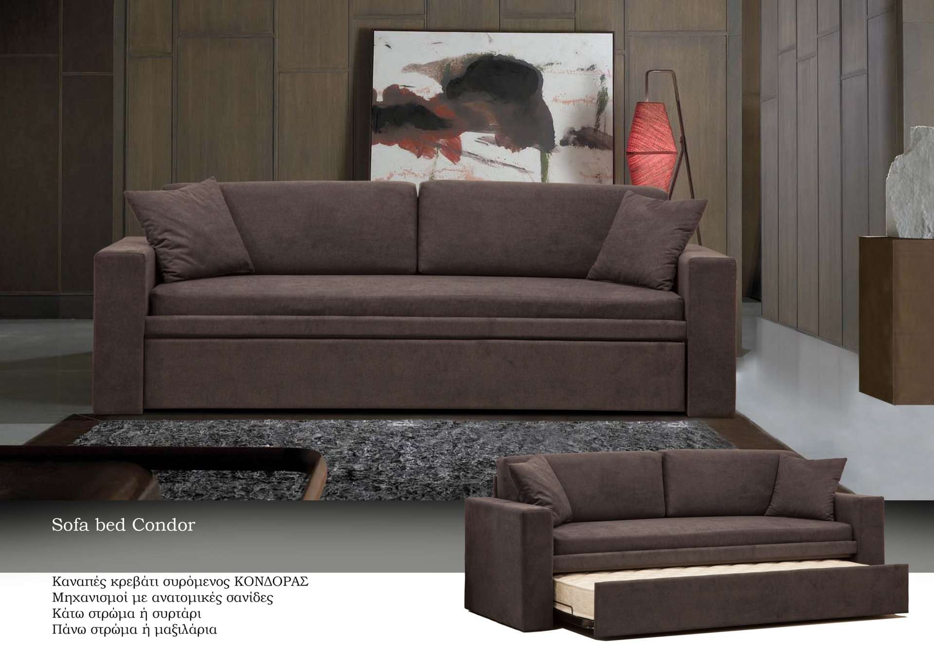 Καναπές κρεβάτι Κόνδορας Ελληνικής Κατασκευής. Διαστάσεις: 202 - 218 cm x 87cm ( 73cm πλάτη) Κάτω στρώμα ή συρτάρι Πάνω στρώμα ή μαξιλάρια Δυνατότητα Αλλαγών.