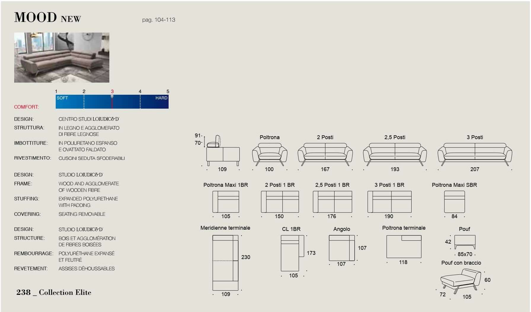 Καναπές Mood δέρμα Ιταλίας Made in Italy Διαστάσεις (cm): Γωνία 299 x 230 x 109 - Τριθέσιος: 207 x 109 - Διθέσιος: 167 x 109 Κατηγορία δέρματος: Cat.400 πάχος 1,5 - 1,6mm Τα μαξιλάρια καθίσματος κατασκευάζονται από αφρό πολυουρεθάνης μέτριας προς μαλακής σκληρότητας ενώ τα μαξιλάρια πλάτης είναι γεμισμένα με πολυεστερικές ίνες (conforel). Ο σκελετός του καναπέ είναι κατασκευασμένος από μασίφ ξυλεία (οξιά & λευκή ξυλεία) ενώ τη στήριξη των μαξιλαριών αναλαμβάνουν οι πυκνά τοποθετημένοι & πλεγμένοι ελαστικοί ιμάντες (φάσες). Το ψηλό πόδι , αποτρέπει το λέρωμα της βάσης του καναπέ από παπούτσια ενώ η απόσταση από το πάτωμα μας δίνει τη δυνατότητα να καθαρίζουμε εύκολα & γρήγορα κάτω από αυτόν. Διατίθεται σε διάφορες διαστάσεις, με δέρμα ή ύφασμα της επιλογής σας. Για δυνατότητες αλλαγών επικοινωνήστε μαζί μας.