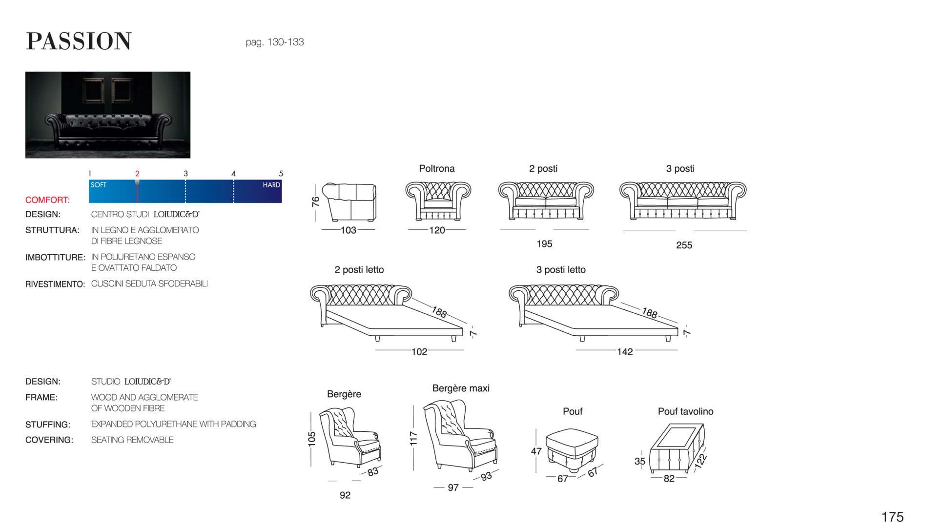 Καναπές Passion δέρμα Ιταλίας. Made in Italy Διαστάσεις (cm): Τριθέσιος: 255 x 103 x 76 - Διθέσιος: 195 x 103 x 76 Κατηγορία δέρματος: Cat.400 πάχος 1,5 – 1,6mm Τα μαξιλάρια καθίσματος κατασκευάζονται από αφρό πολυουρεθάνης μέτριας προς μαλακής σκληρότητας ενώ τα μαξιλάρια πλάτης είναι γεμισμένα με πολυεστερικές ίνες (conforel). Ο σκελετός του καναπέ είναι κατασκευασμένος από μασίφ ξυλεία (οξιά & λευκή ξυλεία) ενώ τη στήριξη των μαξιλαριών αναλαμβάνουν οι πυκνά τοποθετημένοι & πλεγμένοι ελαστικοί ιμάντες (φάσες). Διατίθεται σε διάφορες διαστάσεις και παραλλαγές με γνήσιο δέρμα ή με ύφασμά της επιλογής σας. Για δυνατότητες αλλαγών επικοινωνήστε μαζί μας.