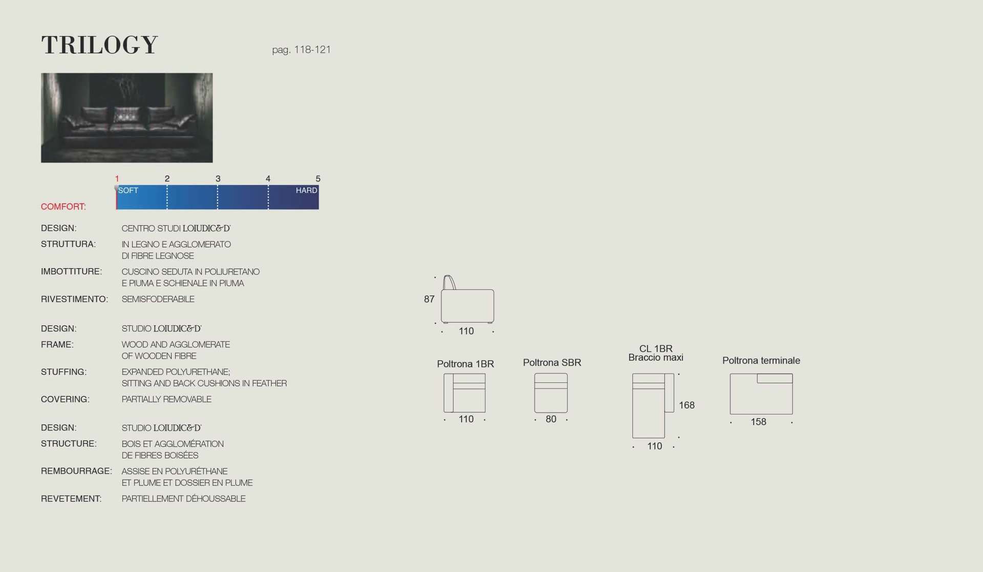 Καναπές Trilogy δέρμα Ιταλίας. Made in Italy Διαστάσεις (cm): Τριθέσιος: 300 x 110 x 87 - Γωνία: 300 x 168 x 87 Κατηγορία δέρματος: Cat.400 πάχος 1,5 – 1,6mm Τα μαξιλάρια καθίσματος κατασκευάζονται από αφρό πολυουρεθάνης μέτριας προς μαλακής σκληρότητας ενώ τα μαξιλάρια πλάτης είναι γεμισμένα με πολυεστερικές ίνες (conforel). Ο σκελετός του καναπέ είναι κατασκευασμένος από μασίφ ξυλεία (οξιά & λευκή ξυλεία) ενώ τη στήριξη των μαξιλαριών αναλαμβάνουν οι πυκνά τοποθετημένοι & πλεγμένοι ελαστικοί ιμάντες (φάσες). Διατίθεται σε διάφορες διαστάσεις και παραλλαγές με γνήσιο δέρμα ή με ύφασμά της επιλογής σας. Για δυνατότητες αλλαγών επικοινωνήστε μαζί μας.