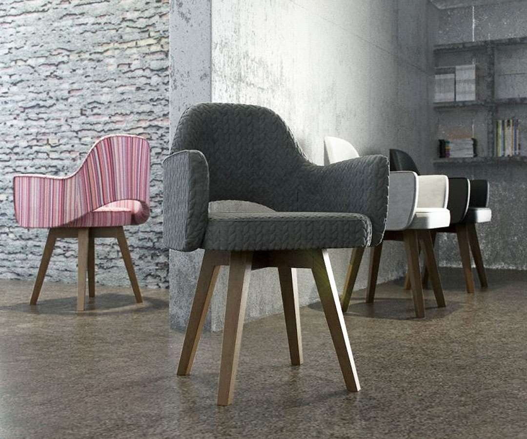 Άνετη, εύχρηστη και λειτουργική καρεκλοπολυθρόνα με elegant μοντέρνο σχέδιο. Μεταμορφώνεται σε εντελώς διαφορετική καρέκλα ανάλογα με το ύφασμα που είναι επενδεδυμένη. Εξαιρετική διακοσμητική νότα όταν τοποθετούνται με διαφορετικά υφάσματα στον ίδιο χώρο. Την κατασκευάζουμε με μεταλλικά ή ξύλινα πόδια, με ένα ύφασμα ή συνδυασμό δύο υφασμάτων και χρώματα επιλογής σας.