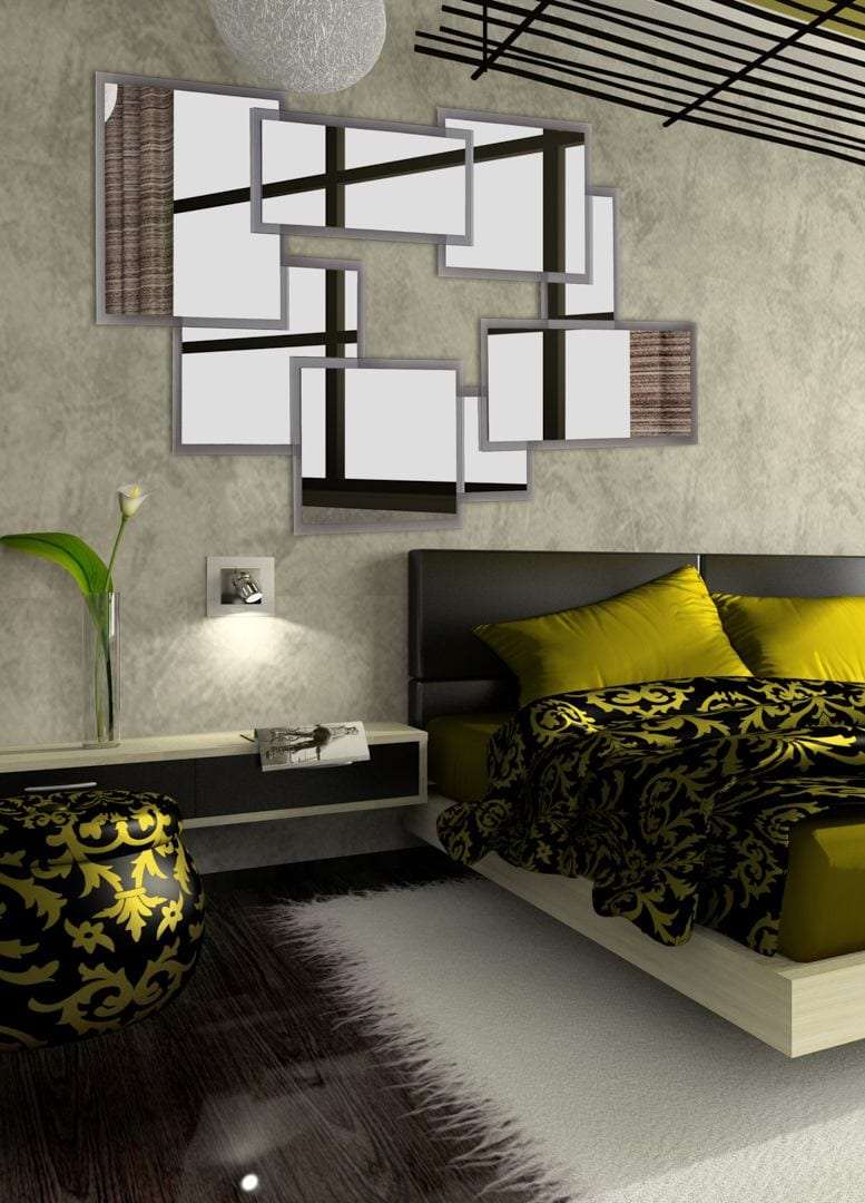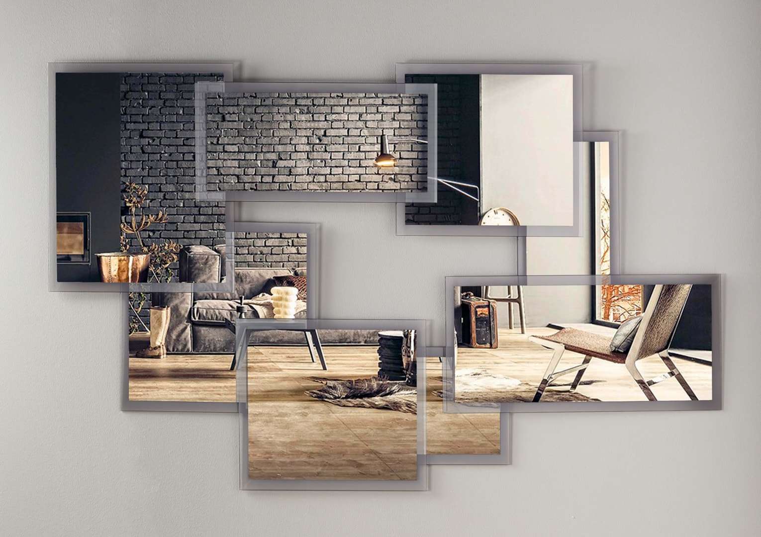 Καθρέφτης διακοσμητικός σε σχήμα παραλληλόγραμμο με ιδιαίτερες λεπτομέρειες, που αποτελείτε από σύμπλεγμα οχτώ καθρεπτών, θα δώσει μια luxury πινελιά στον χώρο σας.