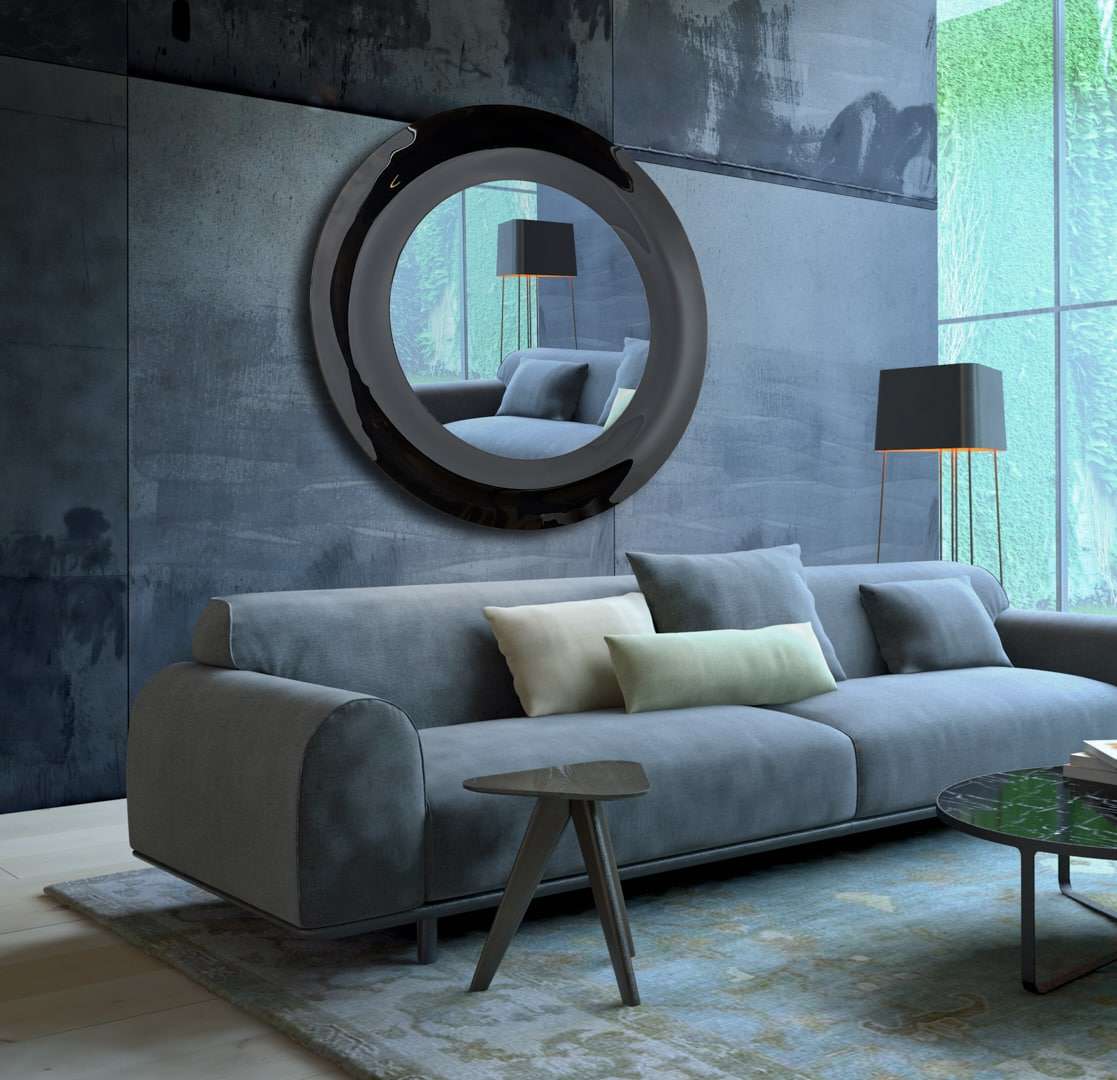 Καθρέφτης διακοσμητικός σε σχήμα παραλληλόγραμμο με ιδιαίτερες λεπτομέρειες στο περίγραμμα ψημένου γυαλιού σε μαύρο χρώμα, θα δώσει μια luxury πινελιά στον χώρο σας.