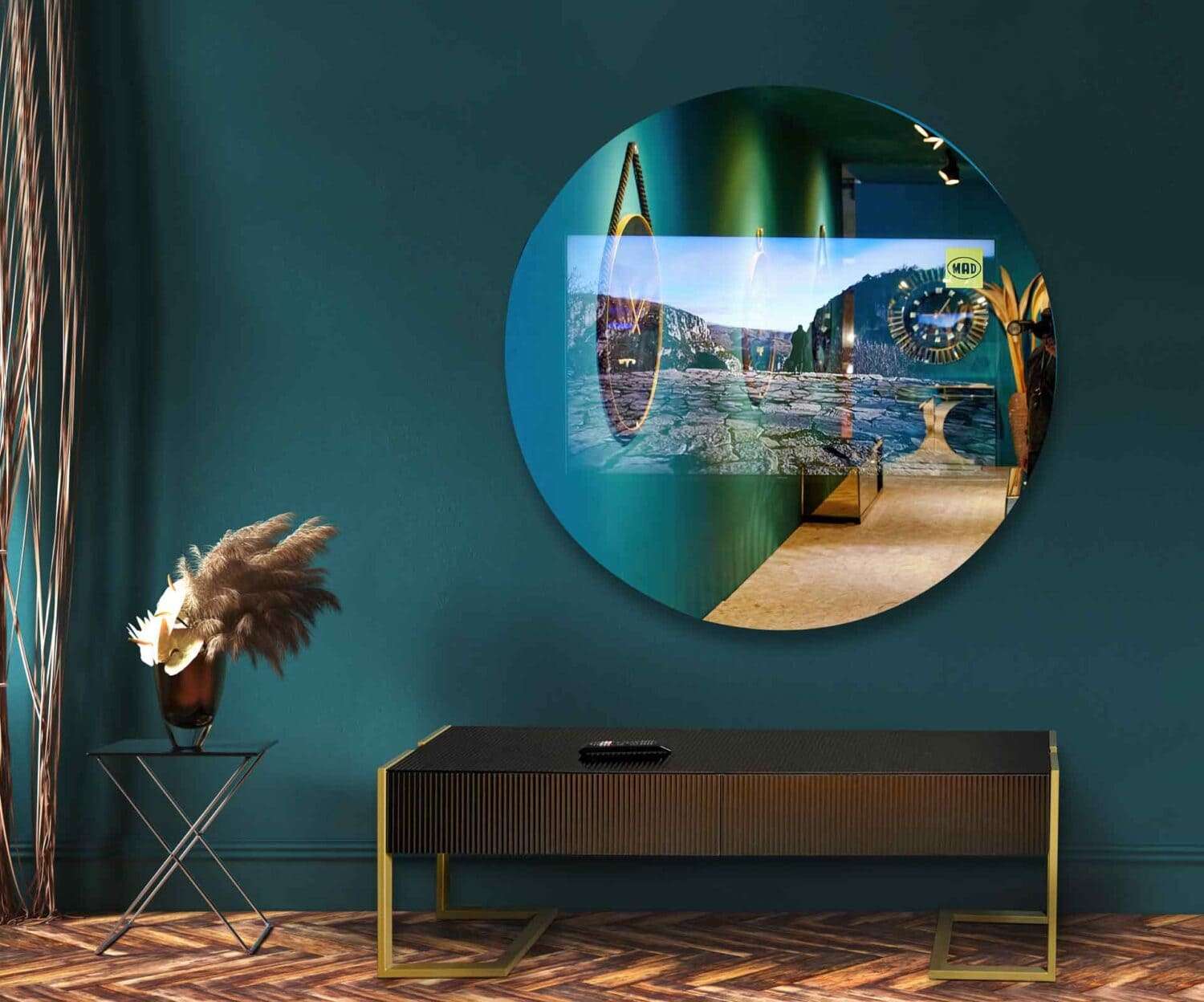 Καθρέφτης διακοσμητικός σε σχήμα στρογγυλό σε φιμέ ειδικό κρύσταλλο, που μπορείτε εσωτερικά να τοποθετήσετε την τηλεόραση σας. Λειτουργεί σαν έναν απλό καθρέπτη ενώ οταν ανοίξετε την τηλεόραση σας μπορείτε να απολαύσετε την ταινία σας μέσα από τον διάφανο φιμέ καθρέπτη.