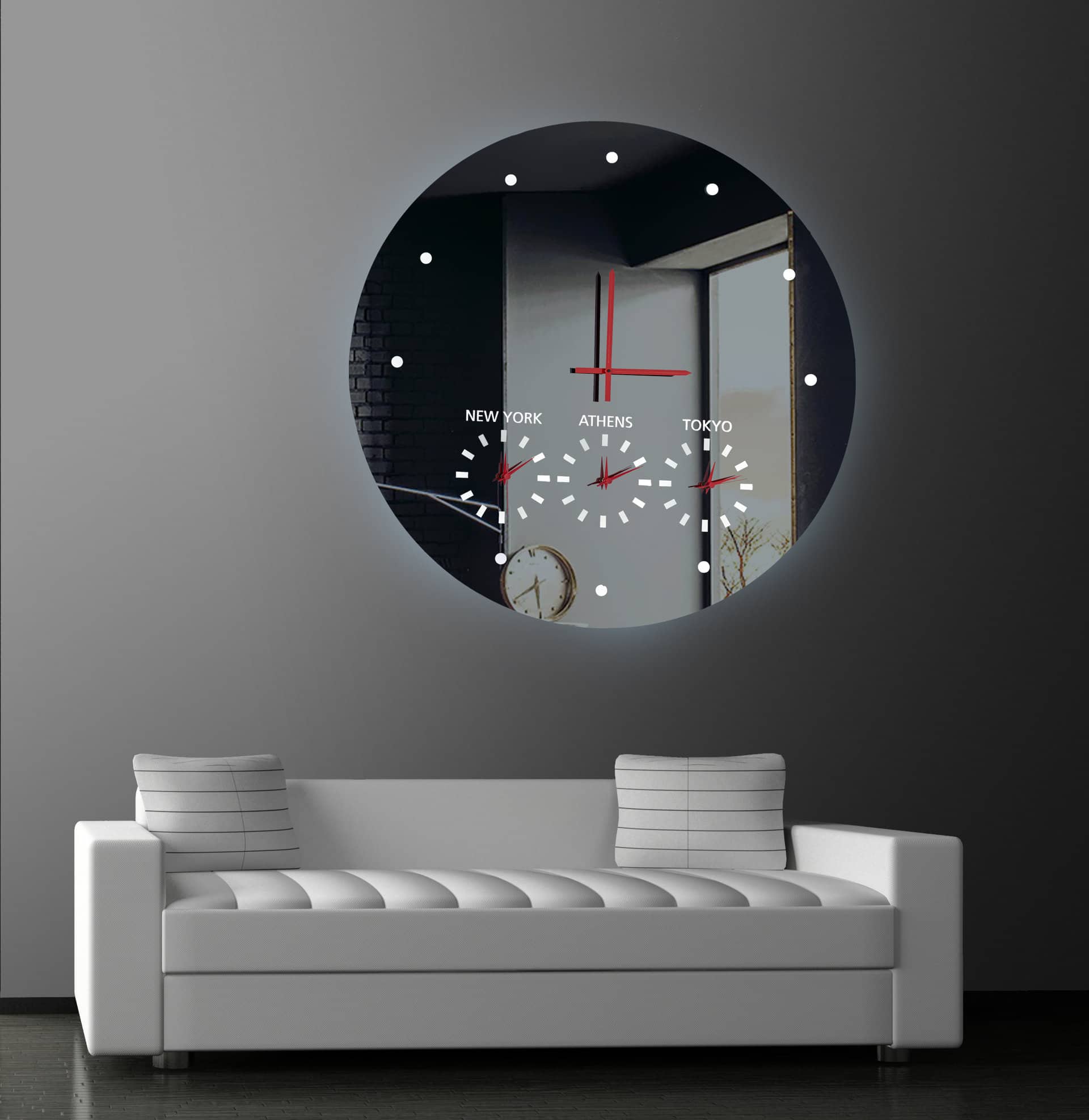 Καθρέφτης ρολόι με φωτισμό led, με τέσσερις μηχανισμούς για να μπορείτε να ορίσετε διαφορετικές ώρες κάθε χώρας. Μπορείτε να επιλέξετε και ποιες χώρες θέλετε να γράψουμε.