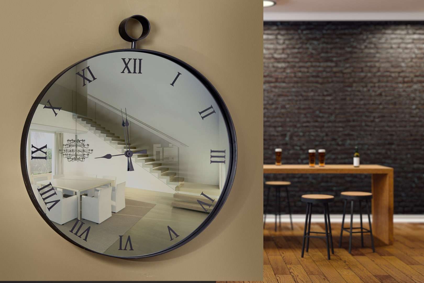 Καθρέφτης ρολόι με περιμετρικό μέταλλο. Επιπλέον διαθέτει μοναδική σχεδίαση με φιμέ καθρέπτη το οποίο τοποθετείται στον τοίχο.
