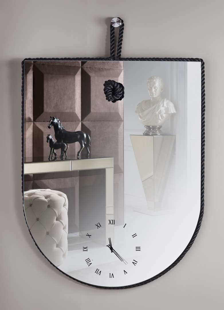 Καθρέφτης ρολόι με περιμετρικό μέταλλο. Επιπλέον διαθέτει μοναδική σχεδίαση και σχοινί περιμετρικά και έχτρα μηχανισμό εκκρεμές από το οποίο τοποθετείται στον τοίχο.
