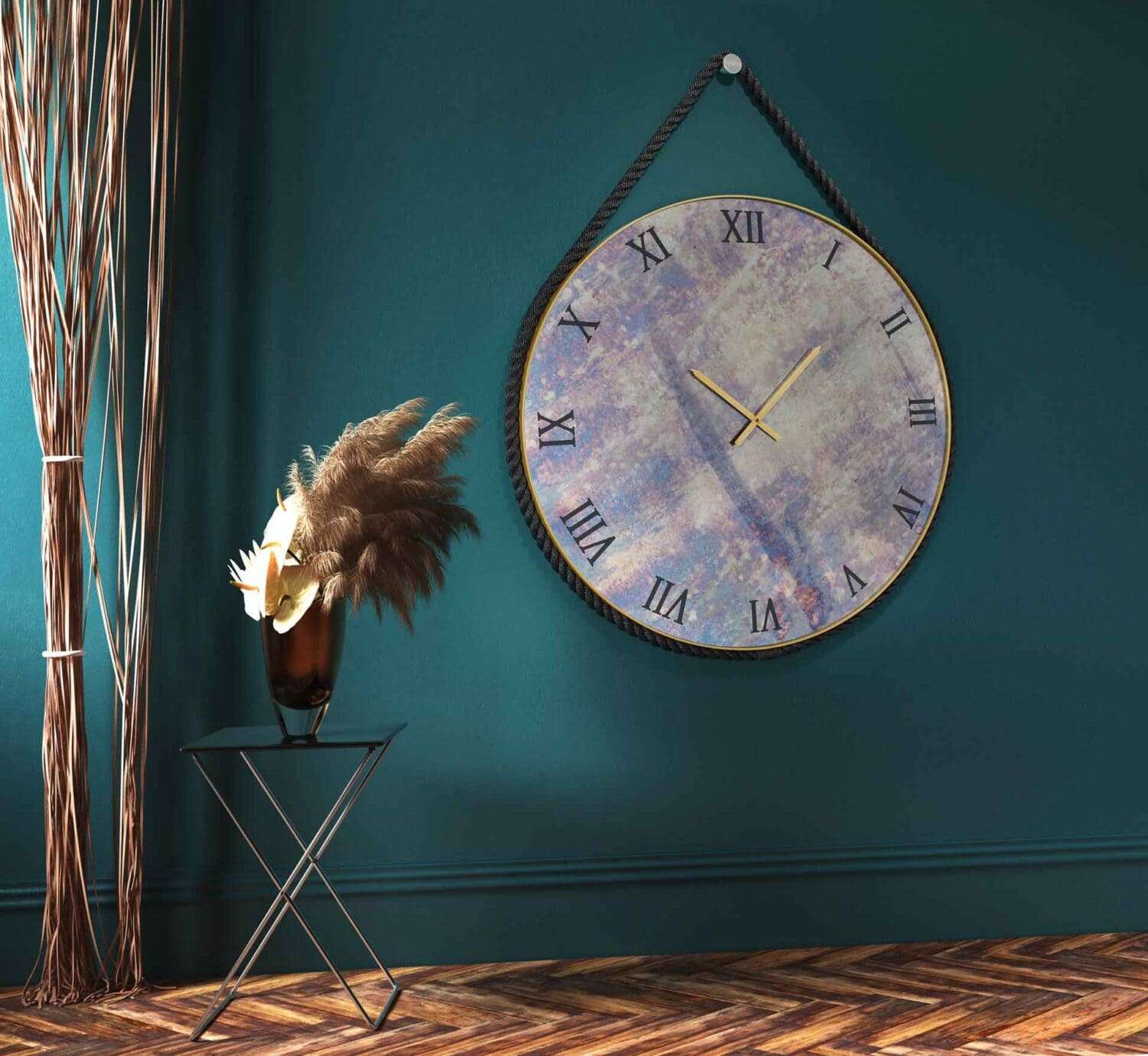 Καθρέφτης ρολόι με περιμετρικό μέταλλο. Επιπλέον διαθέτει μοναδική σχεδίαση και σχοινί περιμετρικά από το οποίο τοποθετείται στον τοίχο.