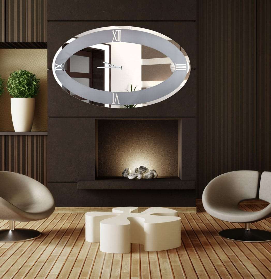 Καθρέφτης ρολόι με φωτισμό led, με αμμοβολή στα λατινικά νούμερα και χρώμα καθρέφτη φιμέ.
