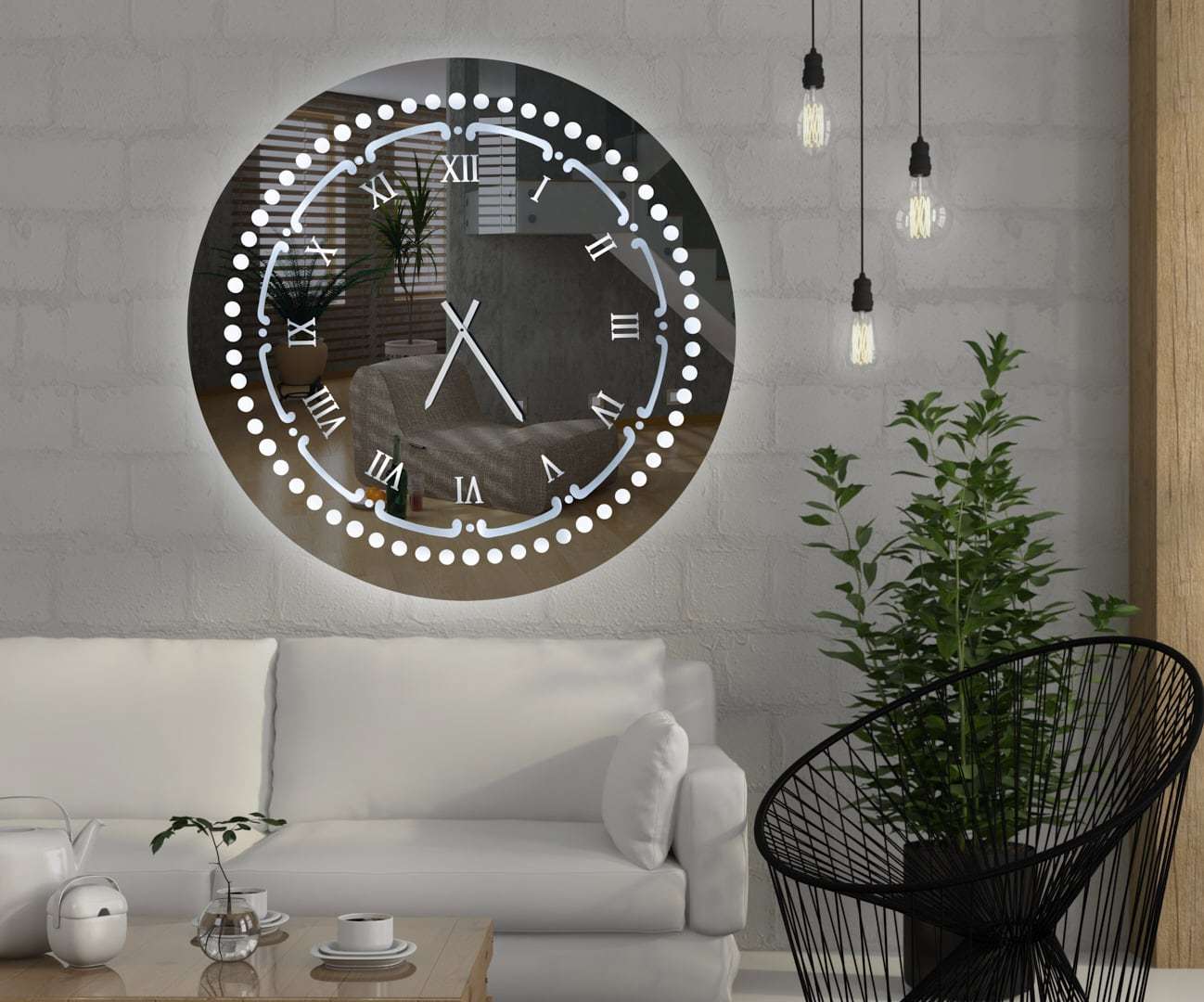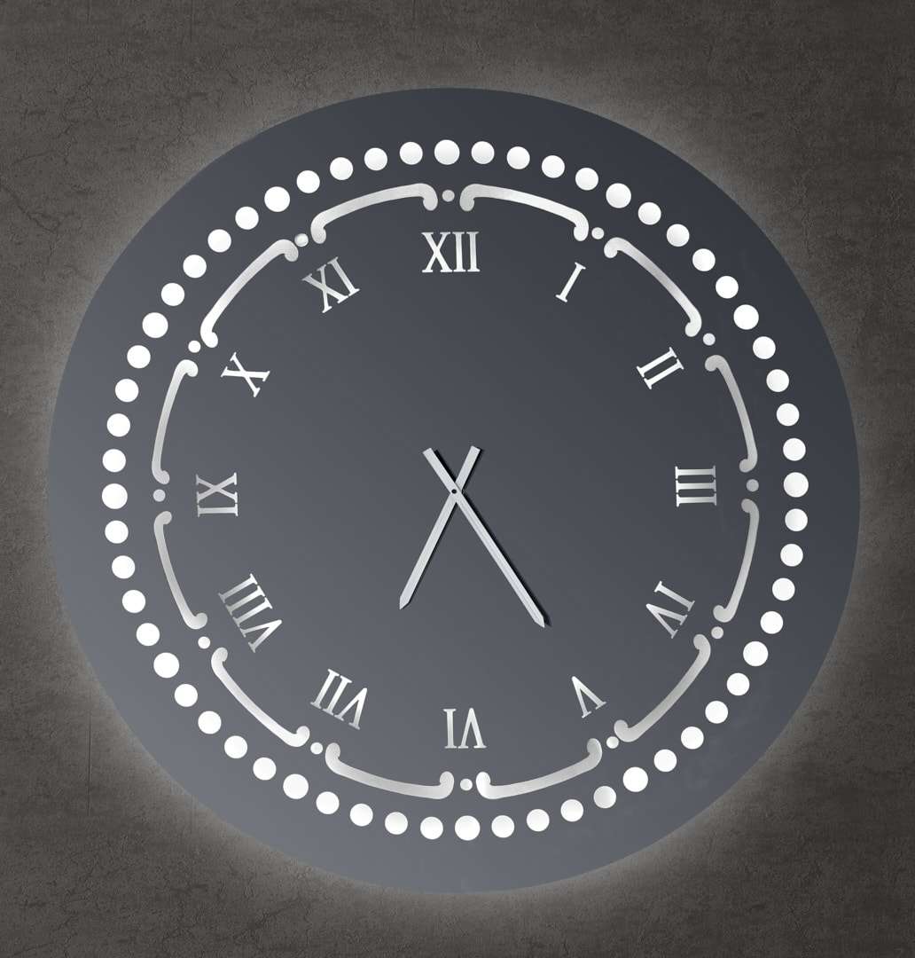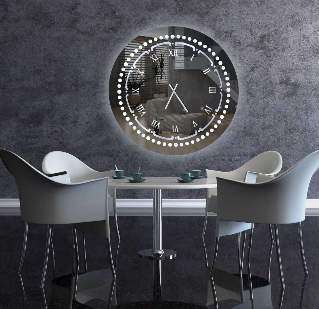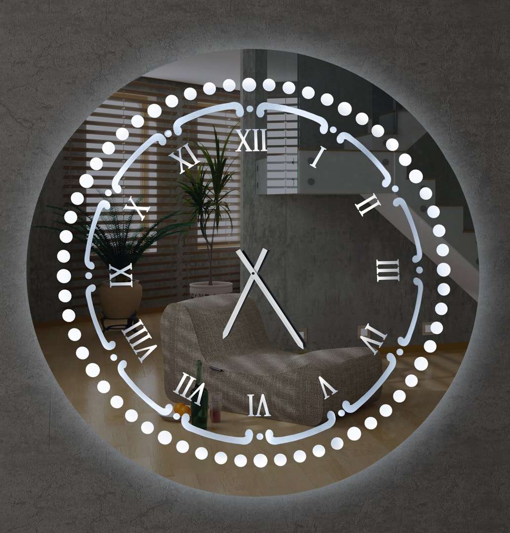 Καθρέφτης ρολόι με φωτισμό led, με αμμοβολή στα λατινικά νούμερα και χρώμα καθρέφτη φιμέ.