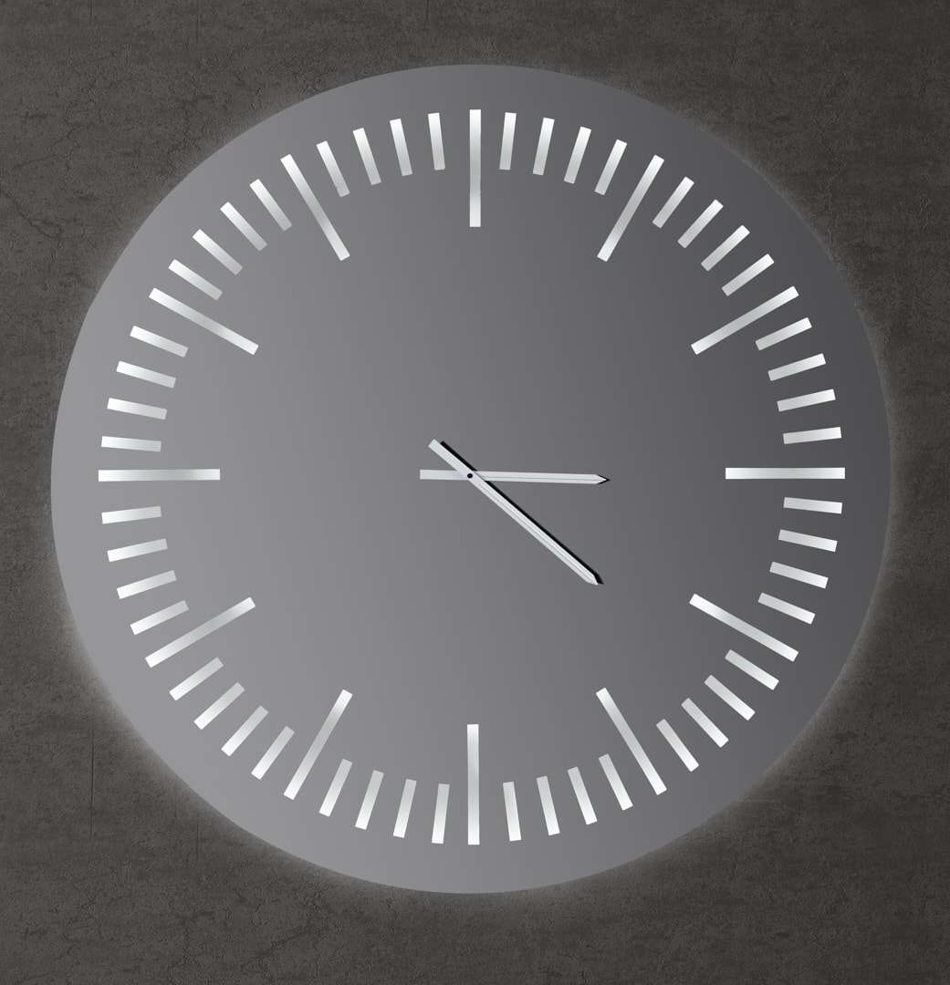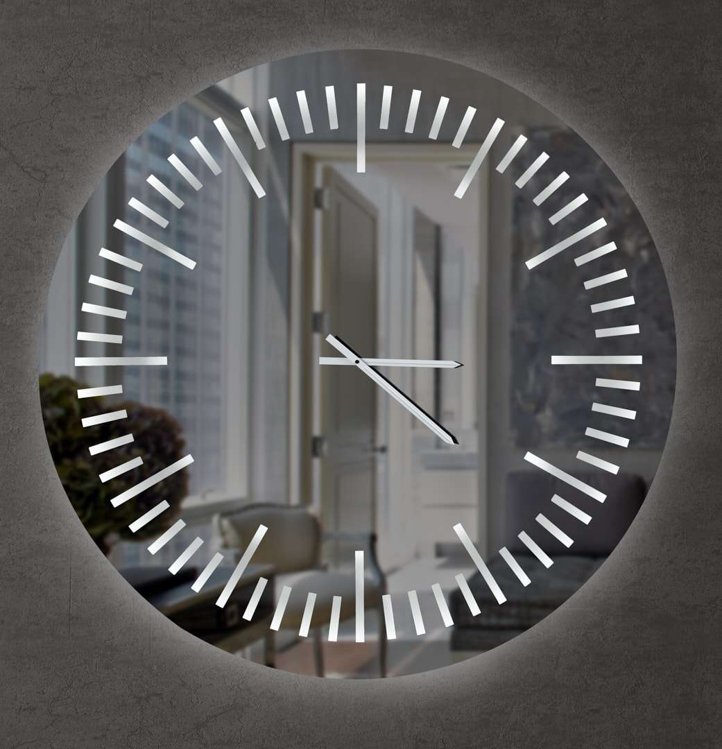 Καθρέφτης ρολόι με φωτισμό led, με αμμοβολή στα λατινικά νούμερα και  χρώμα καθρέφτη φιμέ.