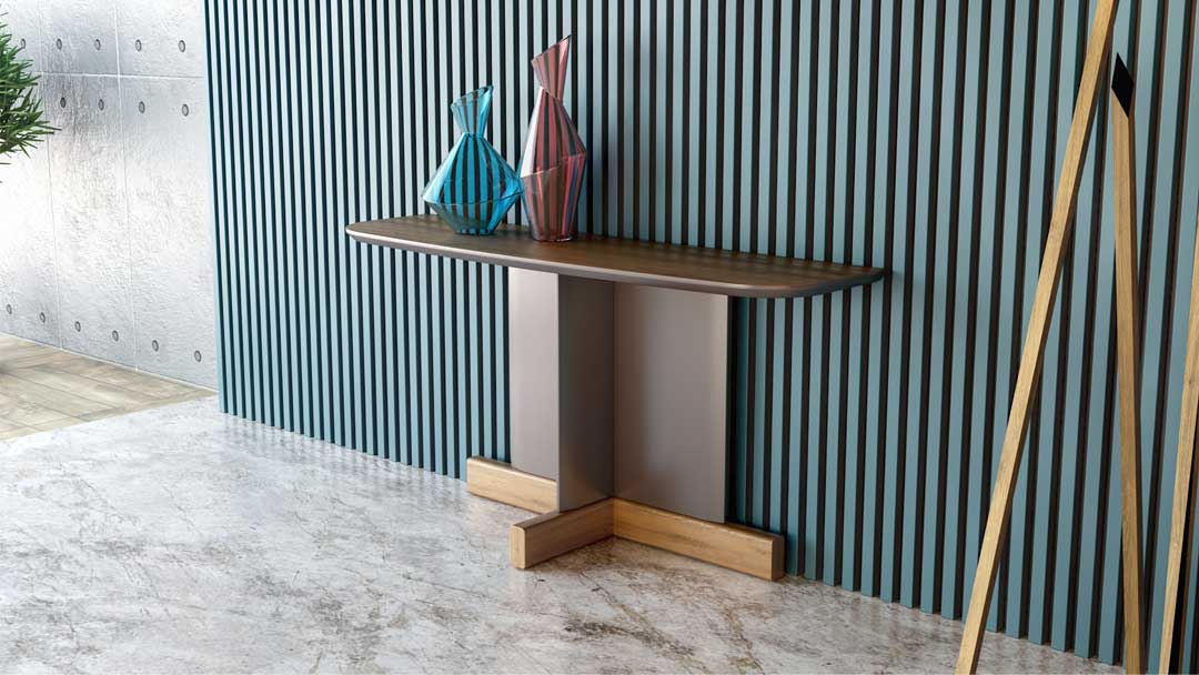 Μοντέρνα κονσόλα με λεπτές γραμμές και αρμονικό συνδυασμό ευκαλύπτου ή δρυς και λάκας. Την κονσόλα Sempre την κατασκευάζουμε σε διαστάσεις, ξύλο και χρώμα λάκας προσαρμοσμένα στο χώρο σας.