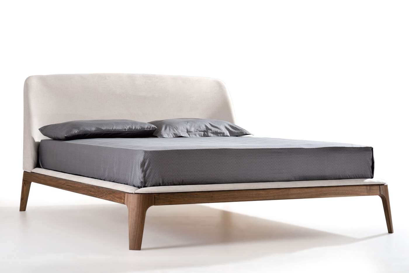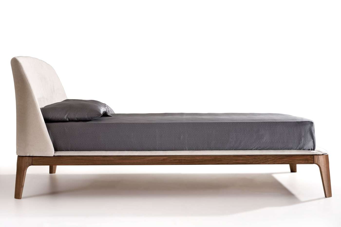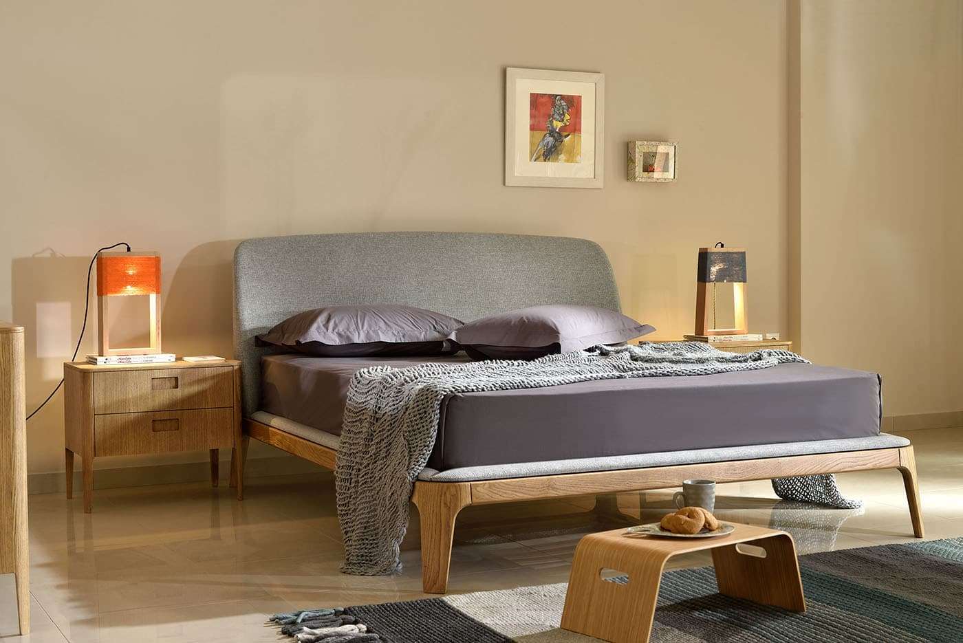 Κρεβάτι με σκελετό από μασίφ ξύλο, λείες άκρες και μεγάλο κεφαλάρι που διπλώνει στην άκρη του κρεβατιού αγκαλιάζοντας το σώμα.