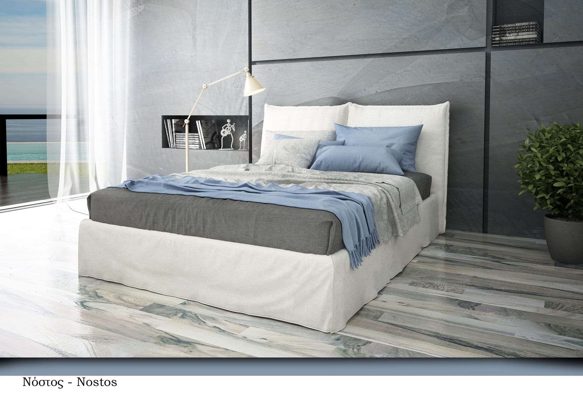 Ντυμένο Κρεβάτι Νόστος Ελληνικής κατασκευής Διαστάσεις (για 160 x 200 στρώμα): Αποτελείται από δύο βάσεις–υποστρώματα που συνδέονται μεταξύ τους με μεταλλικούς συνδέσμους. Ύφασμα βάσης αποσπώμενο για τον εύκολο καθαρισμό ή αντικατάστασή του. Διαθέτει σκελετό από ξύλο οξιάς και λευκής ξυλείας, εξασφαλίζοντας έτσι μέγιστη αντοχή στο χρόνο. Το ύφασμα της βάσης είναι αποσπώμενο για τον εύκολο καθαρισμό ή αντικατάστασή του. Υπάρχει η δυνατότητα τοποθέτησης αποθηκευτικού χώρου. Διαθέτει μεταλλικά πόδια. Στην τιμή δεν περιλαμβάνεται το στρώμα. Μπορεί να κατασκευαστεί σε οποιαδήποτε διάσταση βάση του χώρου σας, κατόπιν παραγγελίας. Η χρωματική απόχρωση του προϊόντος ενδέχεται να διαφέρει ελαφρώς σε σχέση με την φωτογραφική απεικόνισή του στην οθόνη σας. Διατίθεται σε ποικιλία αδιάβροχων, αλέκιαστων, easy-clean υφασμάτων.