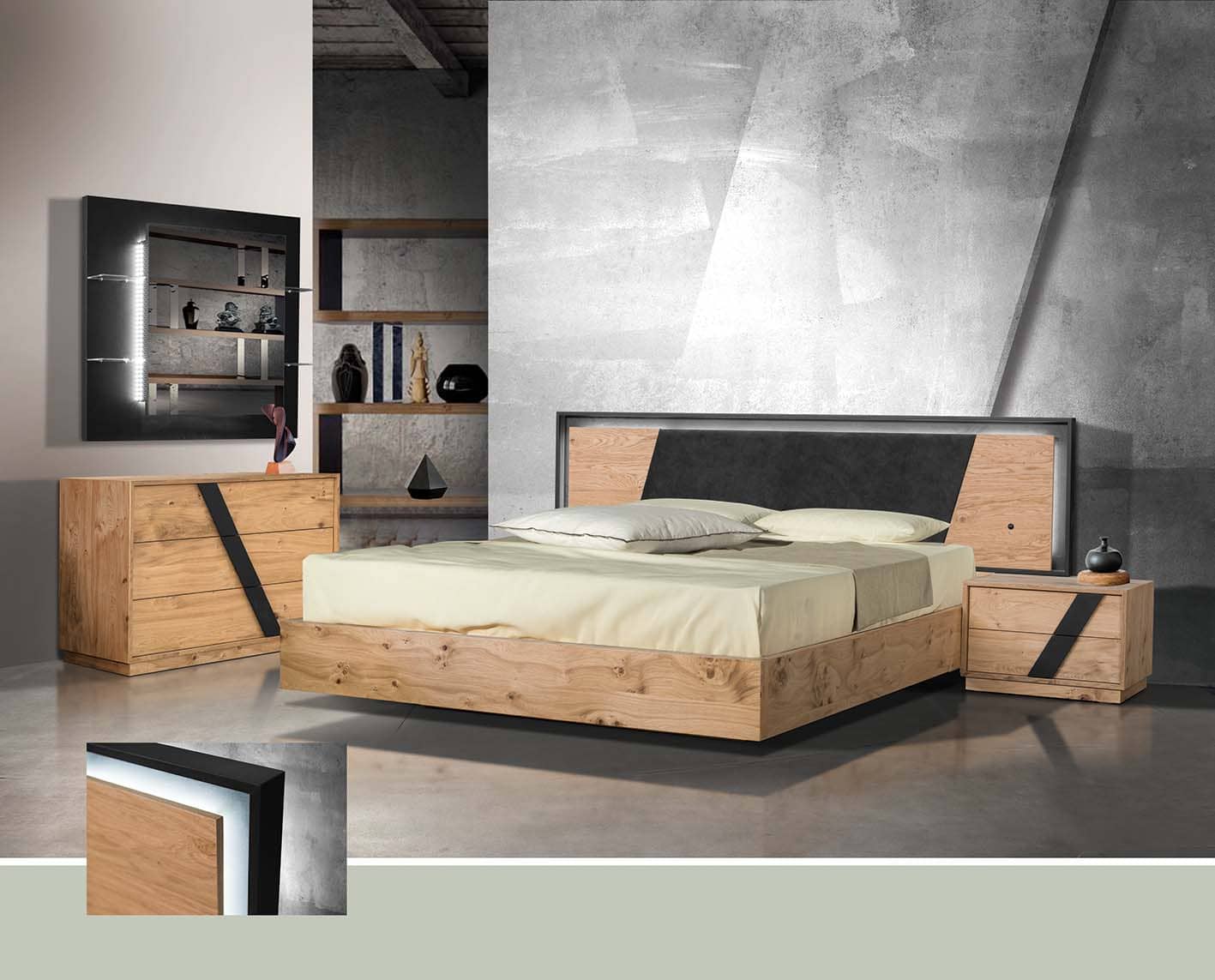 Ένα μοντέλο κατασκευασμένο από ξύλο ρουστίκ και σε συνδυασμό με  λεπτομέρειες από λάκα μας εντυπωσιάζει τόσο αισθητικά όσο και λειτουργικά με την προσθήκη ντύσιμο στο κεφαλάρι.