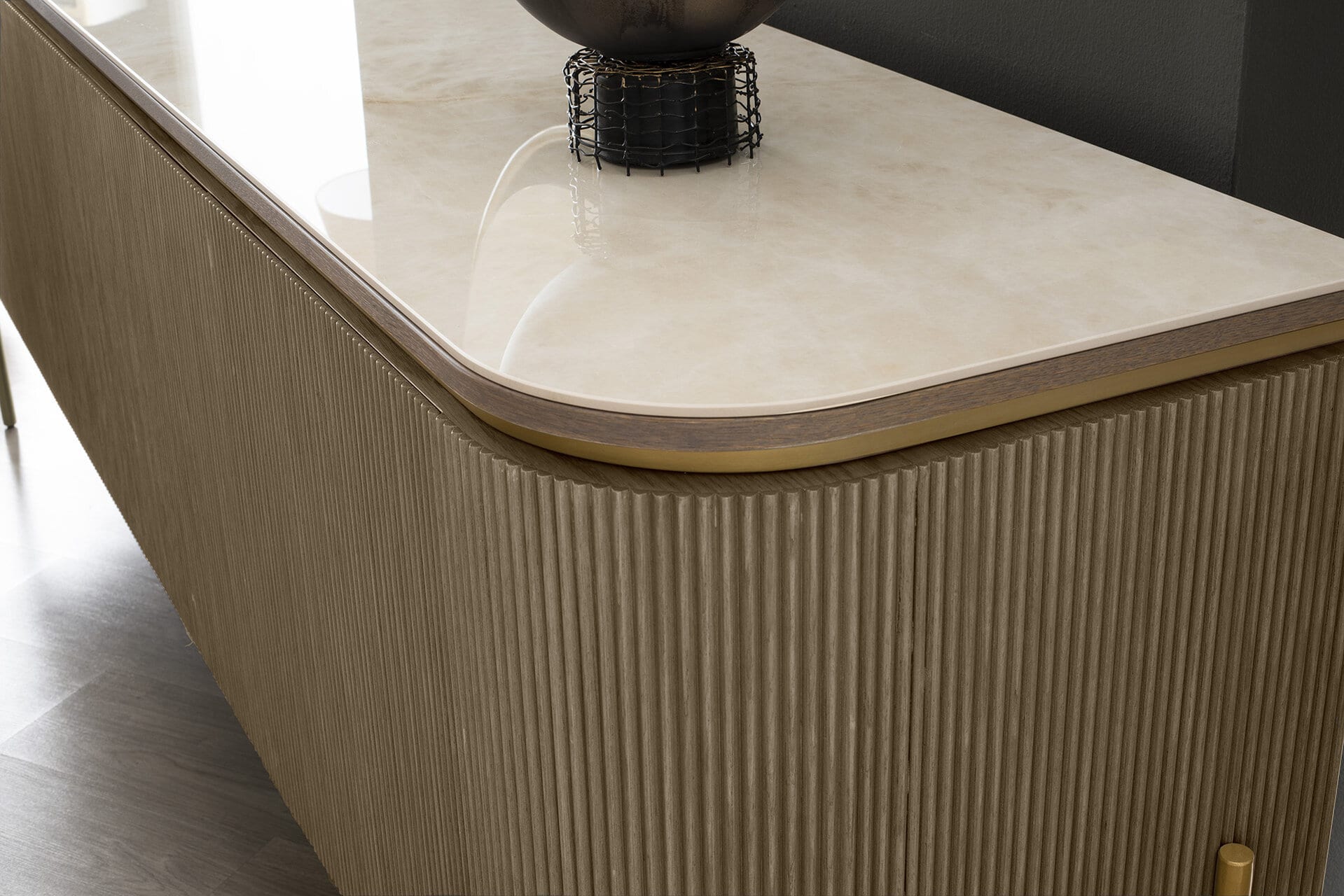 Δρύινος μπουφές με μασίφ στρογγυλεμένα πηχάκια και κεραμική επιφάνεια (κατόπιν επιλογής). Δυνατότητα επιλογής χρώματος ξύλου, διαστάσεων και κεραμικής επιφάνειας.
