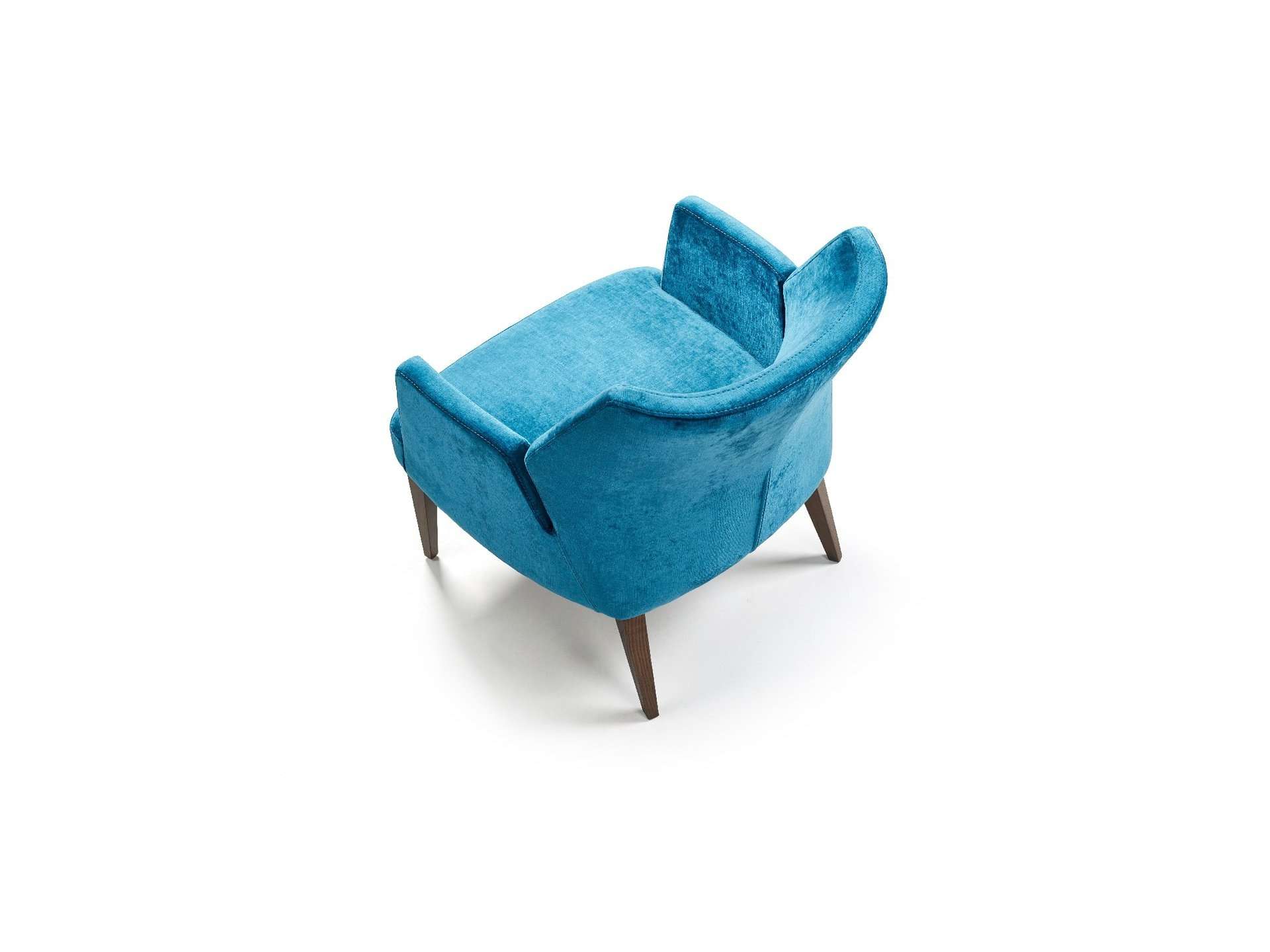 Μοντέρνου σχεδιασμού πολυθρόνα, ντυμένη με ύφασμα και ξύλινα πόδια.