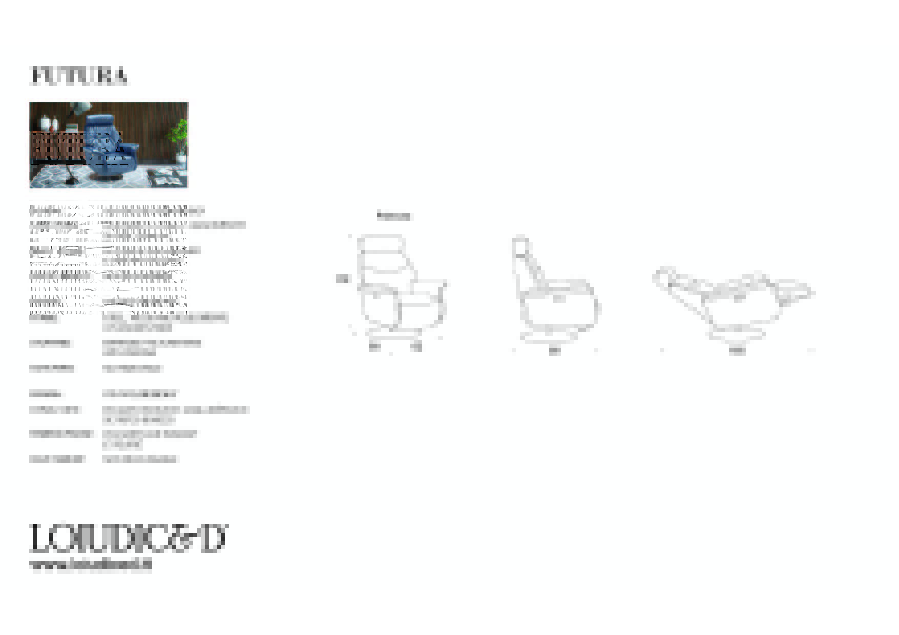 Η πολυθρόνα relax Futura δέρμα Ιταλίας είναι μια πολυθρόνα με εργονομικό σχεδιασμό που μελετήθηκε λεπτομερώς για να την κάνει ιδανική για την επίπλωση ενός σπιτιού, μιας αίθουσας συσκέψεων ή το γραφείου, αλλά και για μια ιδιαίτερη για εσάς, γωνιά χαλάρωσης με πιο κομψό στιλ. Κατασκευάζεται στην Ιταλία με γνήσιο δέρμα 100% με χρώματα και ποιότητες της επιλογής σας, ή μπορεί να κατασκευαστεί με ύφασμα σε ποιότητα και χρώμα που θα επιλέξετε.