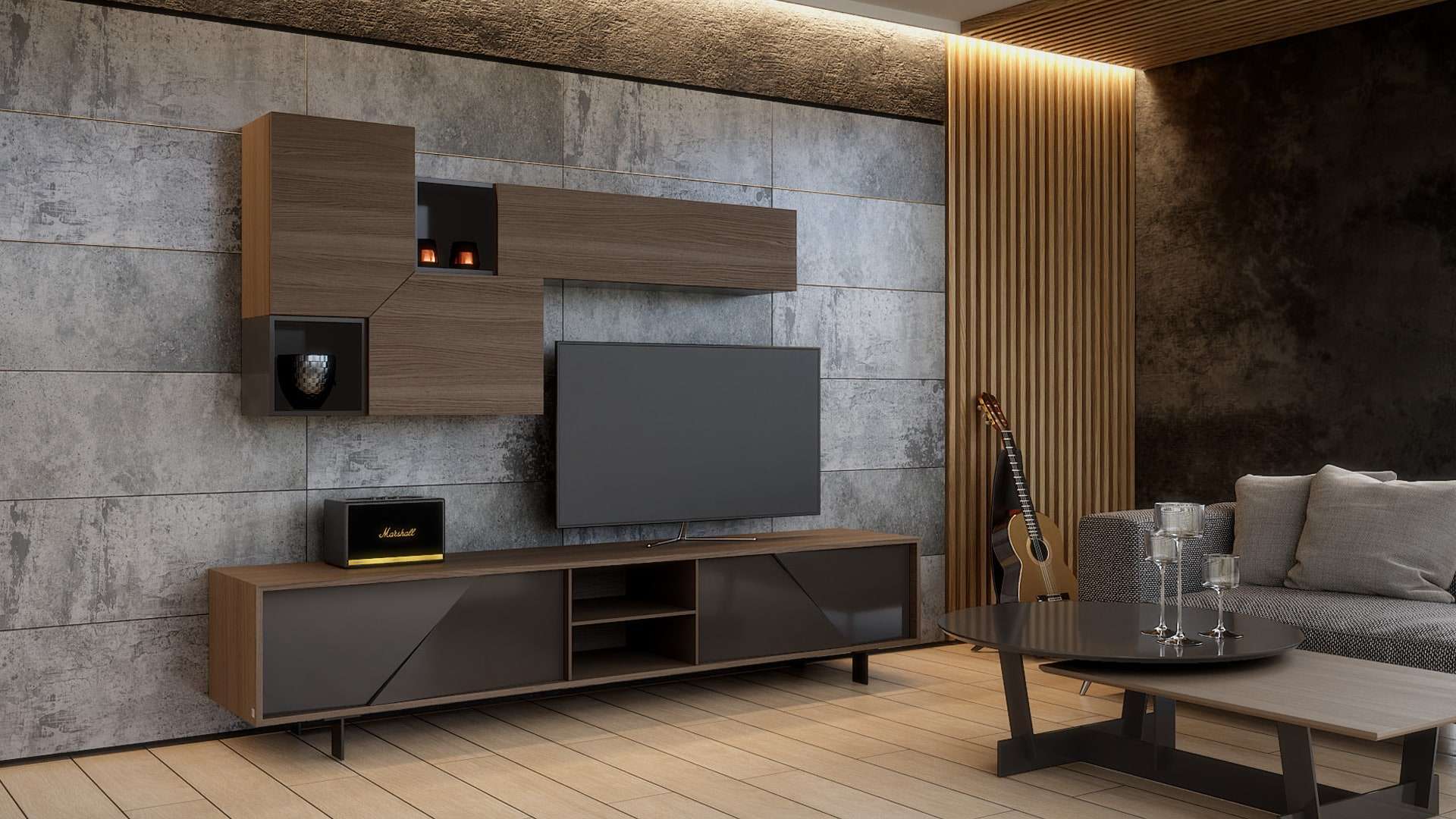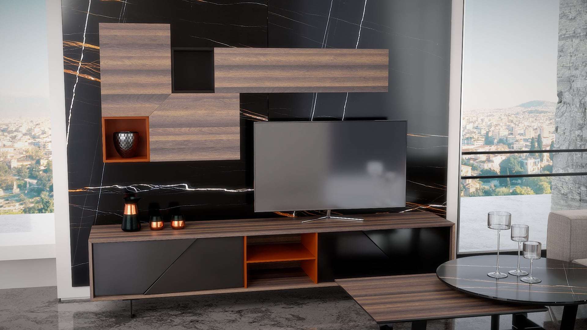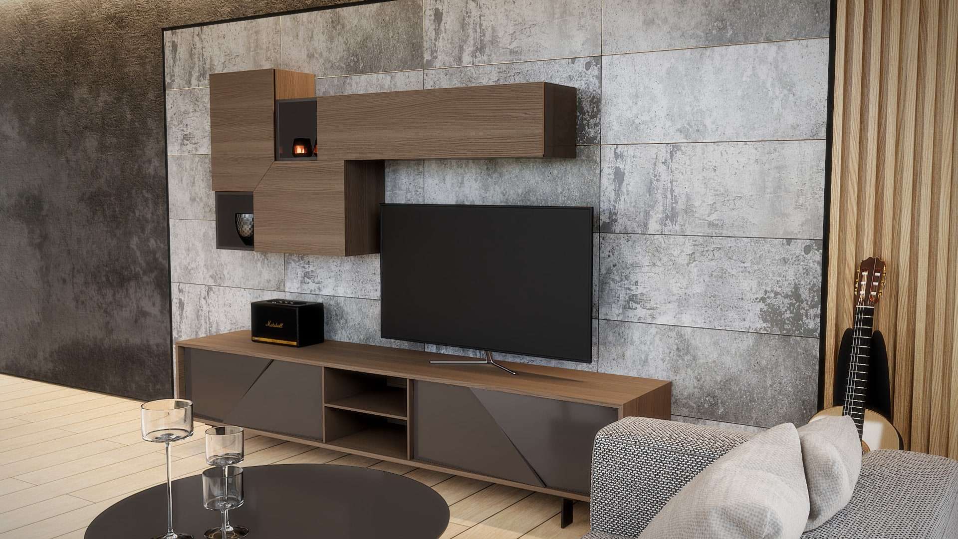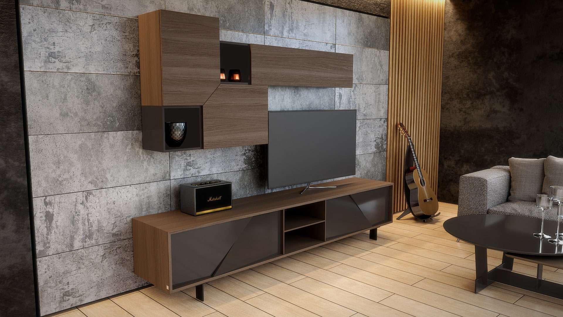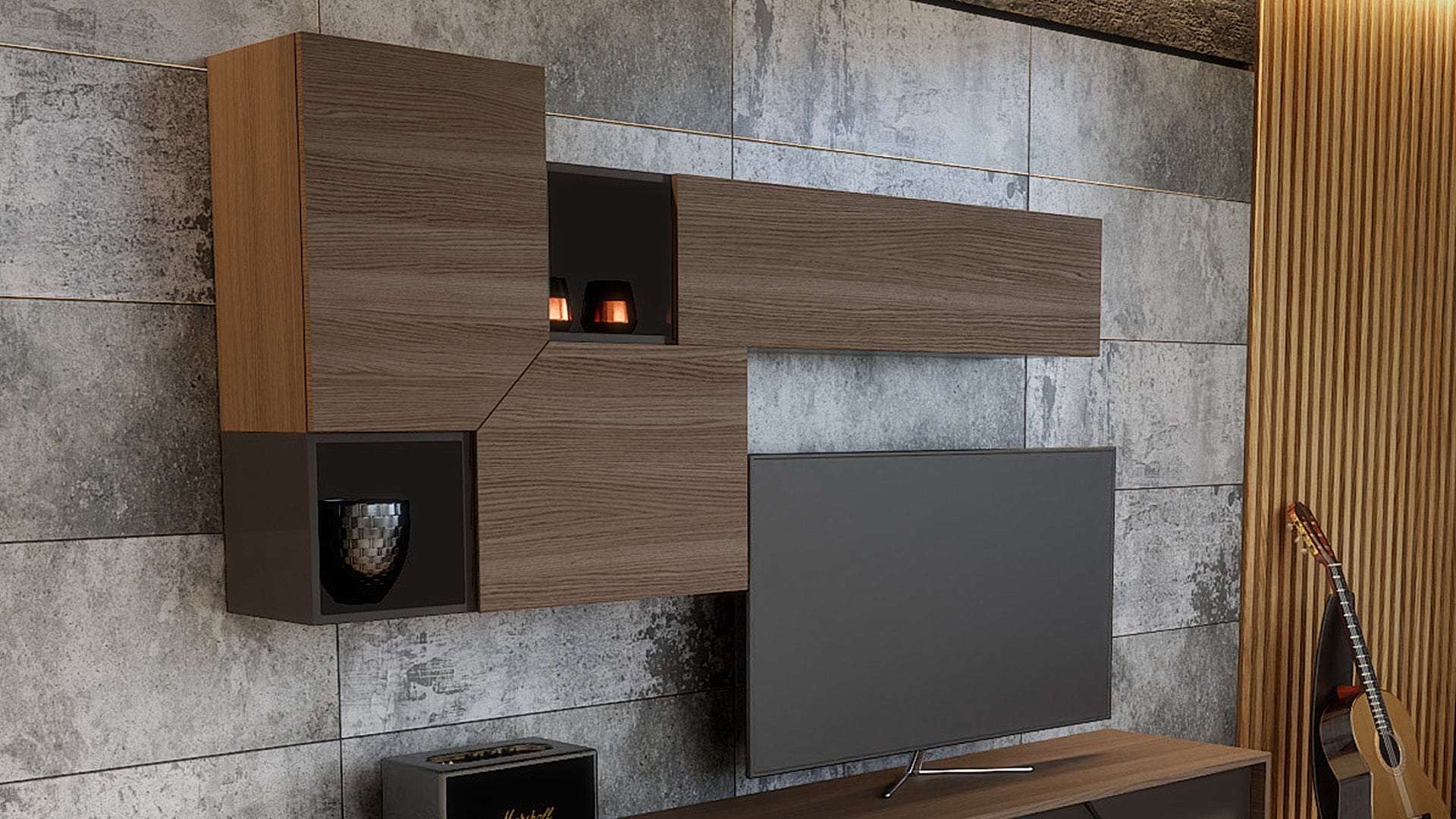 Σύνθεση Brera. Ελληνικής Κατασκευής. Ξύλο δρυς με λάκα. Διάσταση σύνθεσης: 250cm Μία ολοκαίνουρια σύνθεση, εντυπωσιακή με ξύλο δρύ και φιμέ λάκα, elegant σχέδιο που θα απογειώσει διακοσμητικά κάθε χώρο. Σχεδιαστική φινέτσα και λεπτομέρεια στη βάση της σύνθεσης που λειτουργεί και ως μίνι μπουφές με έξυπνο αποθηκευτικό χώρο. Ιδιαίτερο στοιχείο στη βάση το πρωτότυπο pattern από ασύμμετρα σχήματα που δεν εφάπτονται δημιουργώντας μια τρισδιάστατη αίσθηση στο χώρο. Την σύνθεση ολοκληρώνουν τα επιτοίχια ντουλάπια με την ισόρροπα ασύμμετρη τοποθέτηση και τον elegant συνδυασμό υλικών και χρωμάτων. Δυνατότητα αλλαγών.
