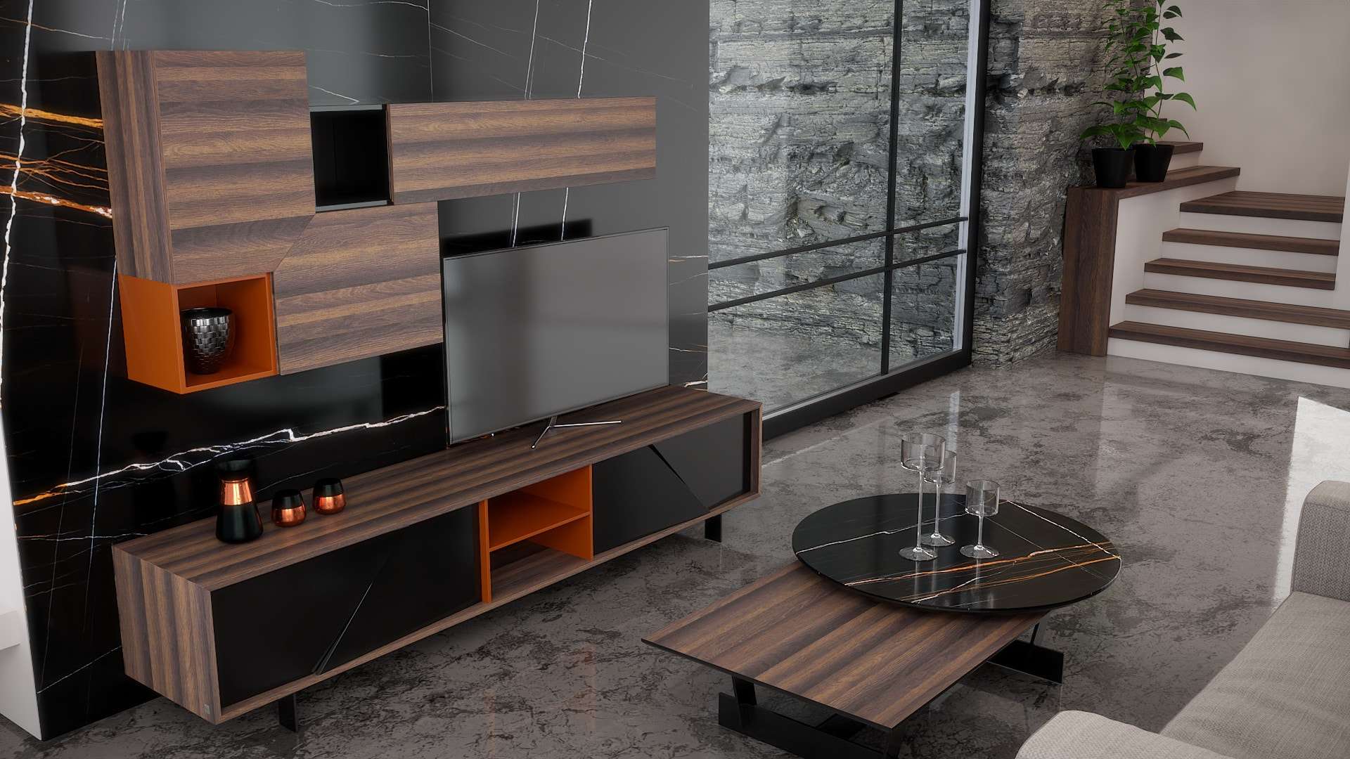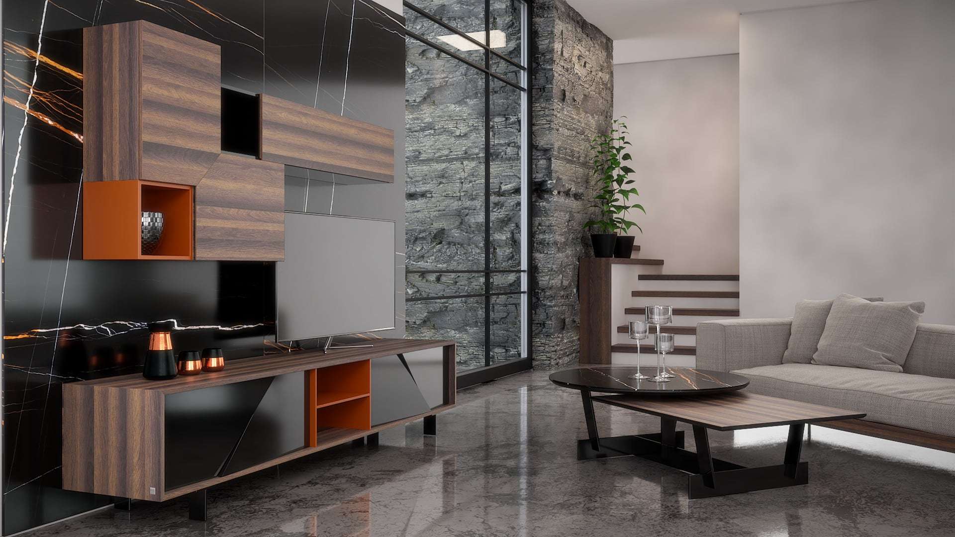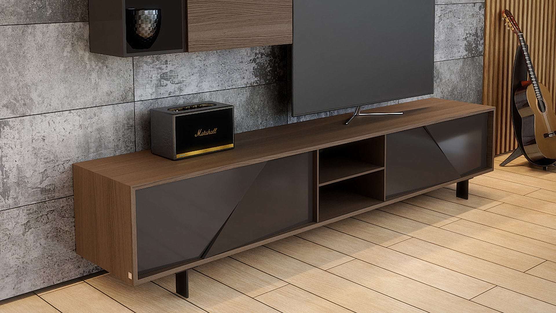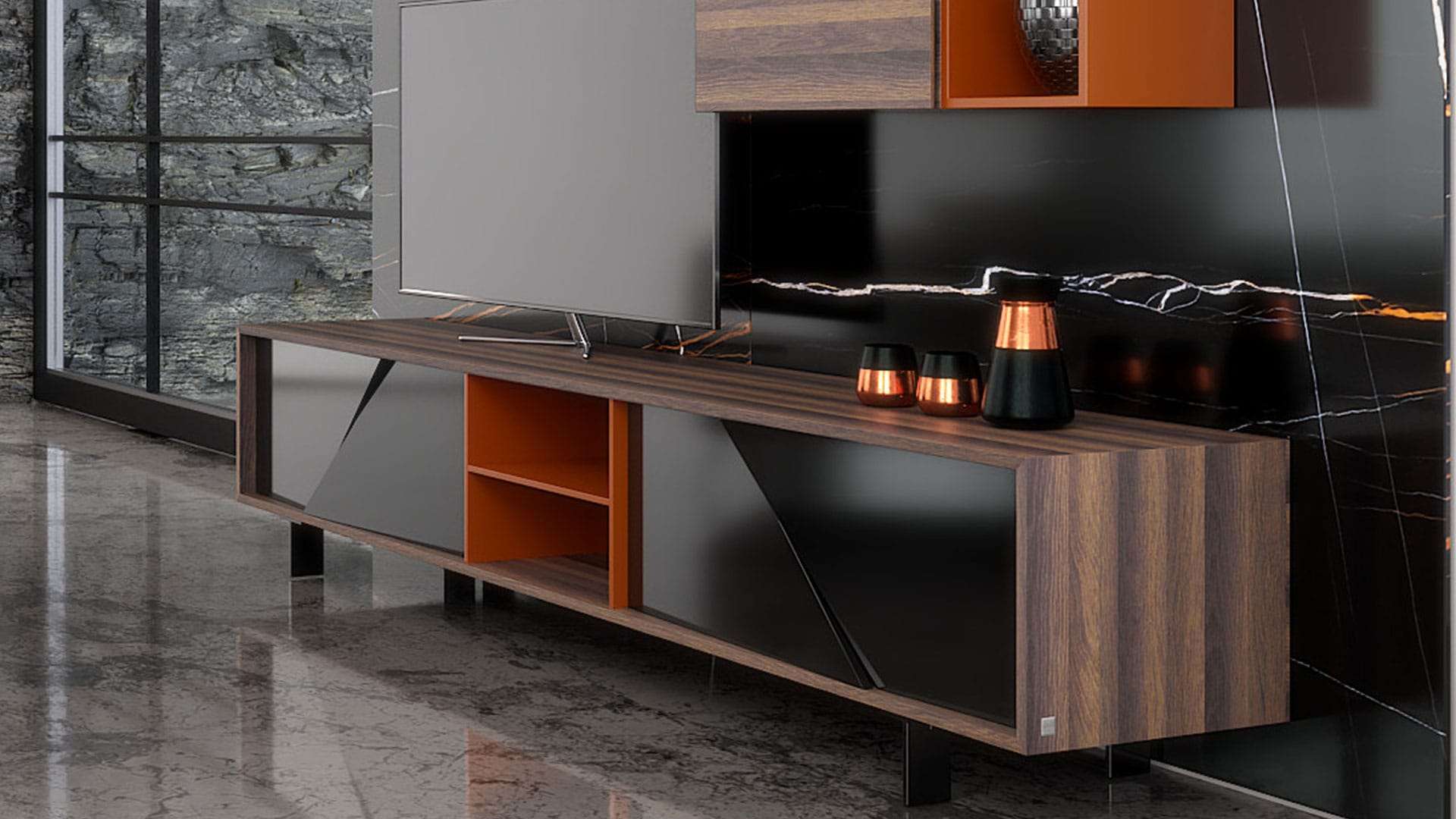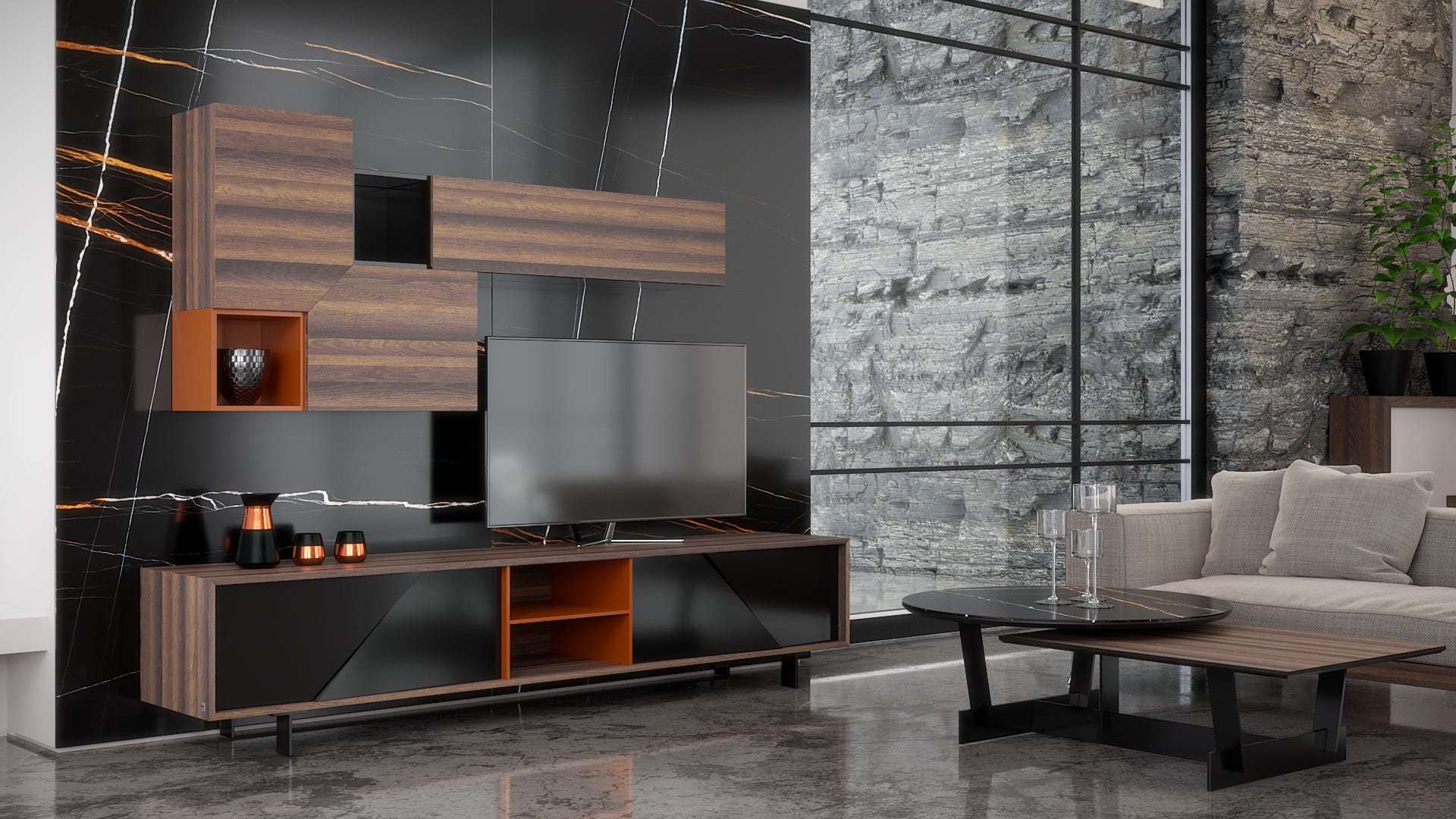 Σύνθεση Brera. Ελληνικής Κατασκευής. Ξύλο δρυς με λάκα. Διάσταση σύνθεσης: 250cm Μία ολοκαίνουρια σύνθεση, εντυπωσιακή με ξύλο δρύ και φιμέ λάκα, elegant σχέδιο που θα απογειώσει διακοσμητικά κάθε χώρο. Σχεδιαστική φινέτσα και λεπτομέρεια στη βάση της σύνθεσης που λειτουργεί και ως μίνι μπουφές με έξυπνο αποθηκευτικό χώρο. Ιδιαίτερο στοιχείο στη βάση το πρωτότυπο pattern από ασύμμετρα σχήματα που δεν εφάπτονται δημιουργώντας μια τρισδιάστατη αίσθηση στο χώρο. Την σύνθεση ολοκληρώνουν τα επιτοίχια ντουλάπια με την ισόρροπα ασύμμετρη τοποθέτηση και τον elegant συνδυασμό υλικών και χρωμάτων. Δυνατότητα αλλαγών.