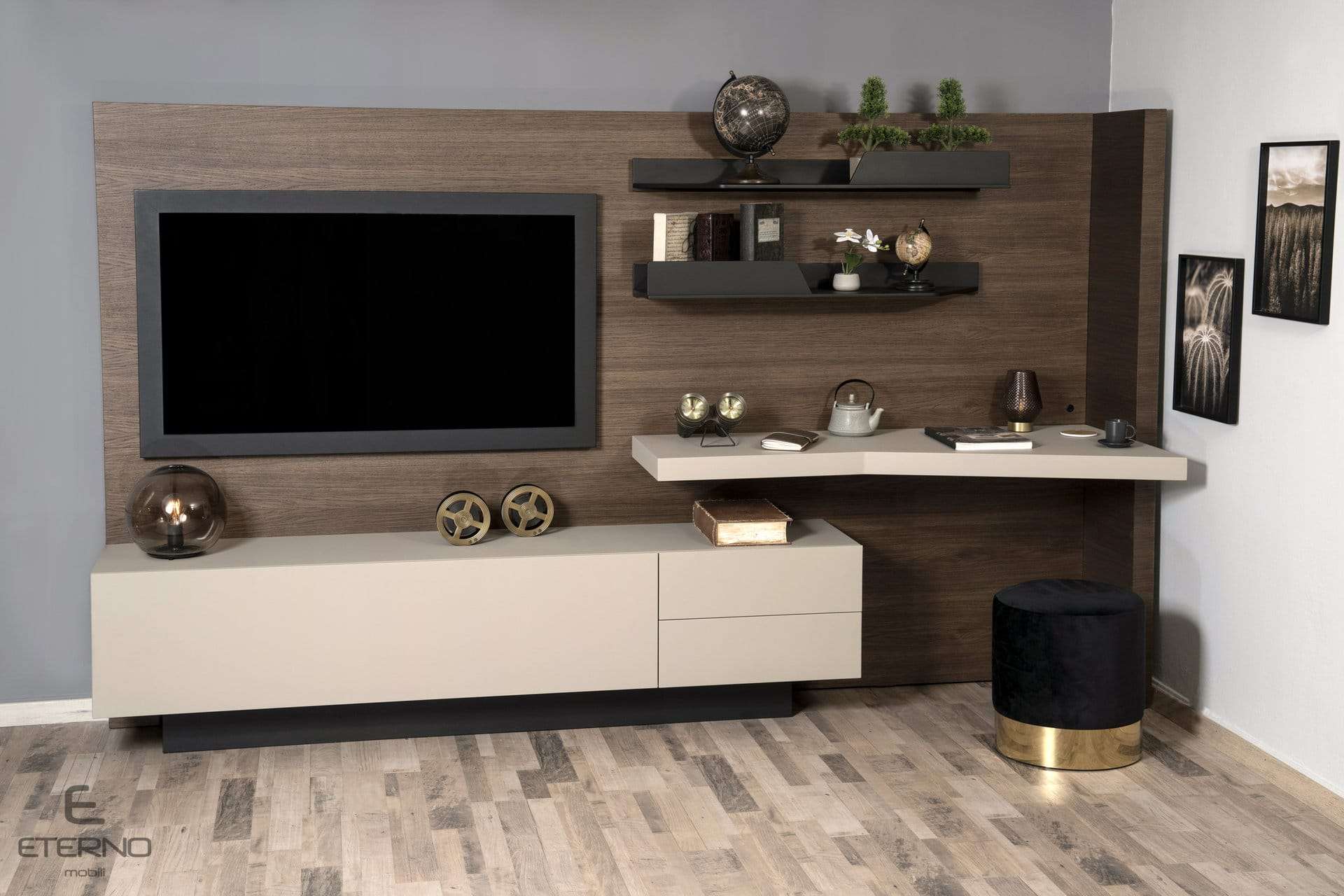 Σύνθεση LIFE. Ελληνικής κατασκευής. Μια μοντέρνα σύνθεση τοίχου αποτελεί και η Life που διέπεται από αρμονία και κομψότητα. Ευέλικτη καθώς η ύπαρξη θέσης γραφείου δίνει μια άλλη νότα στο χώρο σας. Υλικά κατασκευής: Ξύλο δρυός σε συνδυασμό με λάκα γκοφρέ . Συνολική Διάσταση (cm): 280 x 65 x 190 Έπιπλο TV: 195cm x 45cm x 48cm Κρεμαστό ράφι: 100cm x 27cm x 10cm Κρεμαστό Γραφείο: 134cm x 65cm x 5cm Πλάτη: 280cm x 40cm x 165cm Έξτρα φωτισμός: απο 300€ στα 240€ Δυνατότητα αλλαγών.