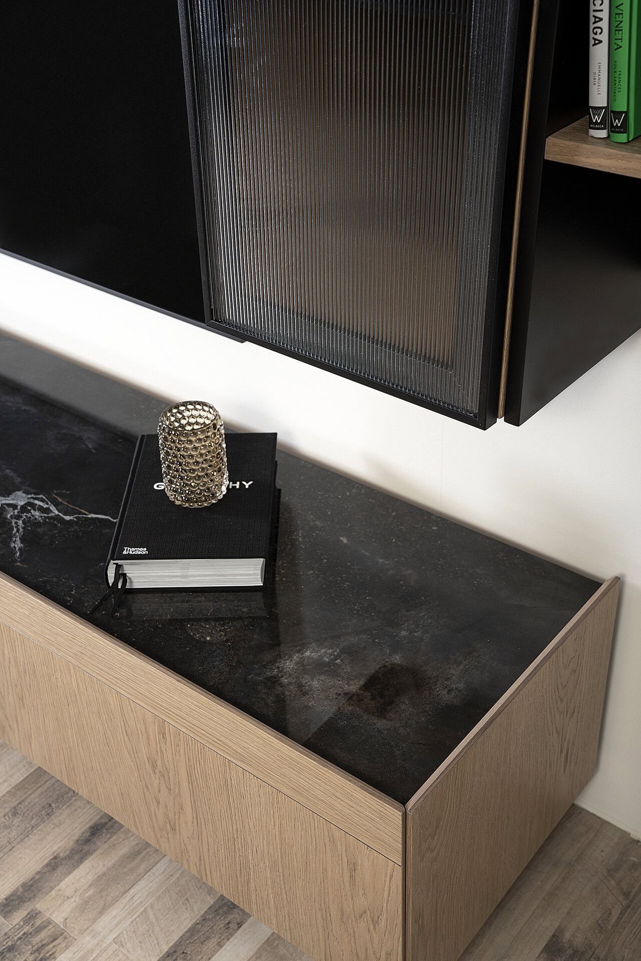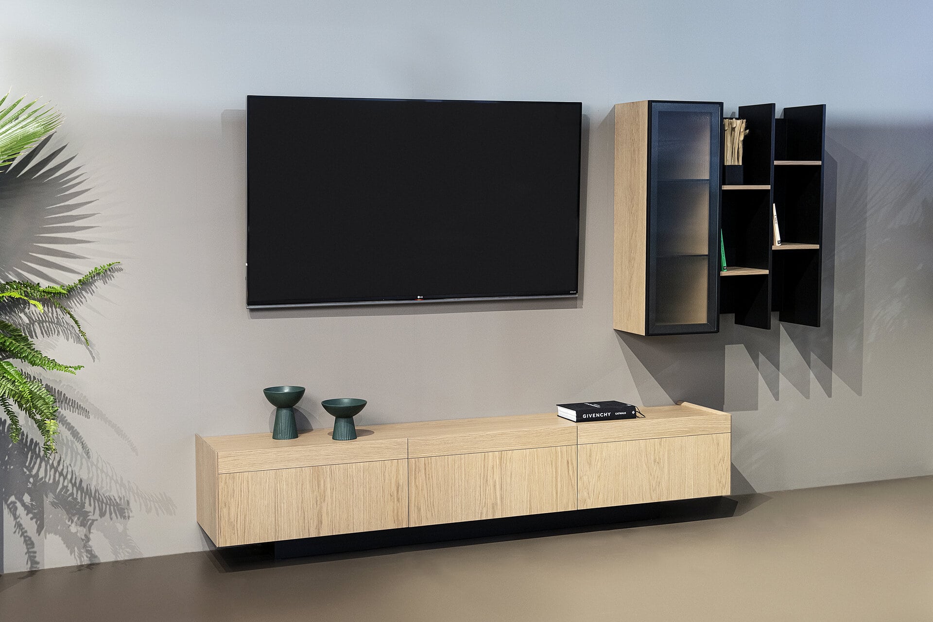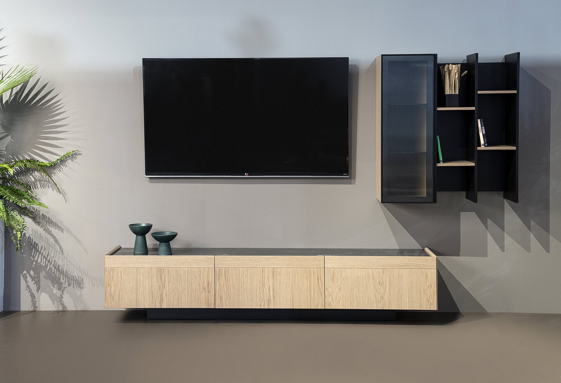Η λάκα ματ και το ξύλο δρυς μας χαρίζουν έναν αρμονικό συνδυασμό υλικών και χρωμάτων. Επιλογή και για κεραμική επιφάνεια στο έπιπλο tv που θα γεμίσει το χώρο μας με υψηλή αισθητική.