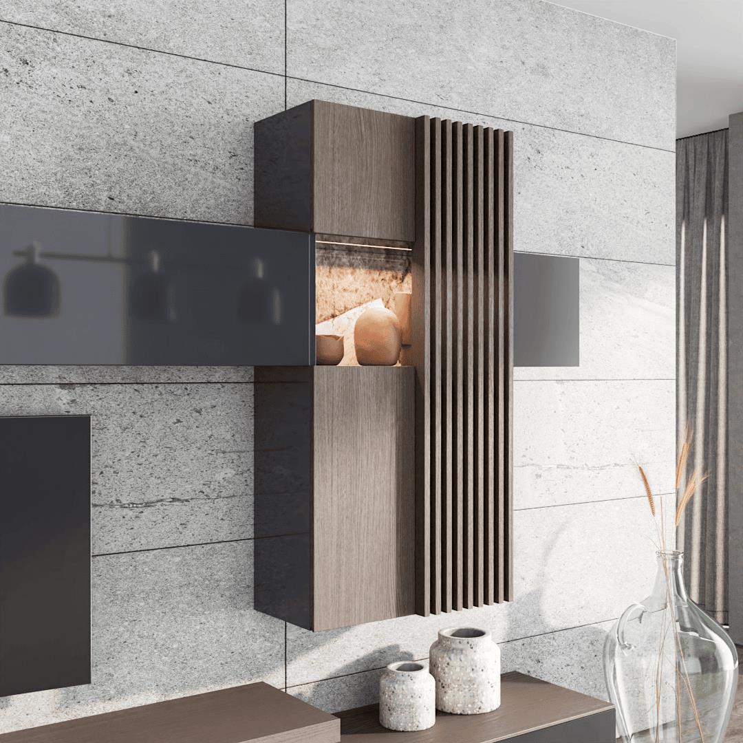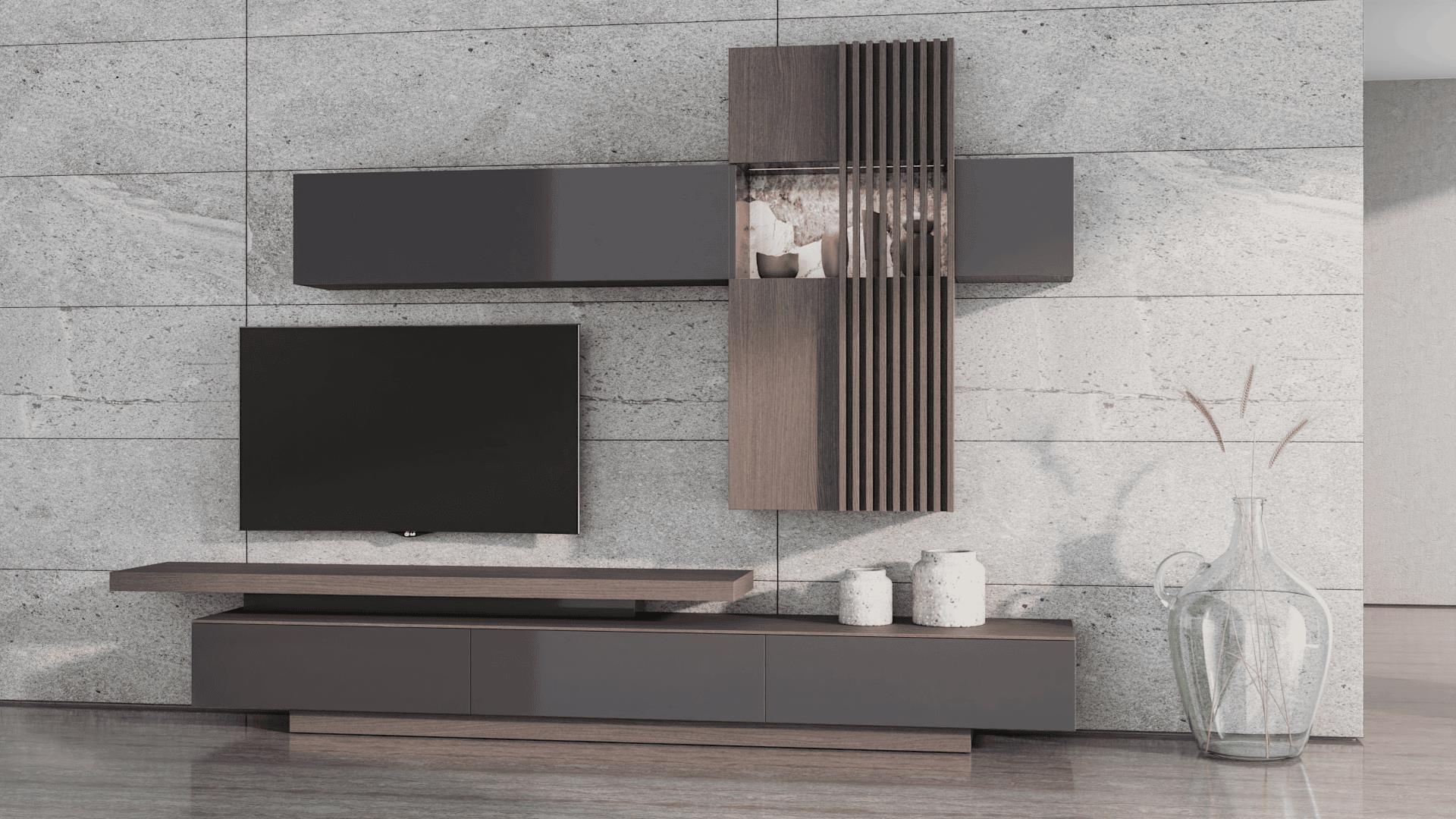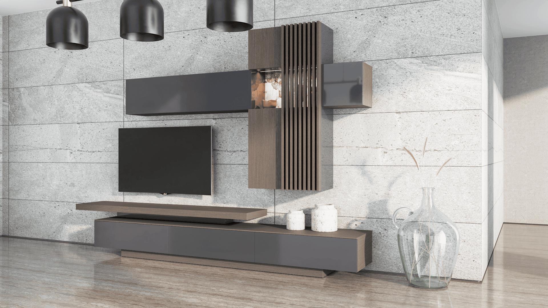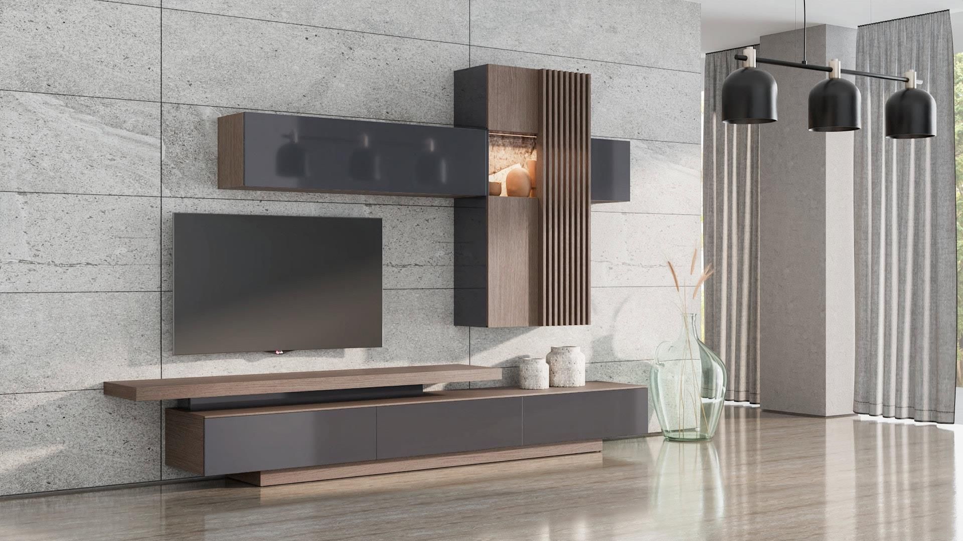 Ξύλο ευκαλύπτου και λάκα σε ένα modern minimal σχέδιο με μεγάλο αποθηκευτικό χώρο και διακριτικό κρυφό φωτισμό. Τη σύνθεση τοίχου Sempre την κατασκευάζουμε σε διαστάσεις, ξύλο και χρώμα λάκας προσαρμοσμένα στην αρχιτεκτονική του χώρου σας.