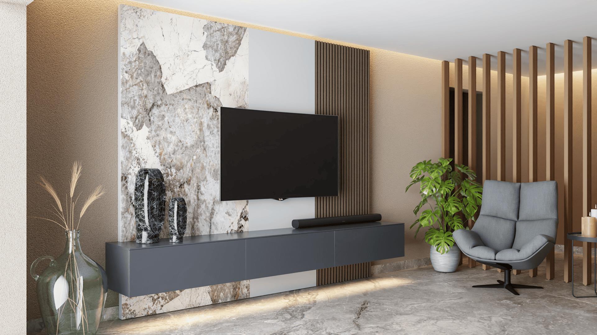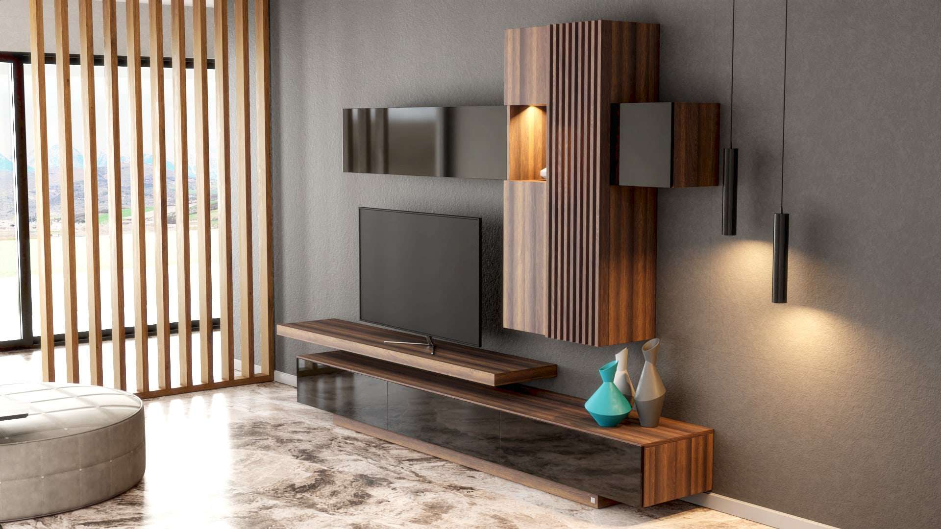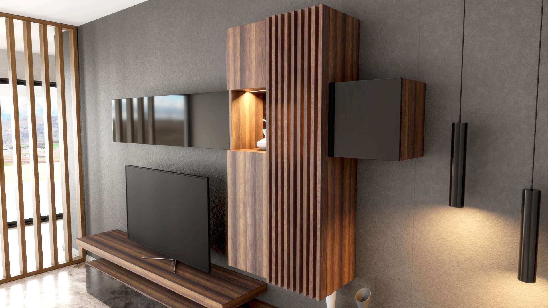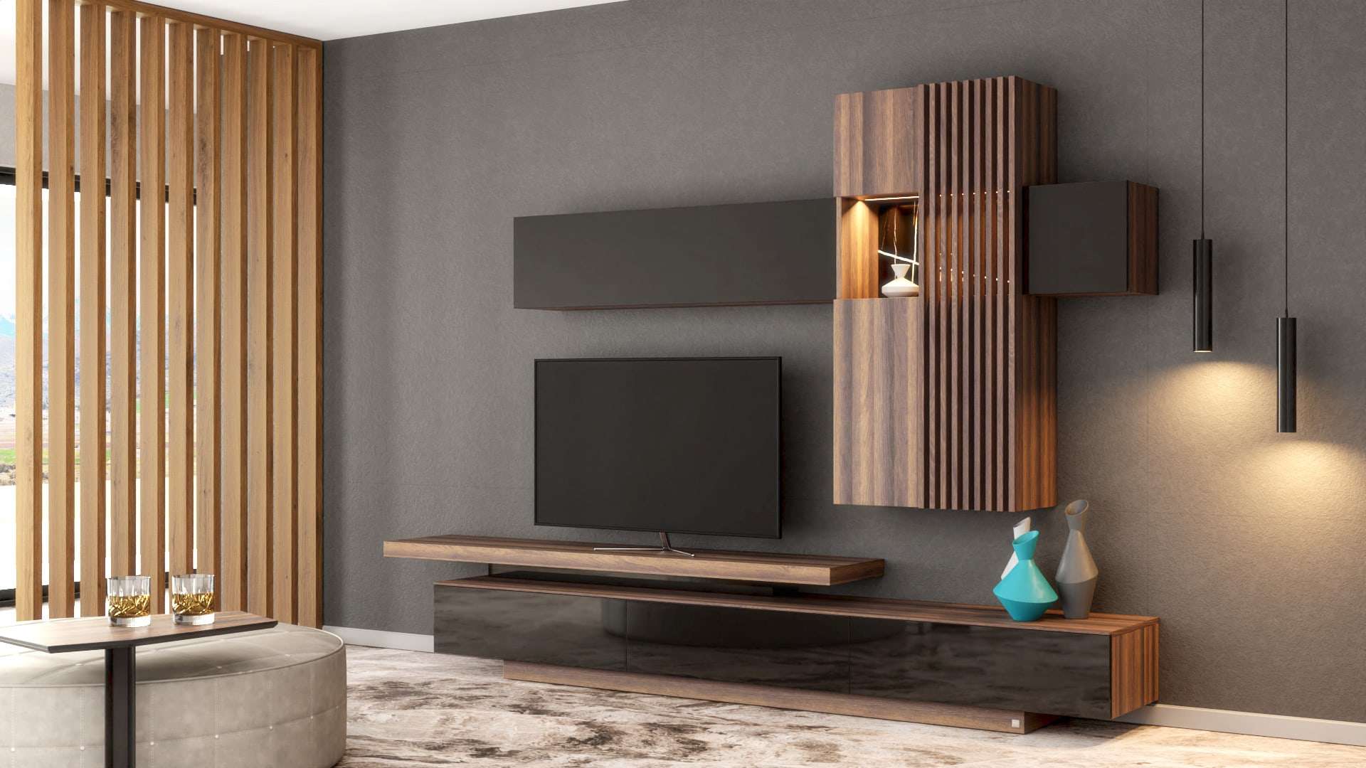 Ξύλο ευκαλύπτου και λάκα σε ένα modern minimal σχέδιο με μεγάλο αποθηκευτικό χώρο και διακριτικό κρυφό φωτισμό. Τη σύνθεση τοίχου Sempre την κατασκευάζουμε σε διαστάσεις, ξύλο και χρώμα λάκας προσαρμοσμένα στην αρχιτεκτονική του χώρου σας.