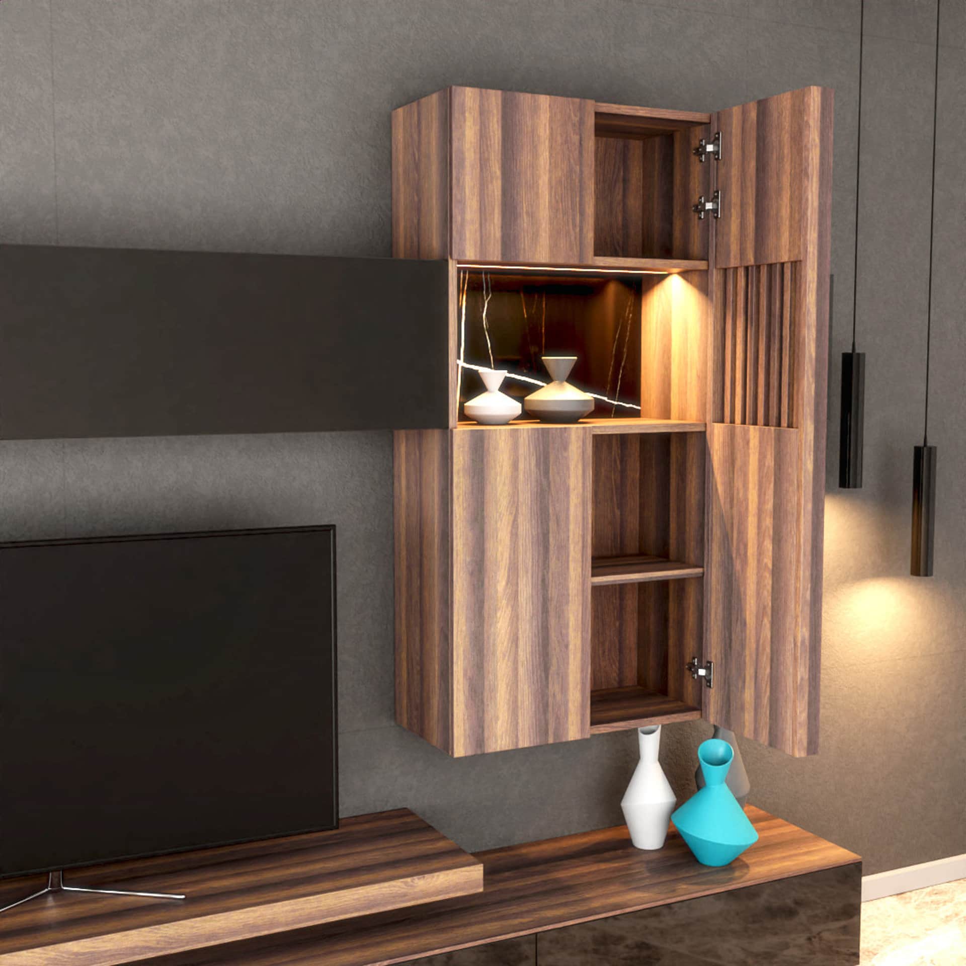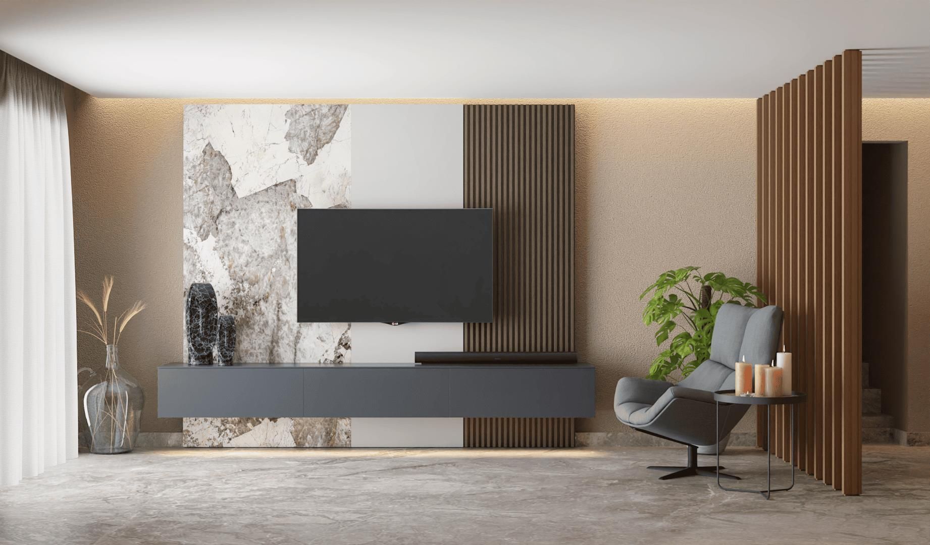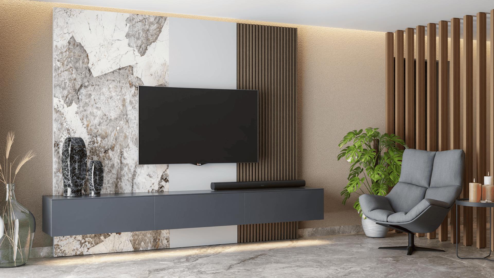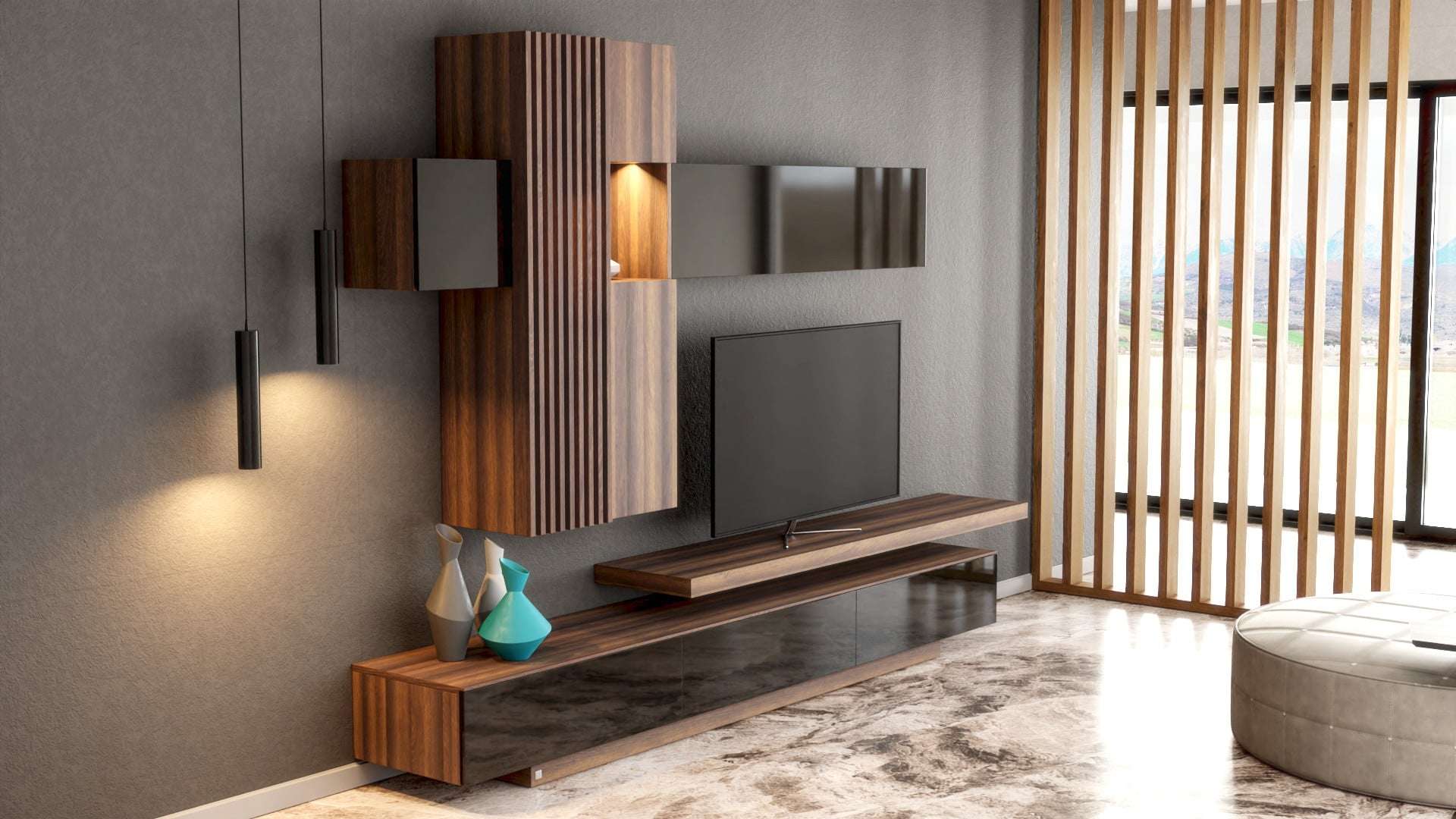 Ξύλο ευκαλύπτου και λάκα σε ένα modern minimal σχέδιο με μεγάλο αποθηκευτικό χώρο και διακριτικό κρυφό φωτισμό. Τη σύνθεση τοίχου Sempre την κατασκευάζουμε σε διαστάσεις, ξύλο και χρώμα λάκας προσαρμοσμένα στην αρχιτεκτονική του χώρου σας.
