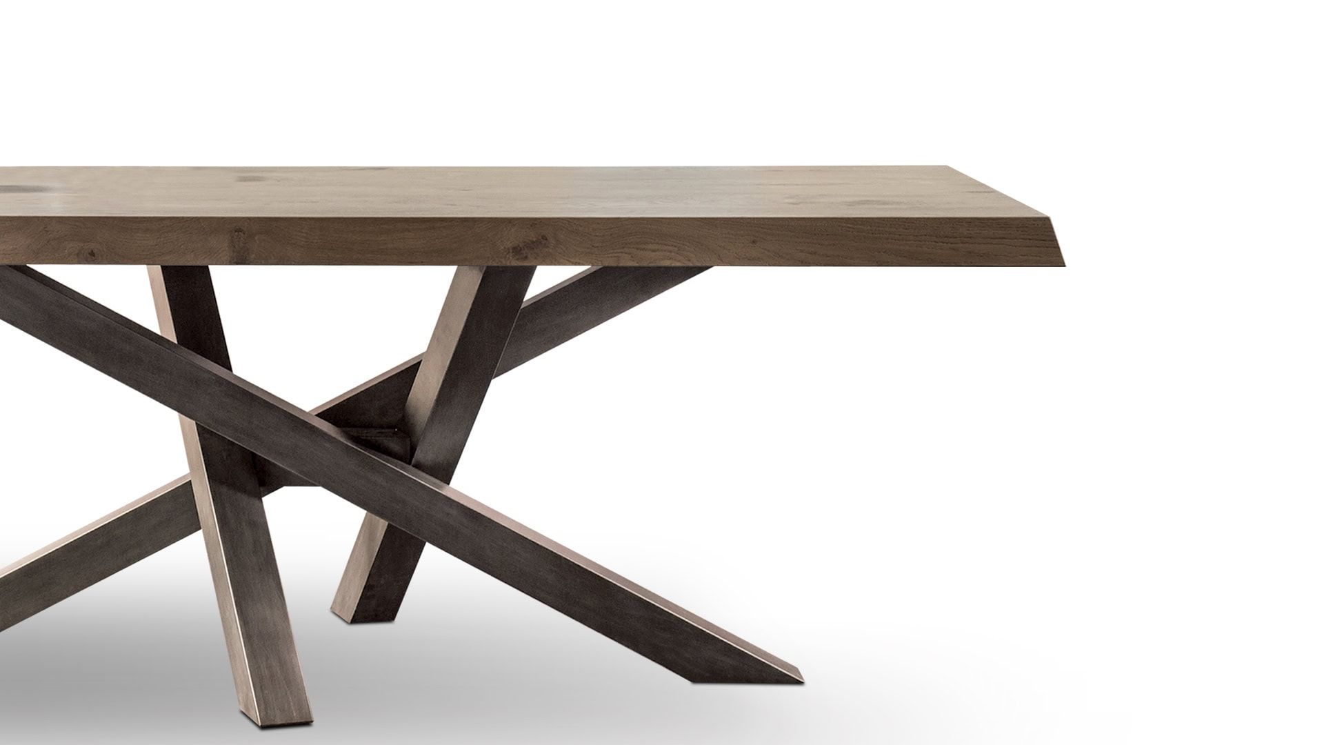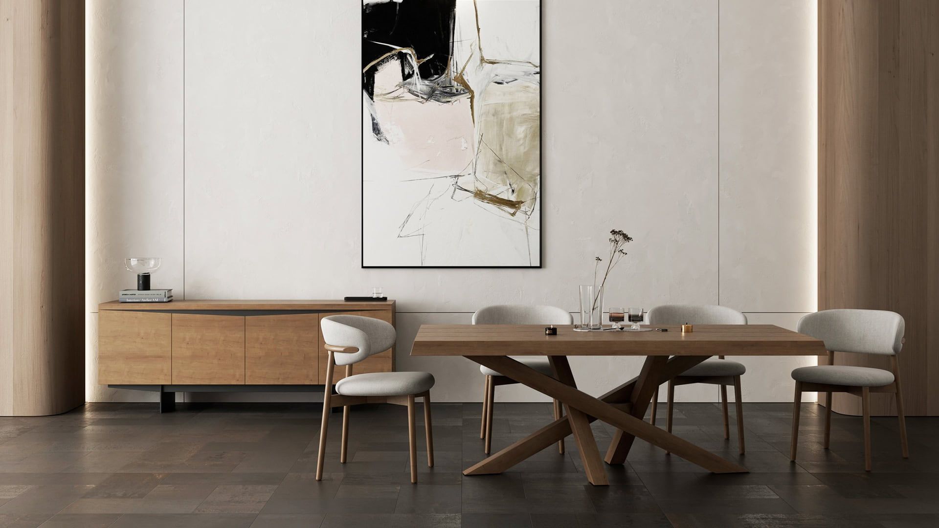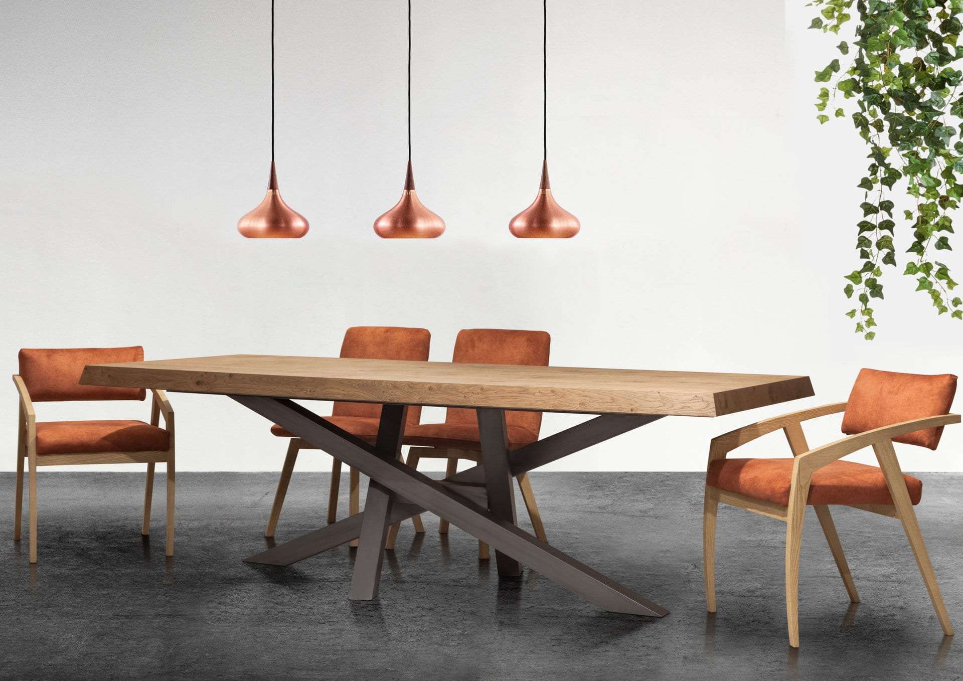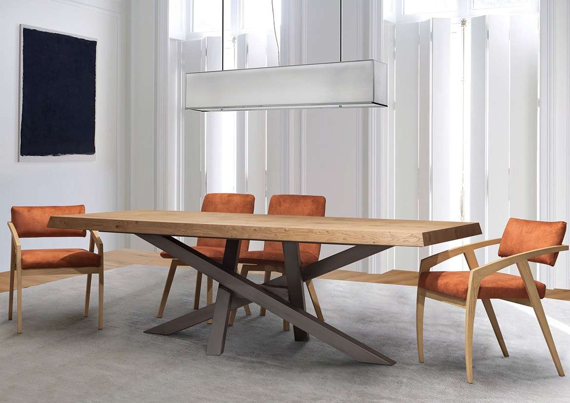 Μοντέρνα τραπεζαρία με ιδιαίτερη βάση βαμμένη με λάκα σε χρώματα τις επιλογής σας. Η τραπεζαρία Cross έχει ενσωματωμένο μηχανισμό προέκτασης 45cm.  Την κατασκευάζουμε σε διαστάσεις, ξύλο και χρώματα προσαρμοσμένα στο χώρο σας.
