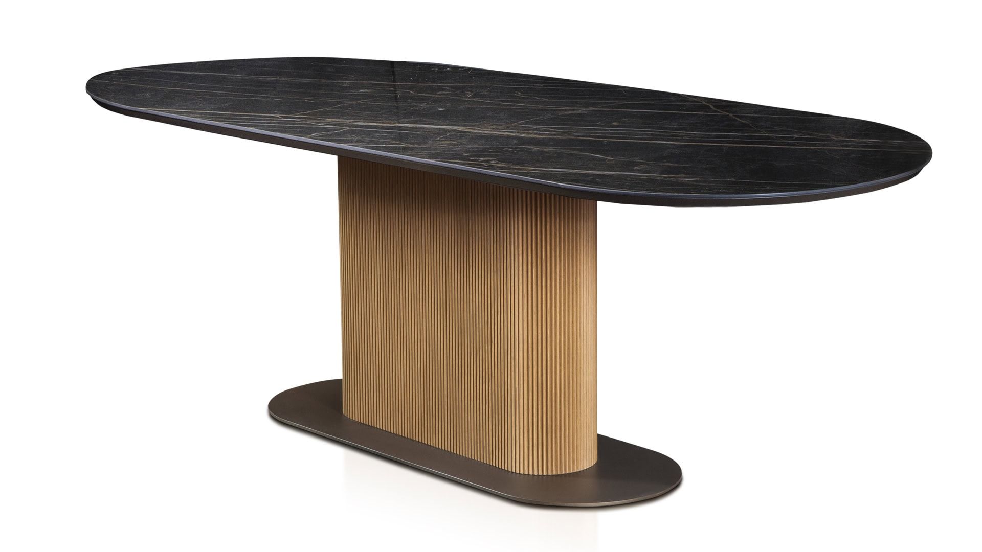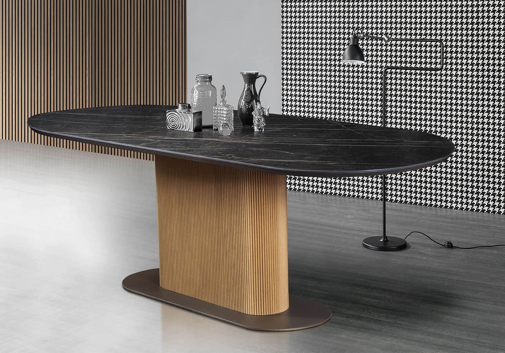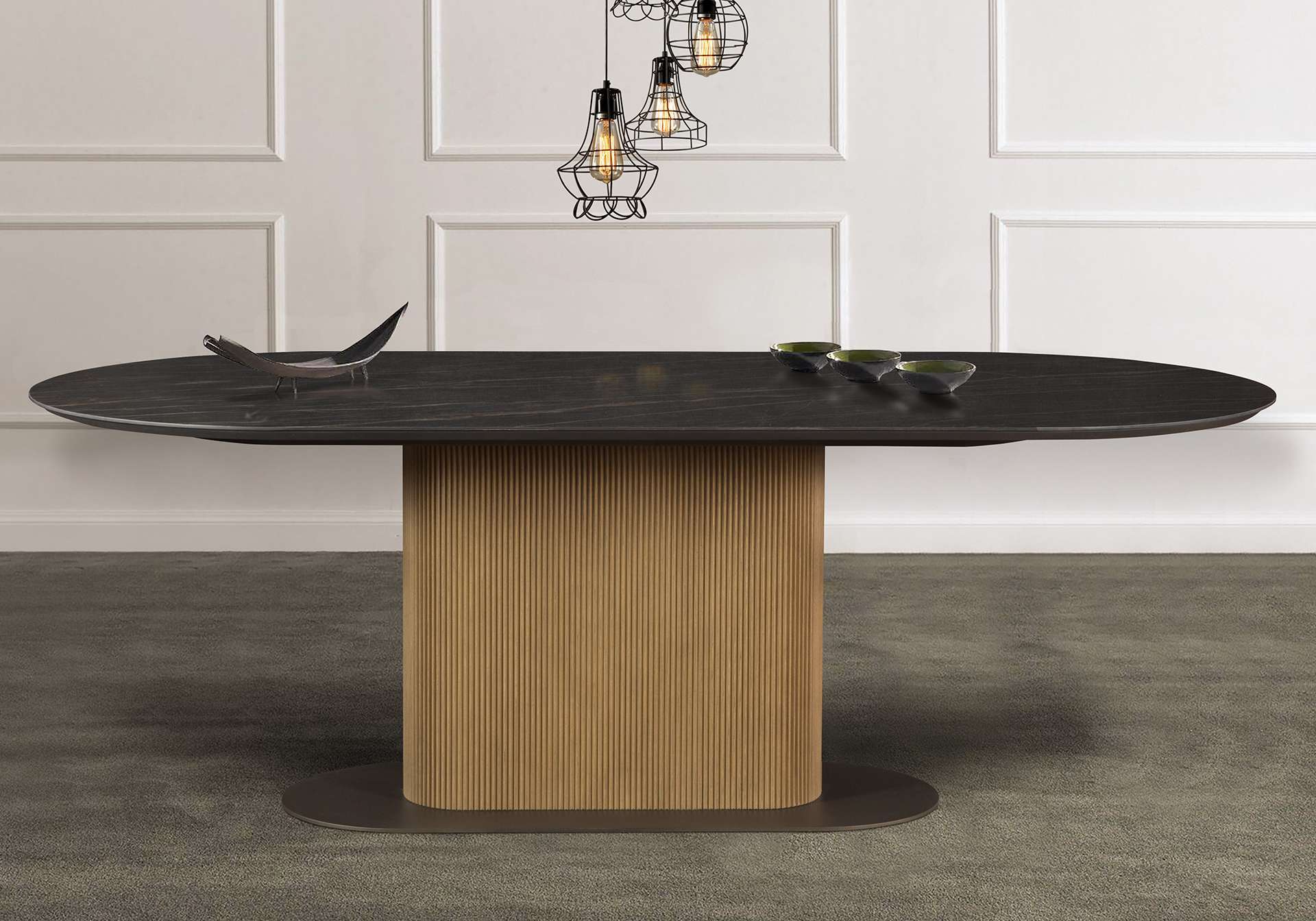 Κεραμική τραπεζαρία με κεντρικη ξύλινη βάση με εύκαμπτο μασίφ ξύλο δρυς. Κεραμική επιφάνεια σε ματ και γυαλιστερές αποχρώσεις. Την κατασκευάζουμε σε διαστάσεις και χρώματα της αρεσκείας σας.