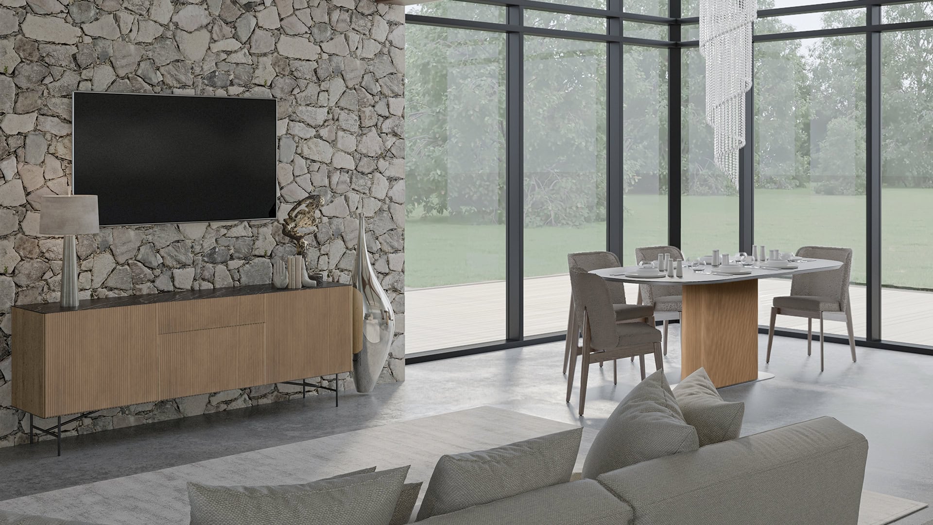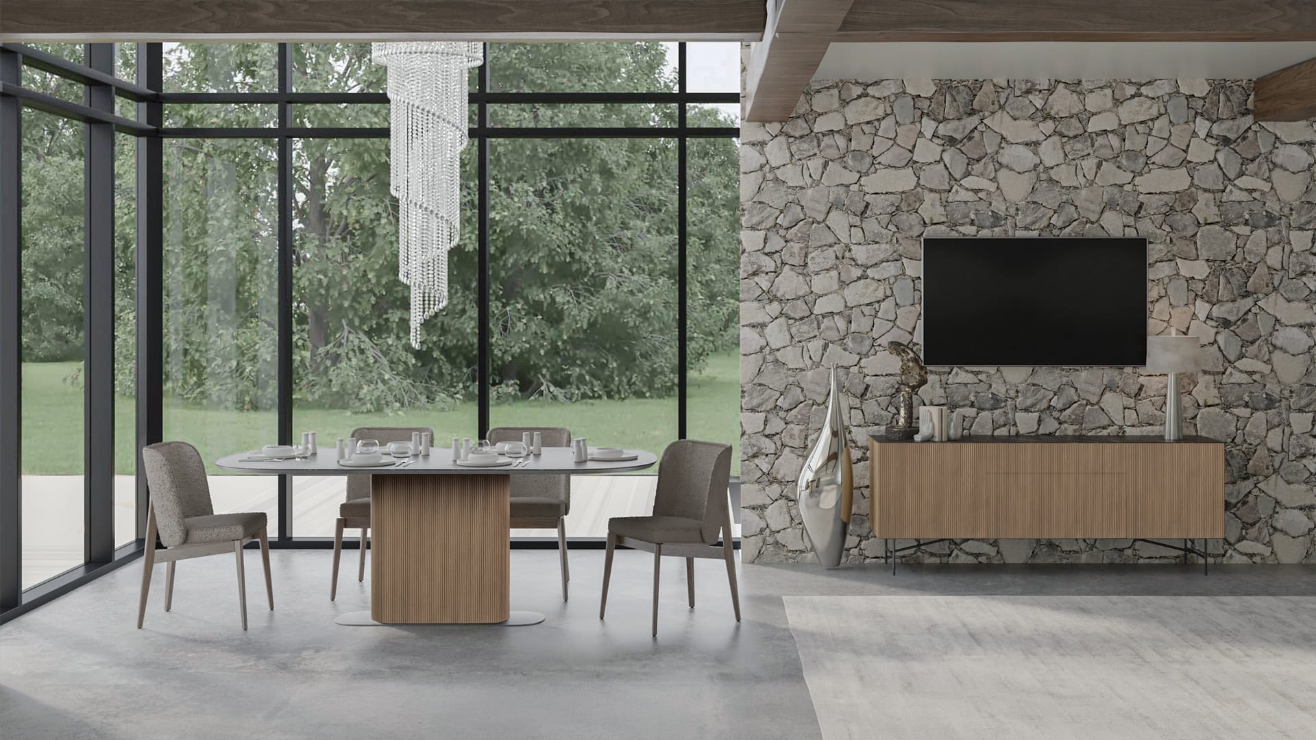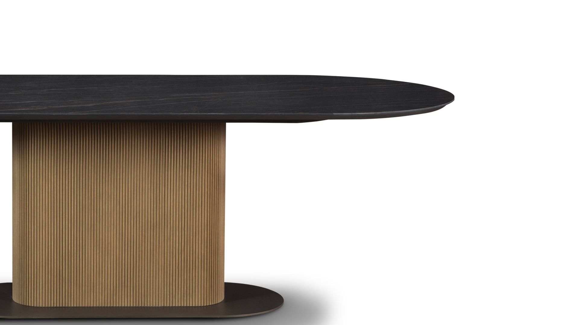 Κεραμική τραπεζαρία με κεντρικη ξύλινη βάση με εύκαμπτο μασίφ ξύλο δρυς. Κεραμική επιφάνεια σε ματ και γυαλιστερές αποχρώσεις. Την κατασκευάζουμε σε διαστάσεις και χρώματα της αρεσκείας σας.