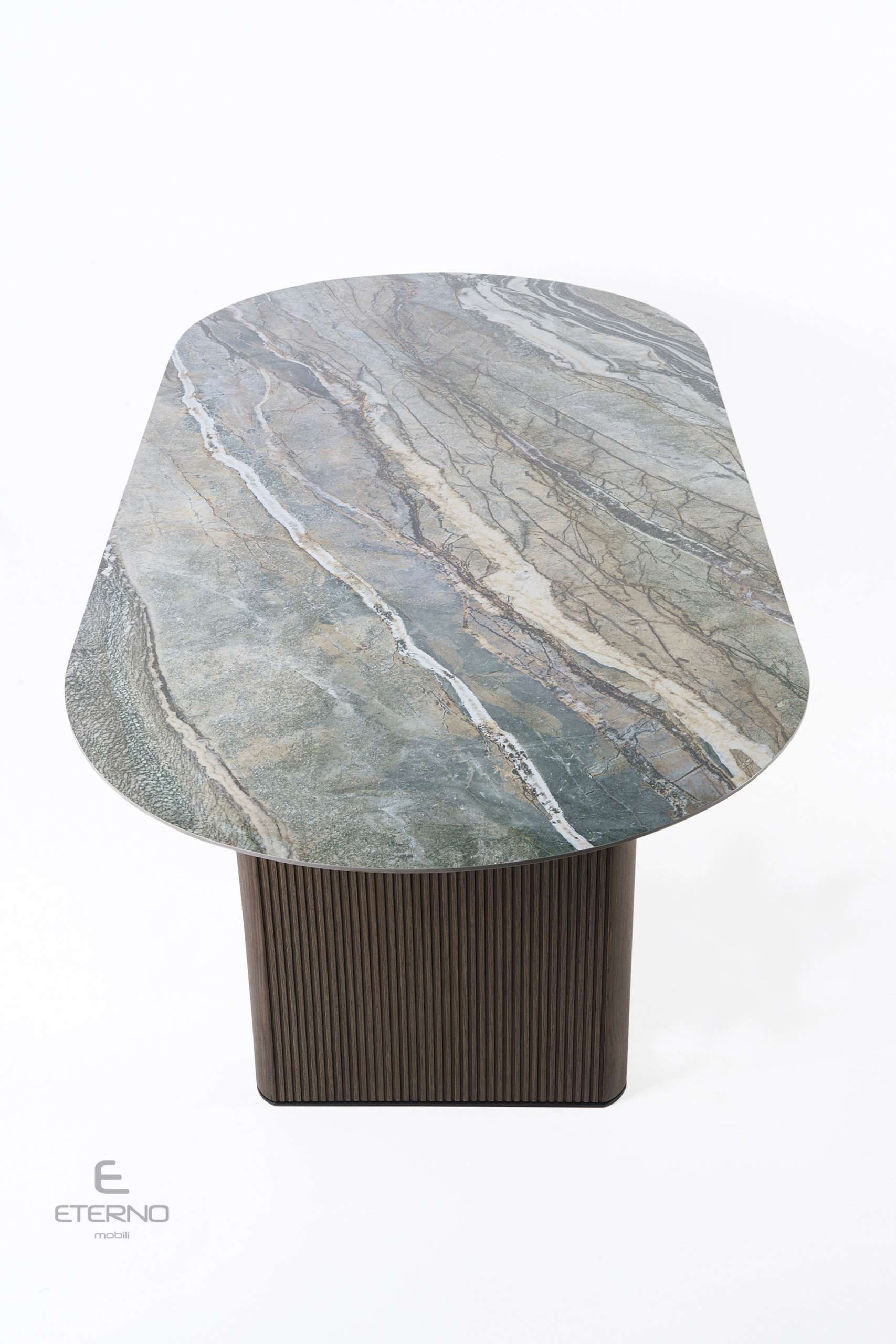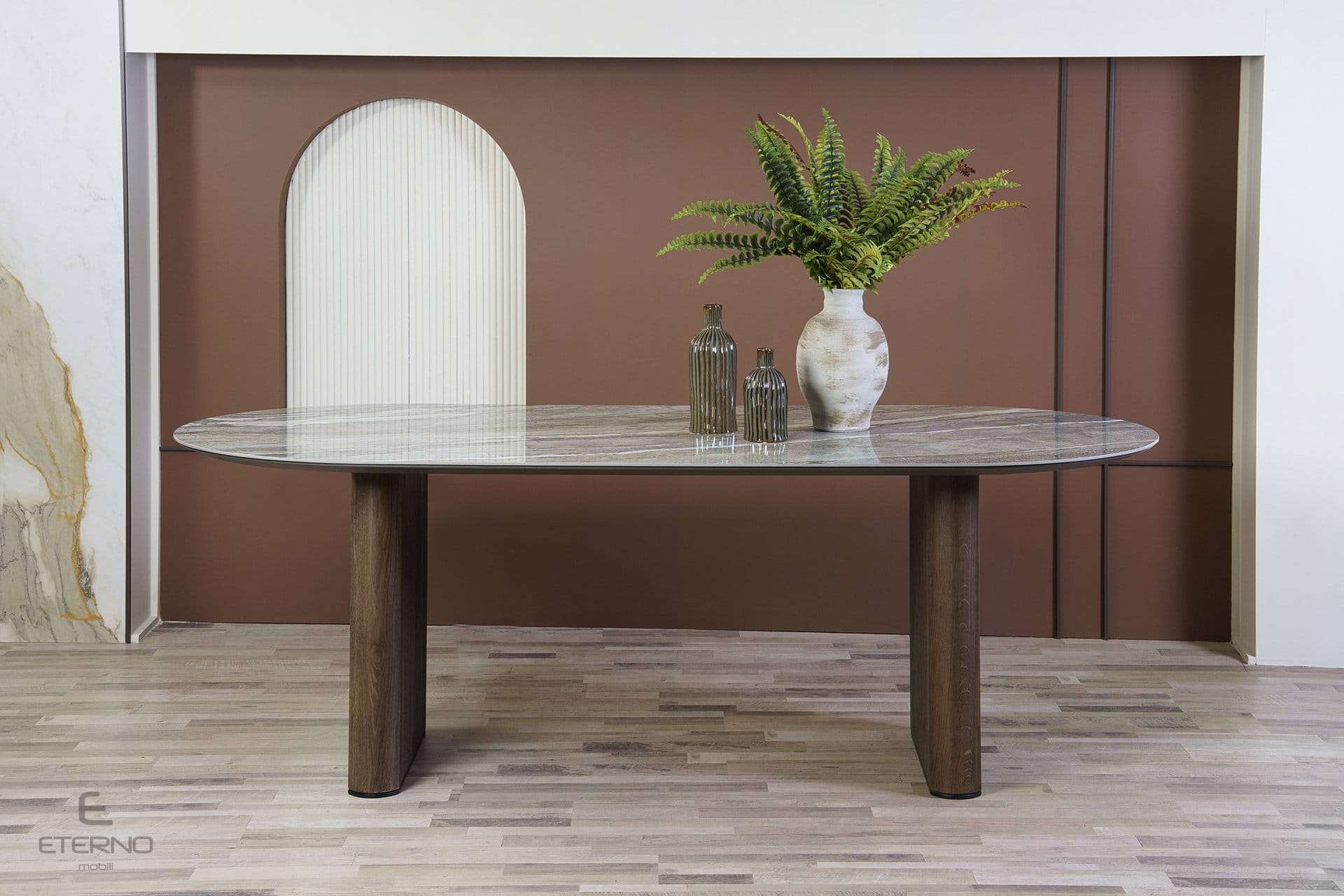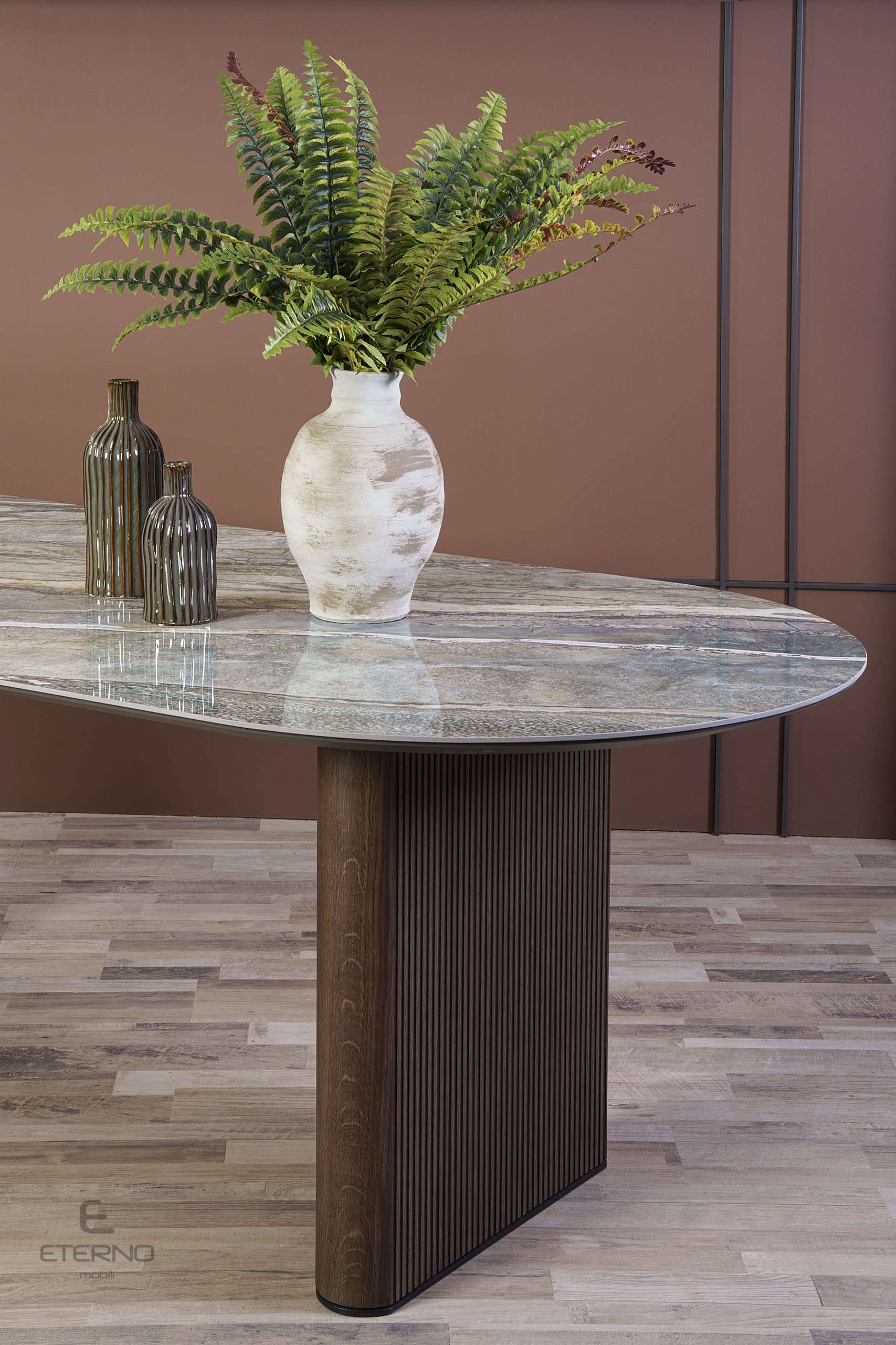 Τραπεζαρία Icon Ceramic. Ελληνικής κατασκευής. Καπάκι ίσιο με κυκλικές άκρες Υλικά κατασκευής: Κεραμική Επιφάνεια σε συνδυασμό με λάκα ματ και ξύλινα πόδια. Διάσταση: 180cm x 100cm x 76cm Δυνατότητα αλλαγών.
