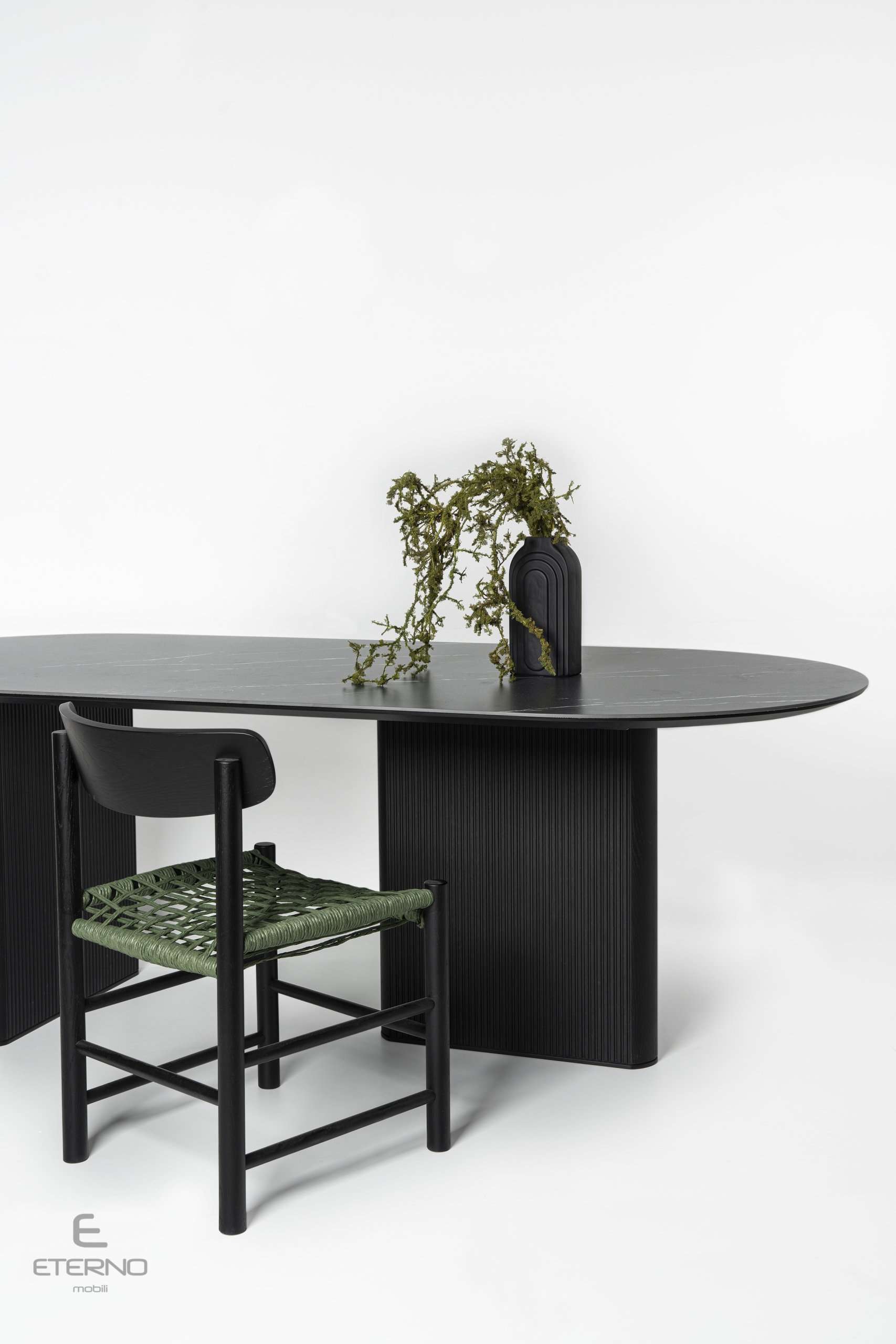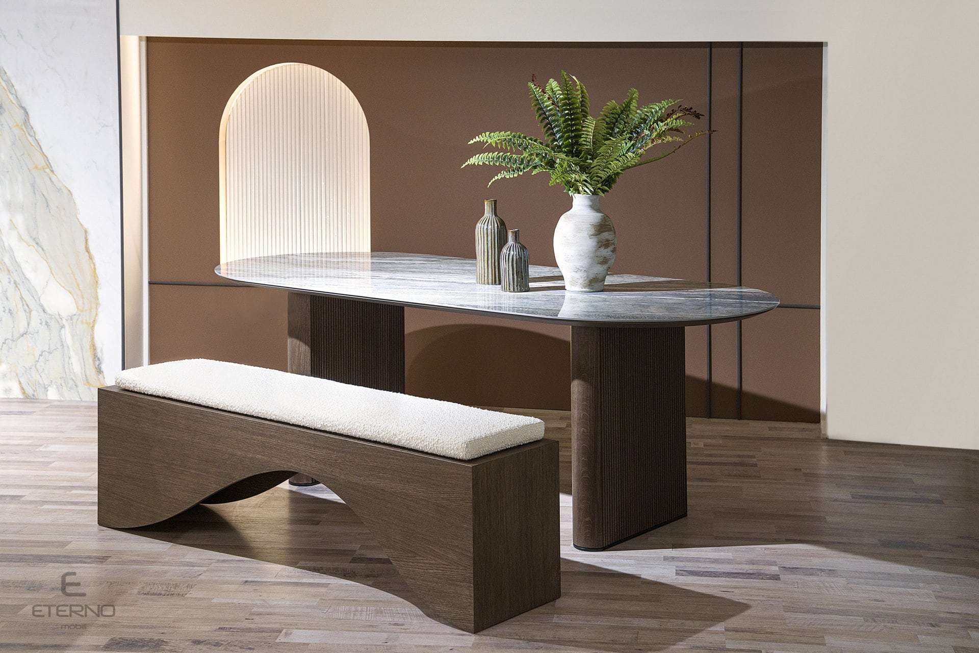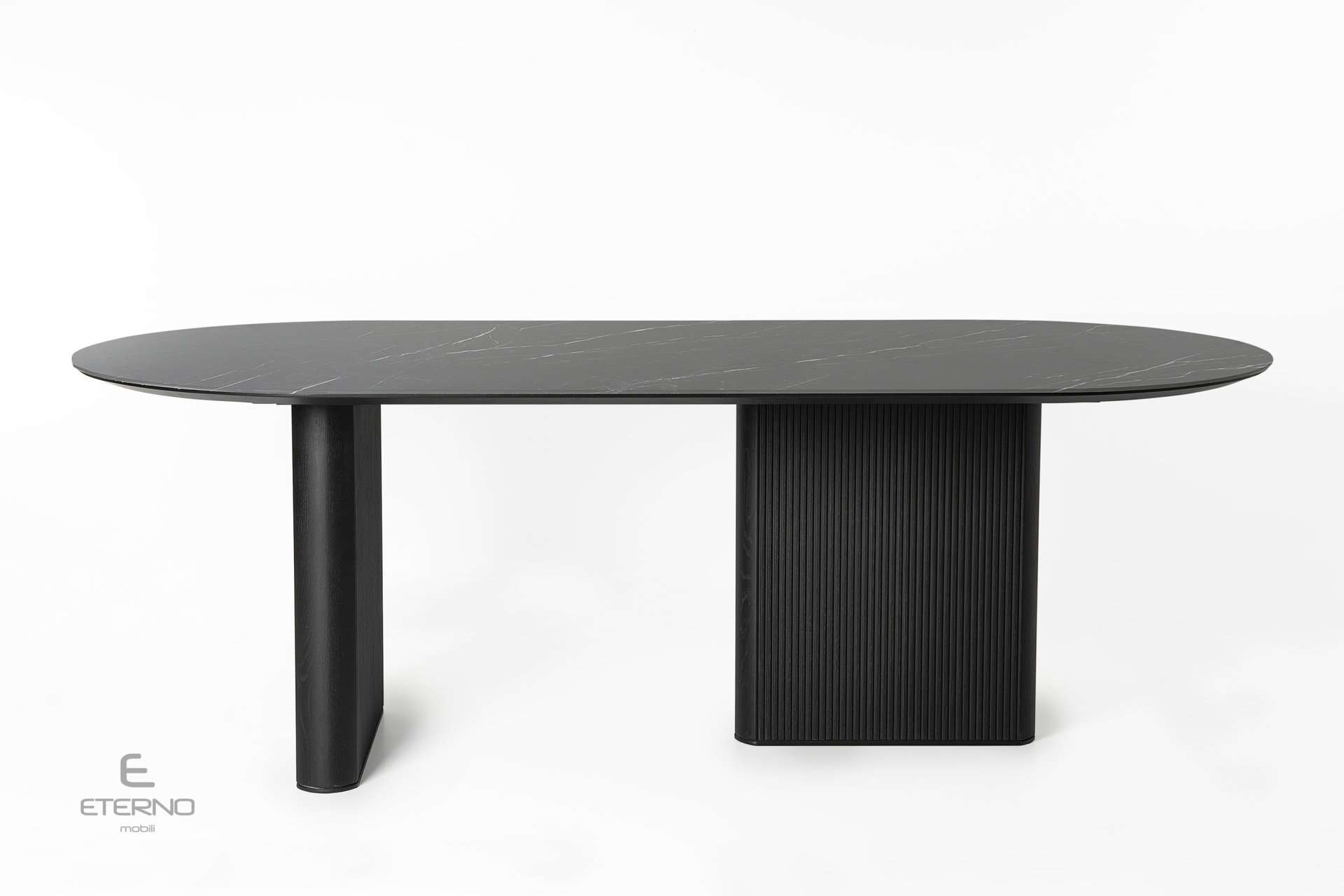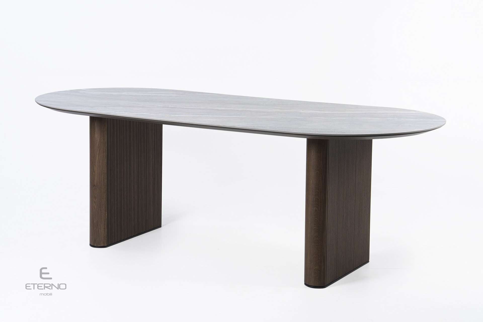 Τραπεζαρία Icon Ceramic. Ελληνικής κατασκευής. Καπάκι ίσιο με κυκλικές άκρες Υλικά κατασκευής: Κεραμική Επιφάνεια σε συνδυασμό με λάκα ματ και ξύλινα πόδια. Διάσταση: 180cm x 100cm x 76cm Δυνατότητα αλλαγών.