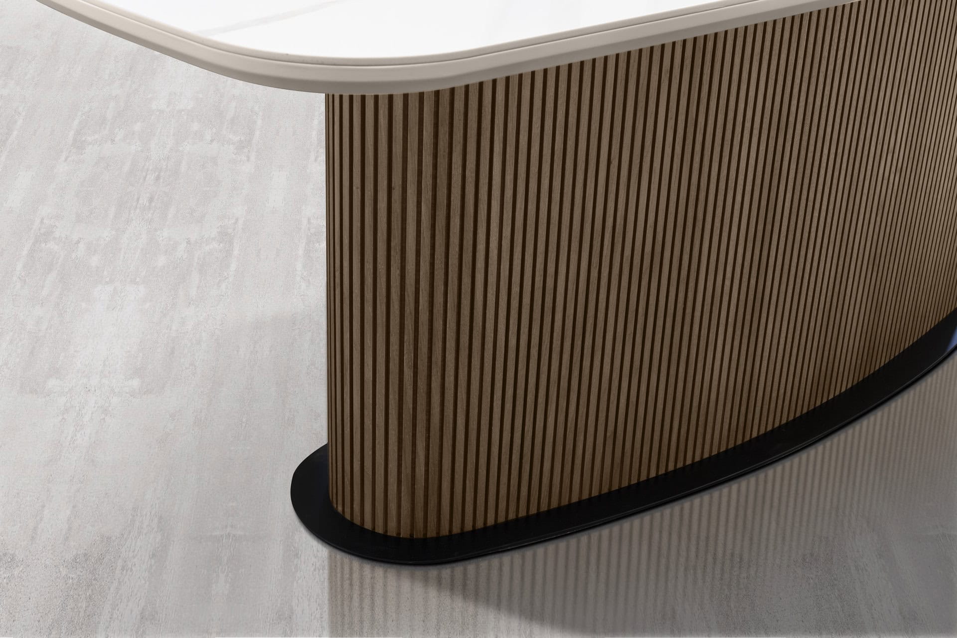 Τραπεζαρία T17 Κεραμική Ξύλο: Δρυς Μασίφ Επιφάνεια: Κεραμική Διαστάσεις: 200cm x 100cm x 77cm Κεραμική επιφάνεια στο καπάκι και μασιφένια ξύλινη βάση, σε ένα μοντέρνο σχέδιο που προσδίδει δυναμική και διακοσμητική ισορροπία στο χώρο. Την κατασκευάζουμε σε διαστάσεις και χρώματα προσαρμοσμένα στο χώρο σας. Δυνατότητα αλλαγών.