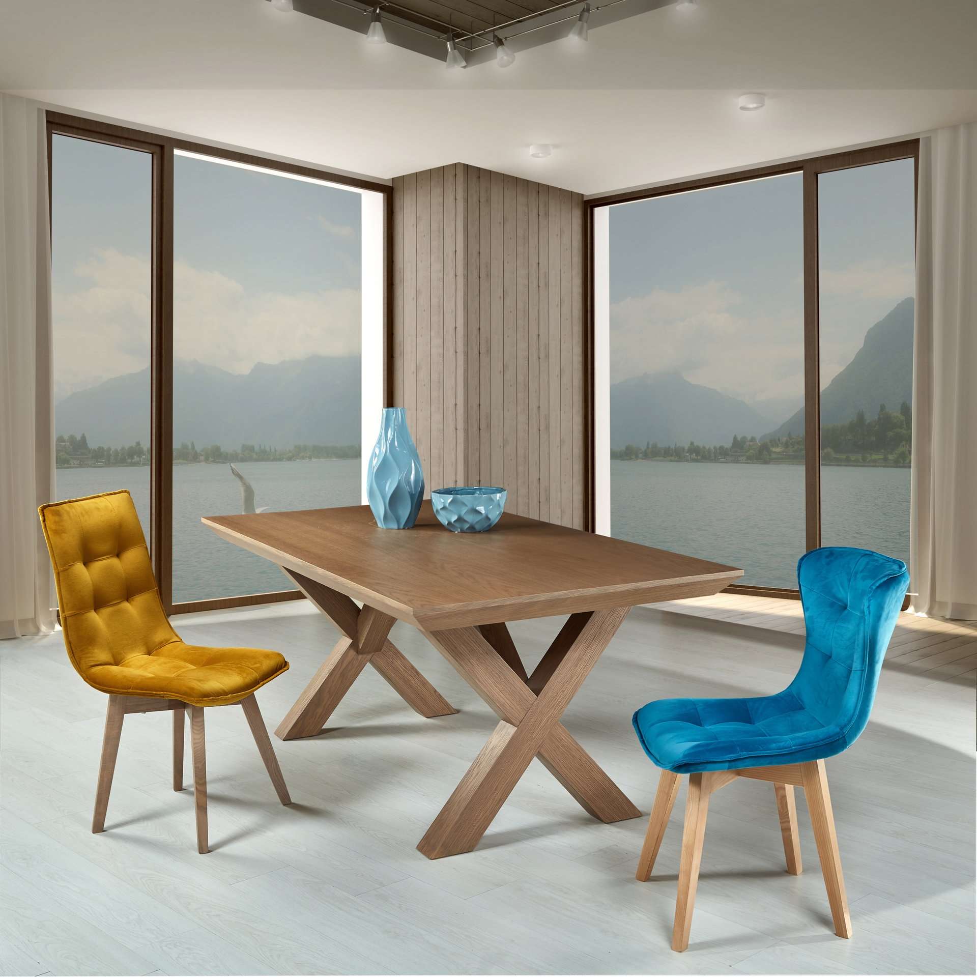 Η τραπεζαρία Velvet αντιπροσωπεύει πλήρως την απλότητα του minimal design. Κερδίζει, βέβαια την προσοχή μέσα στη λιτότητα της, χάρη στη ζεστασιά και την οικειότητα που της προσδίδει το φυσικό ξύλο. Τα στιβαρά χιαστί πόδια της, συμπληρώνουν ιδανικά το στυλ της και δίνουν τον μοντέρνο τόνο που χρειάζεται κάθε σύγχρονος χώρος.