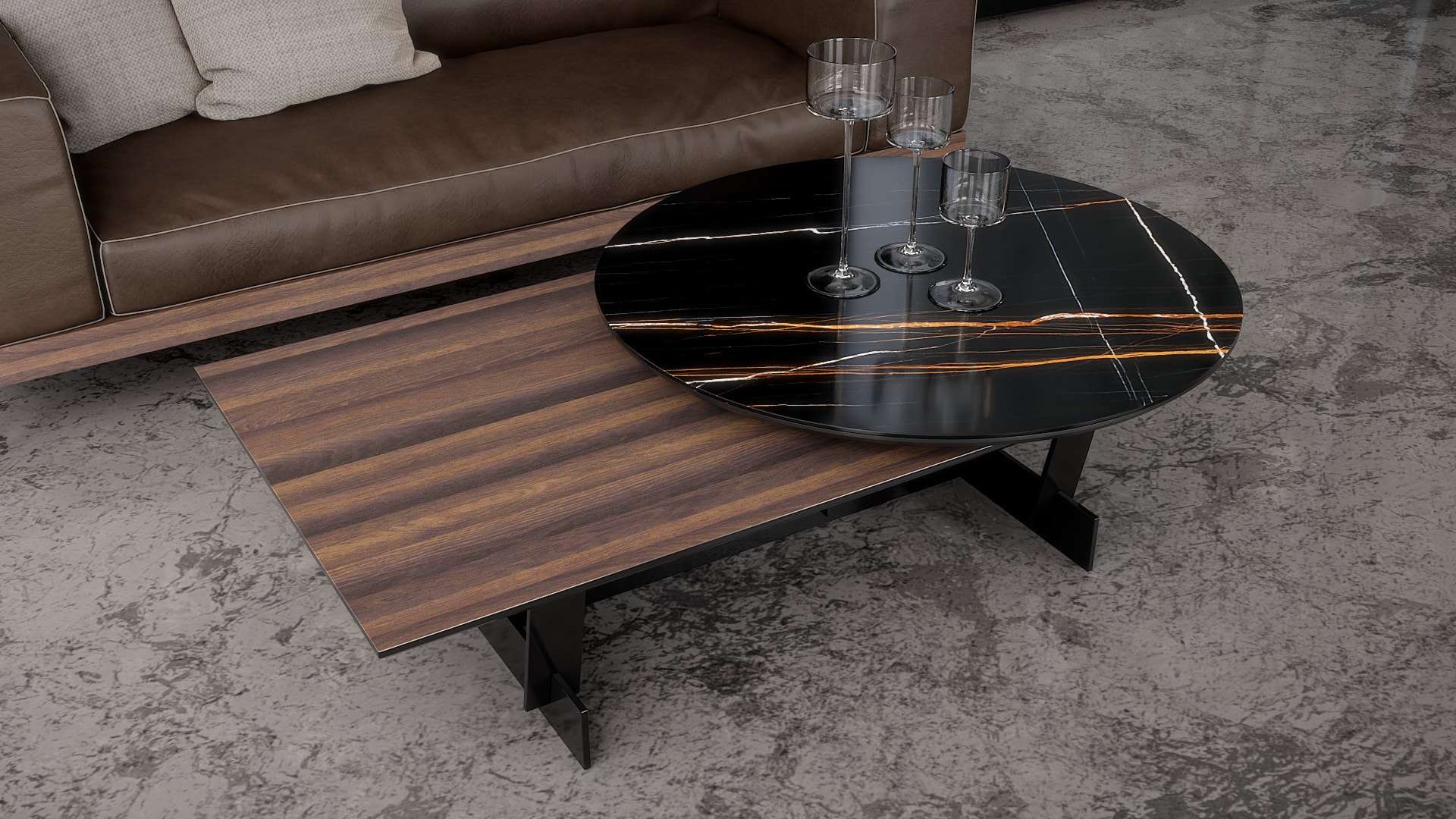 Ξύλο δρυς και κεραμικό σε ένα elegant σχέδιο που ταιριάζει σε κάθε χώρο. Εξίσου όμορφο με ξύλο δρυ σε δύο αποχρώσεις. Το στρογγυλό καπάκι μετακινείται και έτσι το τραπεζάκι μεγαλώνει για να μπορεί να εξυπηρετήσει περισσότερα άτομα. Ευχρηστία, λειτουργικότητα και απαράμιλλη φινέτσα. Το τραπεζάκι το κατασκευάζουμε σε διαστάσεις, υλικά και συνδυασμούς χρωμάτων της επιλογής σας.