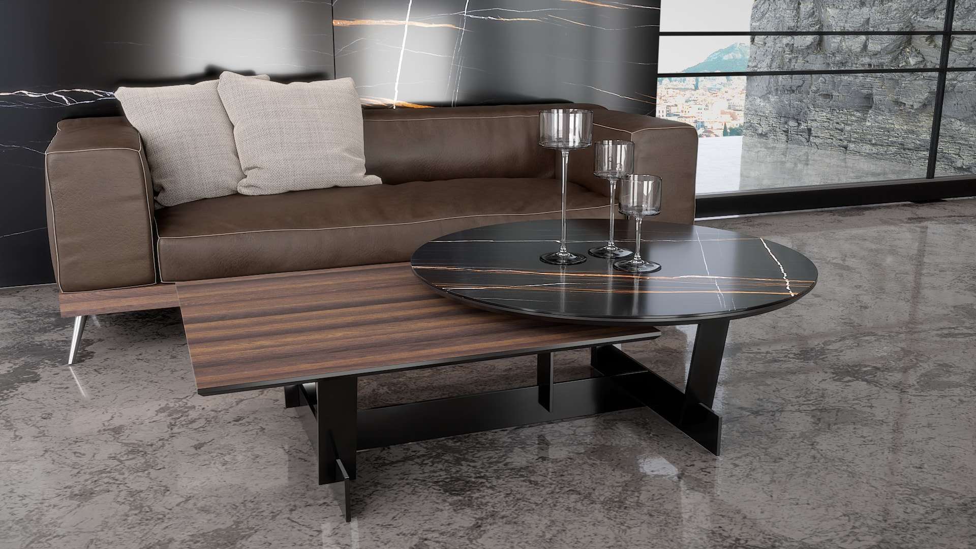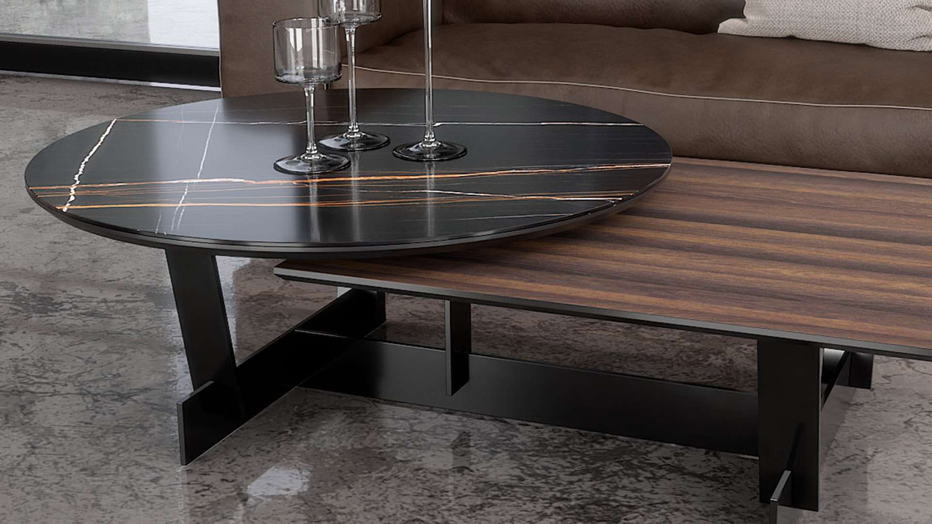 Τραπέζι σαλονιού Double metal. Ελληνικής Κατασκευής. Ξύλο Δρυος και περιστρεφόμενο ξύλινο καπάκι κεραμικό Μεταλλική βάση Διαστάσεις: 150cm x 100cm x 42cm Δυνατότητα αλλαγών.