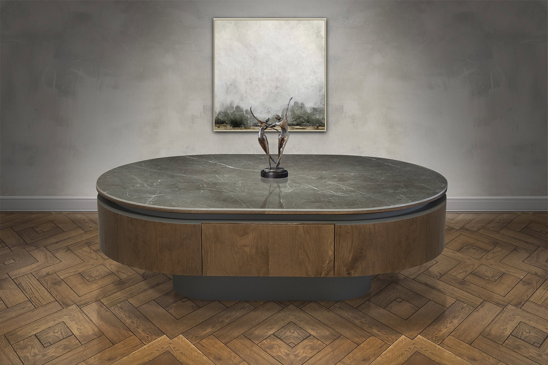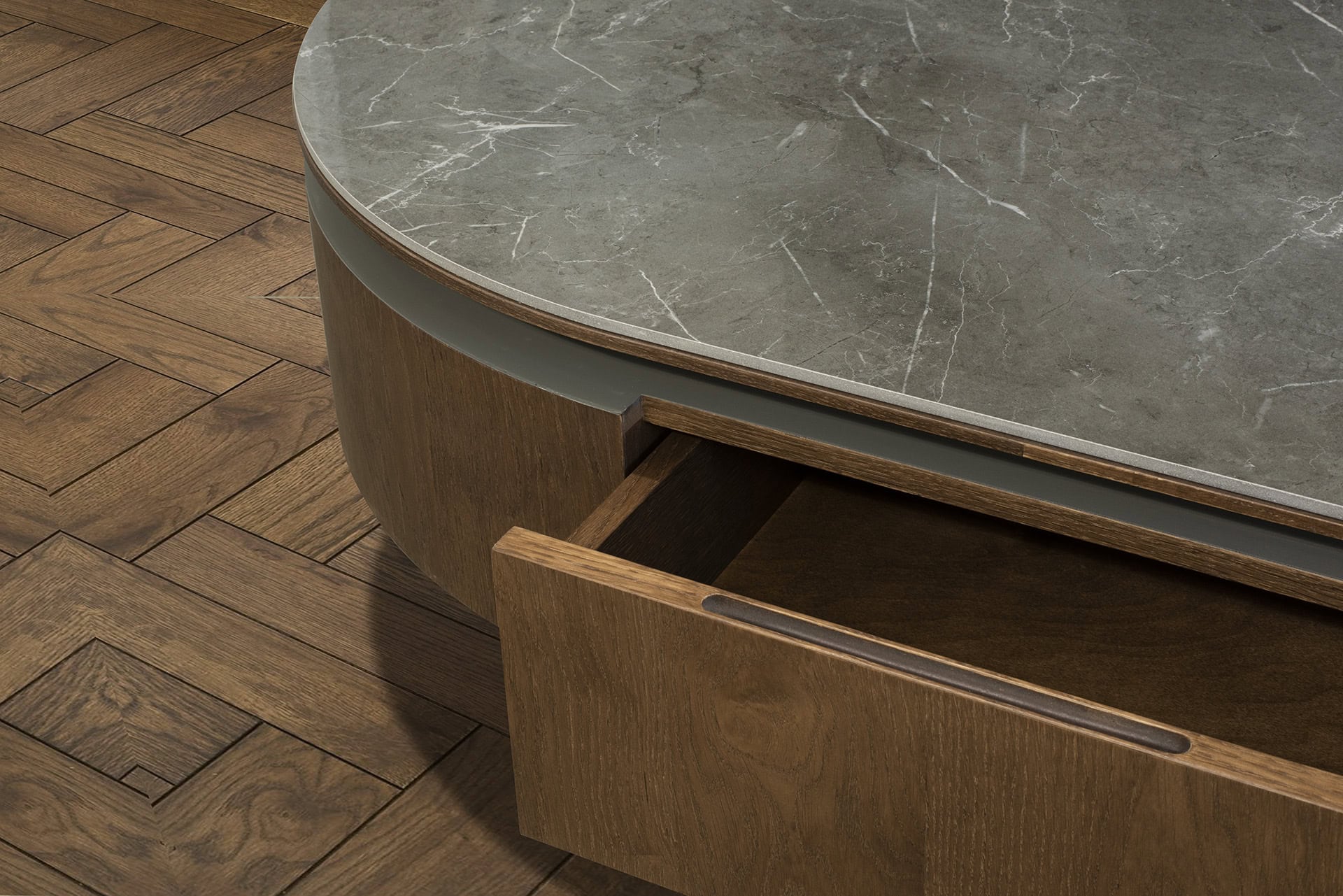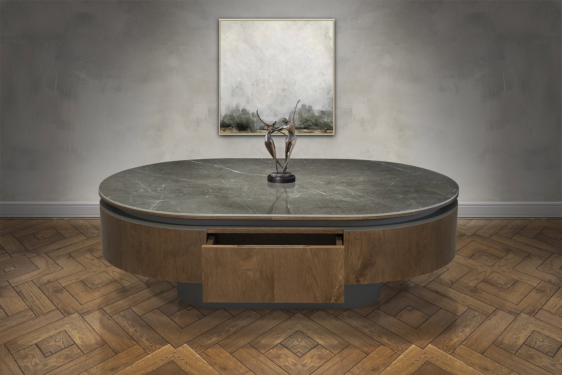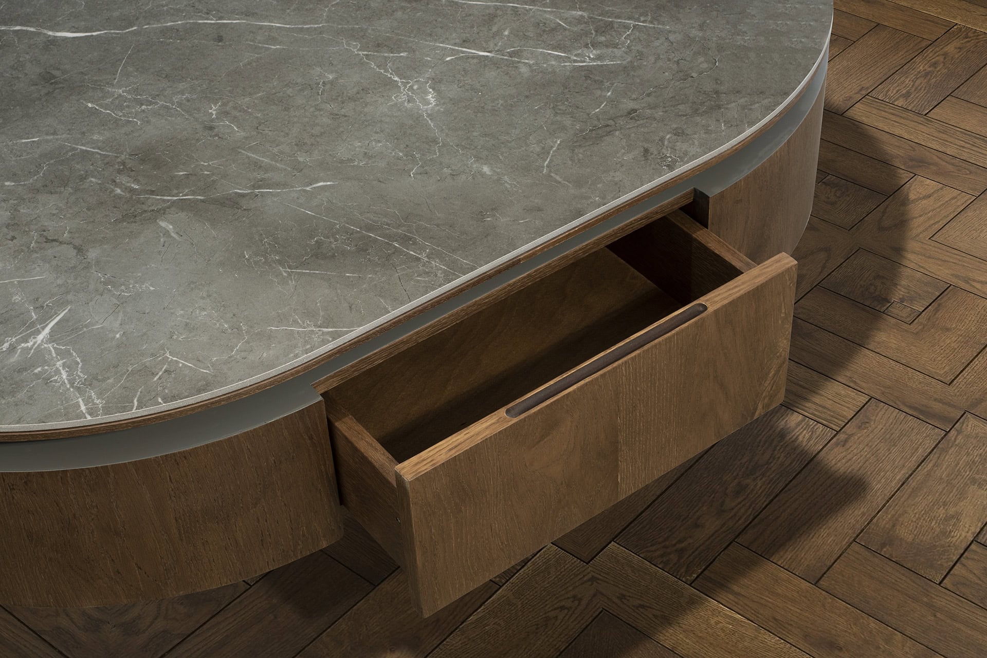 Τραπεζάκι σαλονιού με εύκαμπτο μασίφ ξύλο, δρυ και επιφάνεια κεραμική . Διαθέτει κρυφό συρτάρι για αποθήκευση.Το τραπέζι σαλονιού N95 το κατασκευάζουμε σε διαστάσεις, χρώματα και υλικά της επιλογής σας.